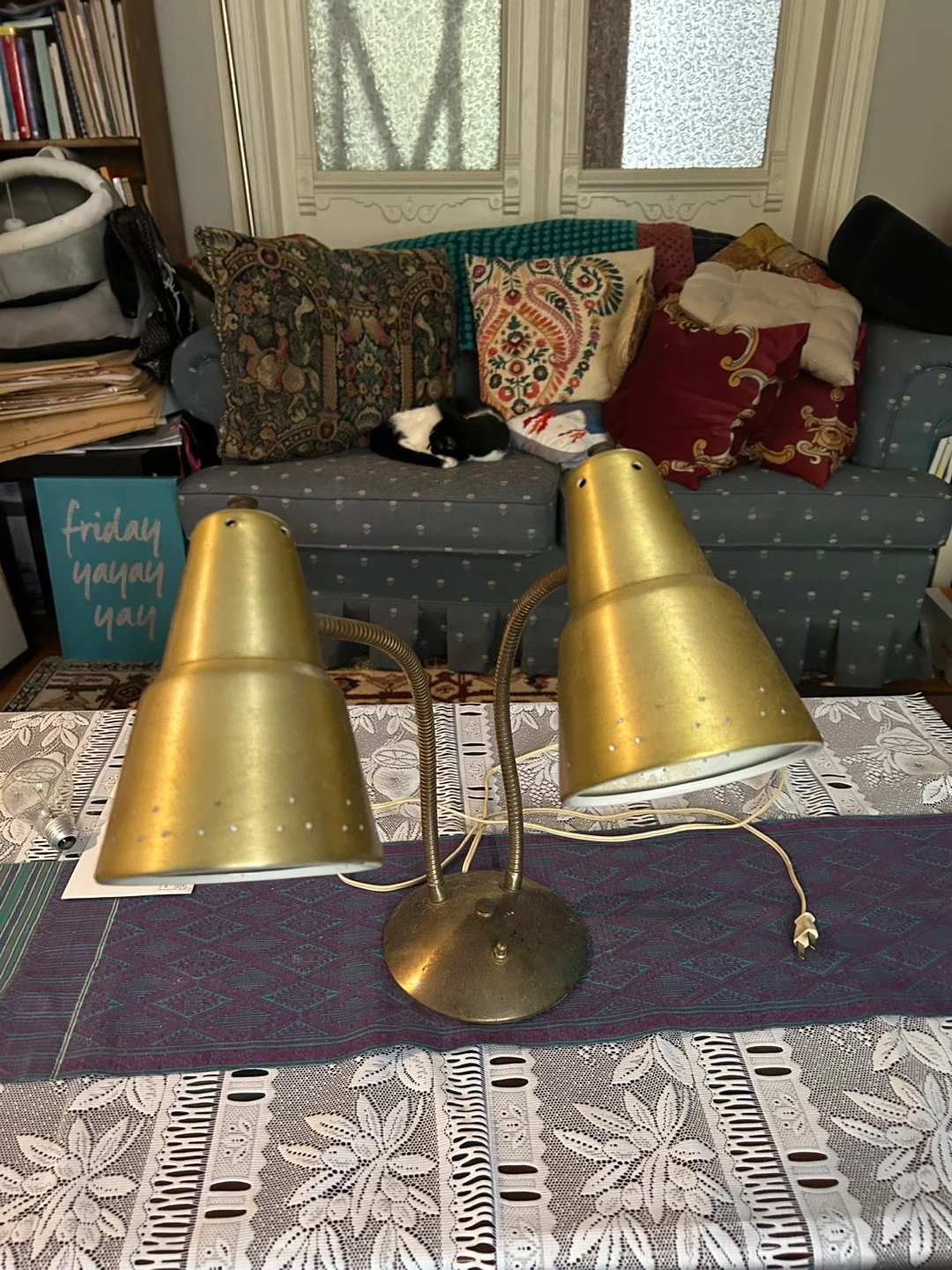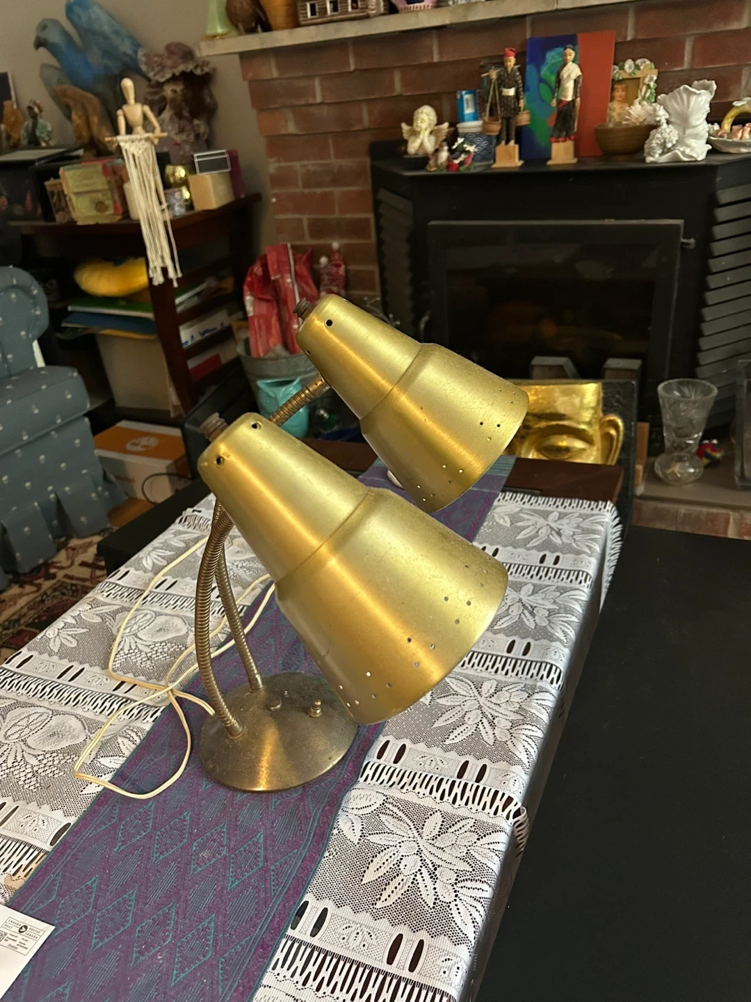 Selling a vintage brass double desk lamp. It has a lovely mid-century modern look. Perfect for a desk or side table, it adds a touch of retro charm to any room. It's in good condition and ready to brighten up your space!