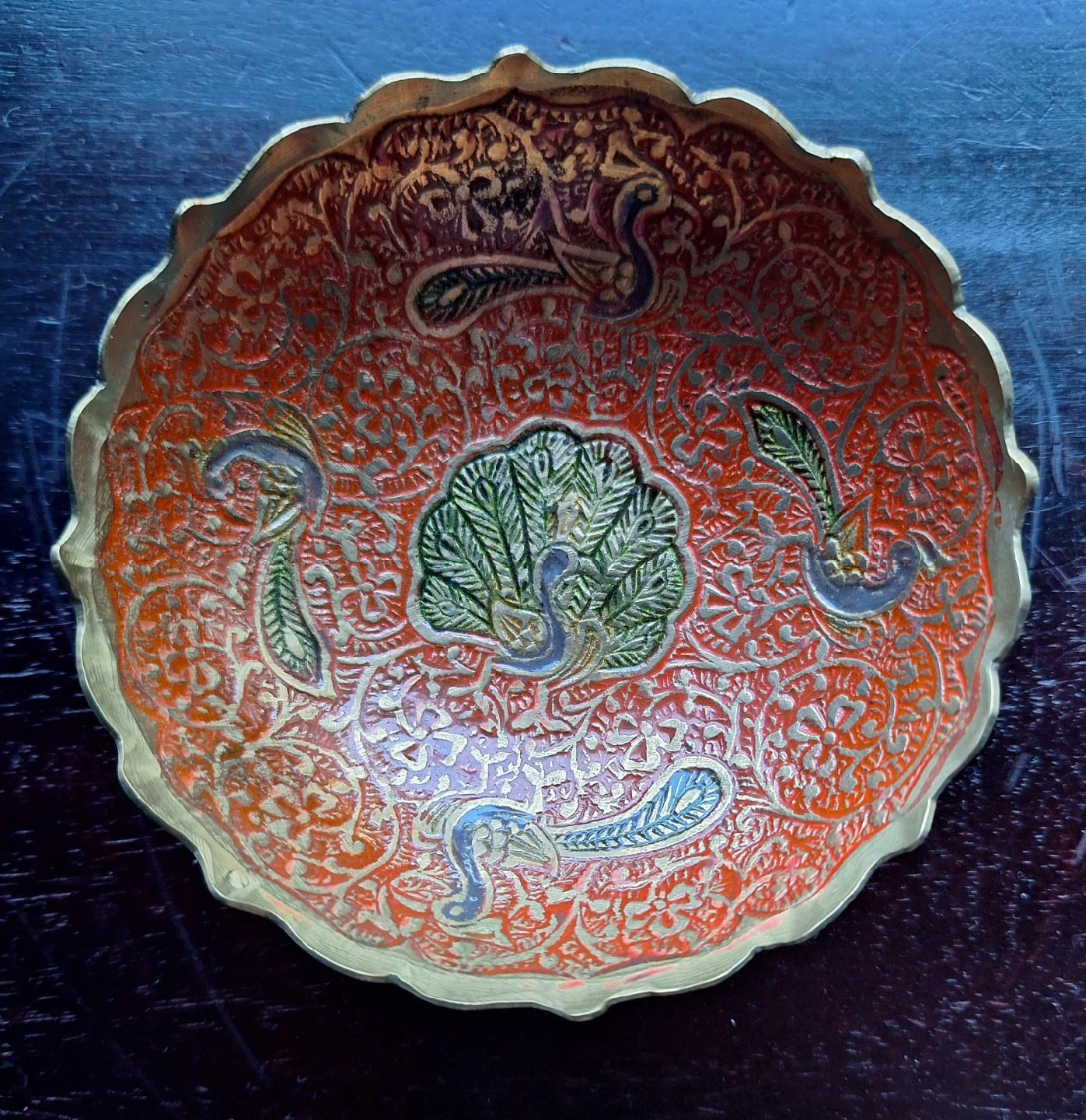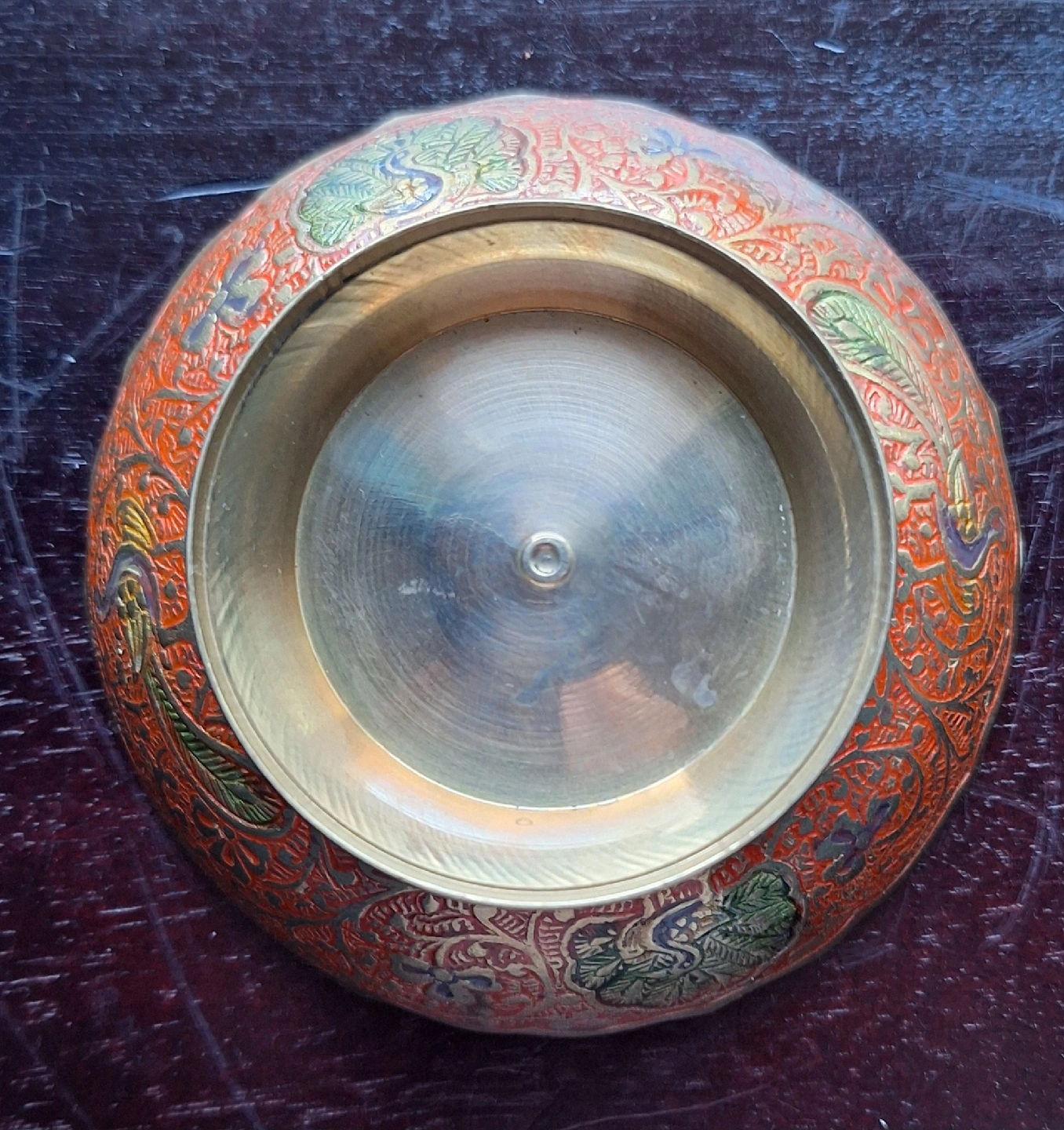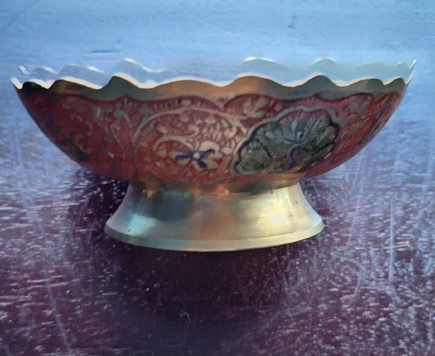 Beautiful vintage brass bowl brass with enamel, scalloped rim. Pickok design. Diameter 4 5 inches