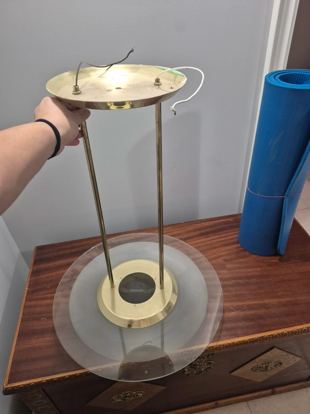 Selling a vintage pendant light fixture with a brass and glass design. It's a unique piece that would add a touch of retro charm to any room. The fixture features a clear glass shade and brass accents. Perfect for a dining room, living room, or entryway. Had mine in entryway... second pic is the bottom of it