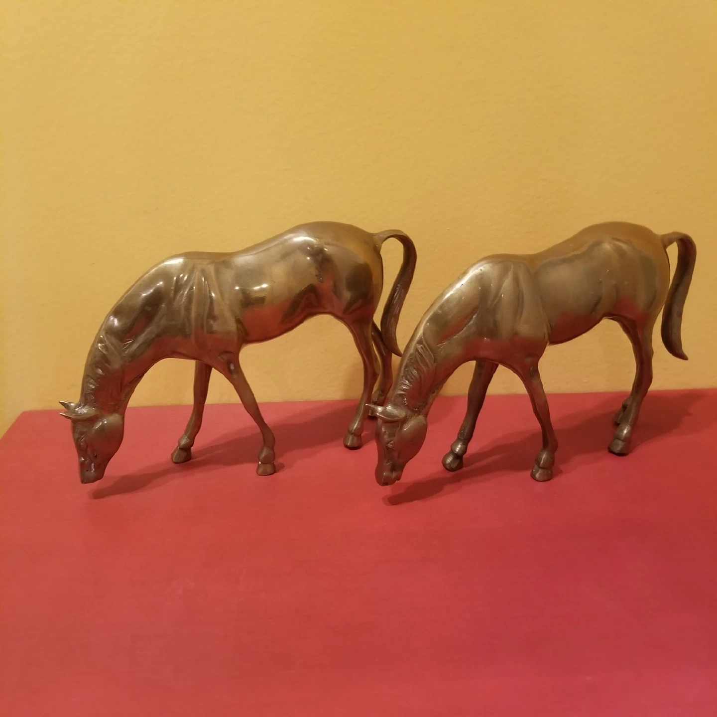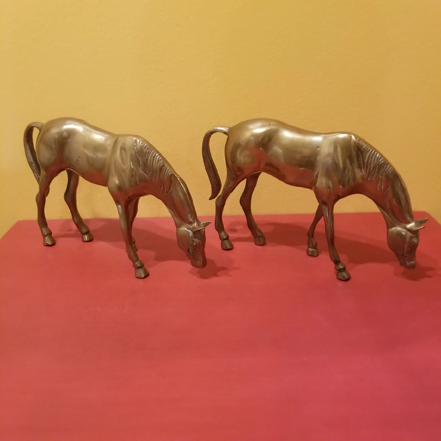 124Selling a pair of vintage brass horse figurines! They are in great shape and would look lovely on a shelf or desk. Perfect for any horse lover or collector! Size: 8" long and 5 1/2" high. My price $ 35,- each or $ 50,- for two