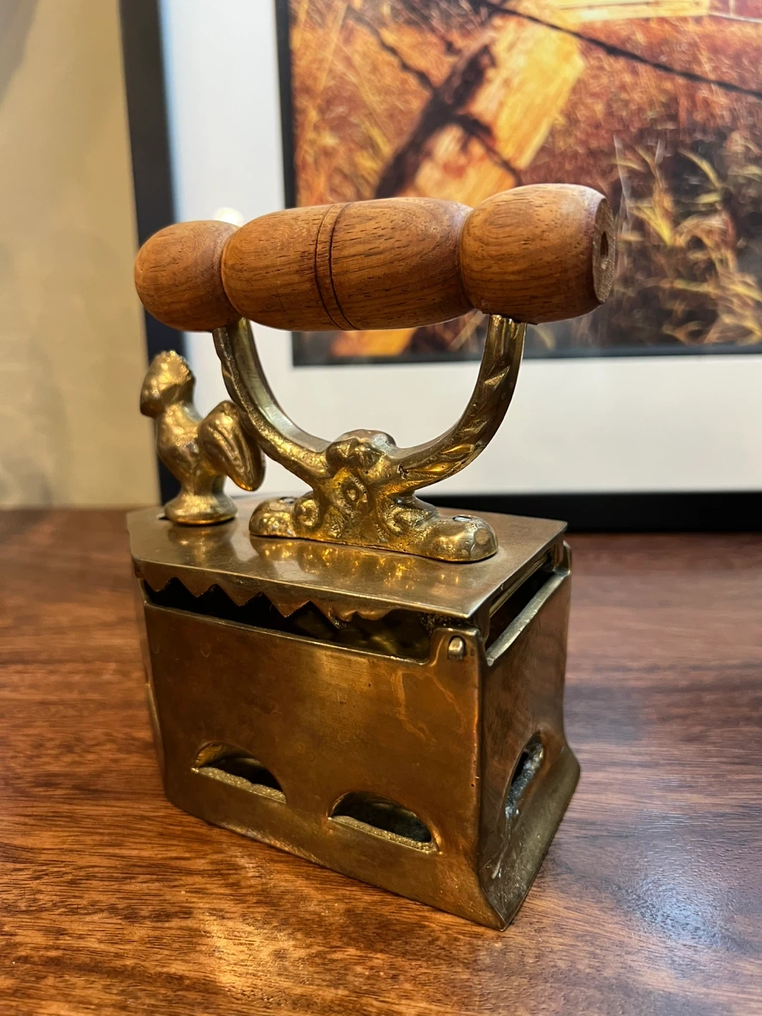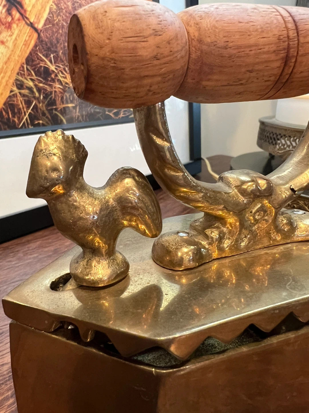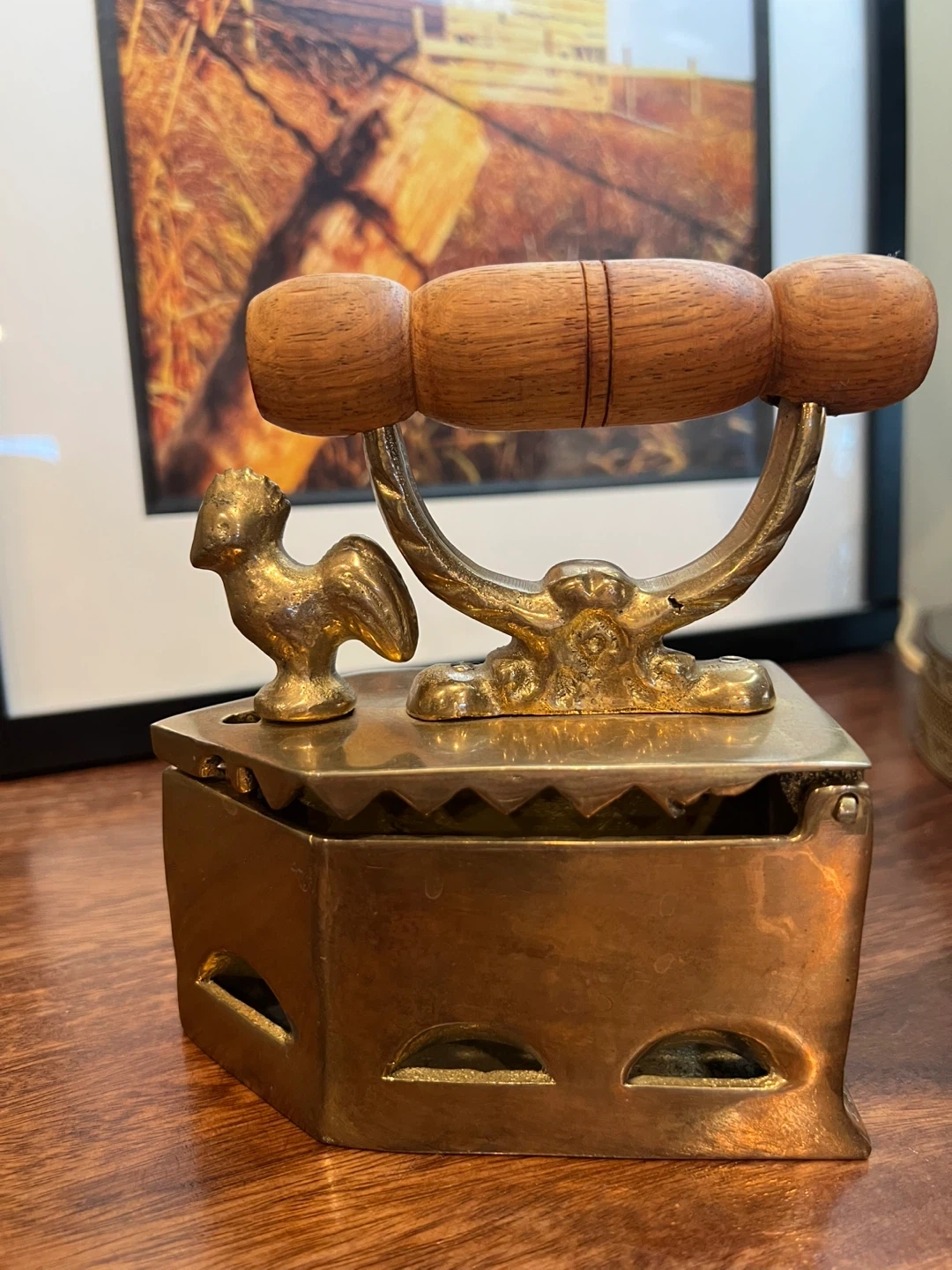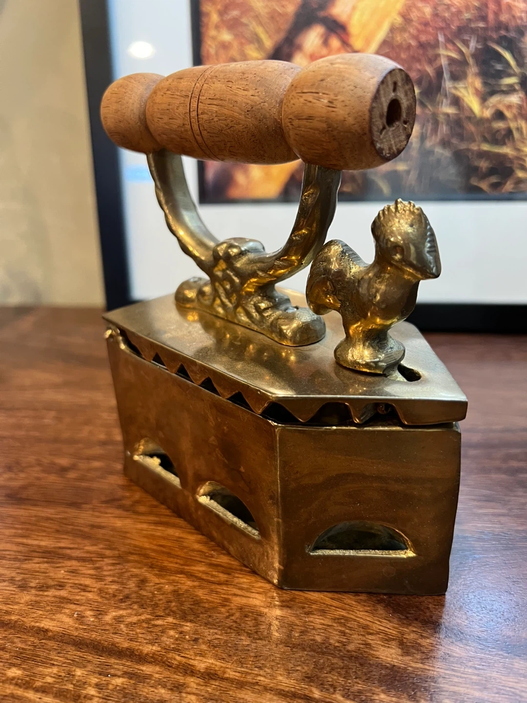 579Vintage brass charcoal iron, also known as a coal iron or sad iron These irons were used before the advent of electricity to press clothes The term "sad" comes from an old English word for "solid" or "heavy," as these irons typically weighed between five and nine pounds Charcoal irons have a hollow chamber where hot coals were placed to heat the iron The wooden handle allowed the user to hold the hot iron without getting burned This particular iron features a rooster figure that acts as a latch to keep the lid closed They are now primarily used as decorative pieces or collected as antiques Beautiful vintage condition Clean 5.5” tall, 5 long and 2.75” deep Rare collectible gem!!! Asking $55 Interested? Message me and please check my other listings…