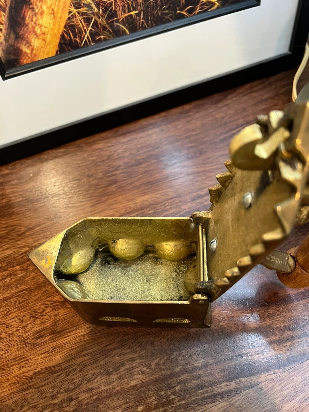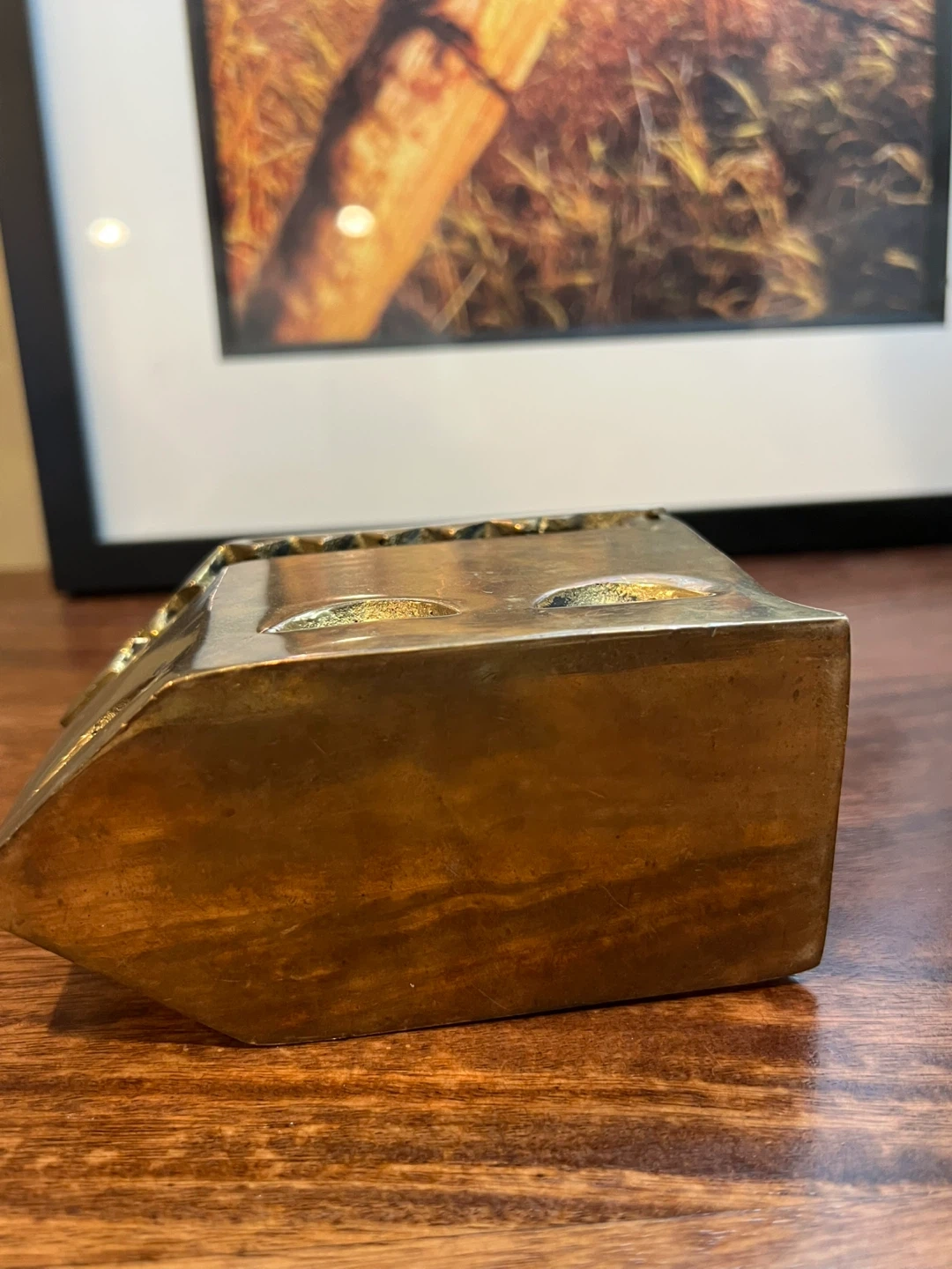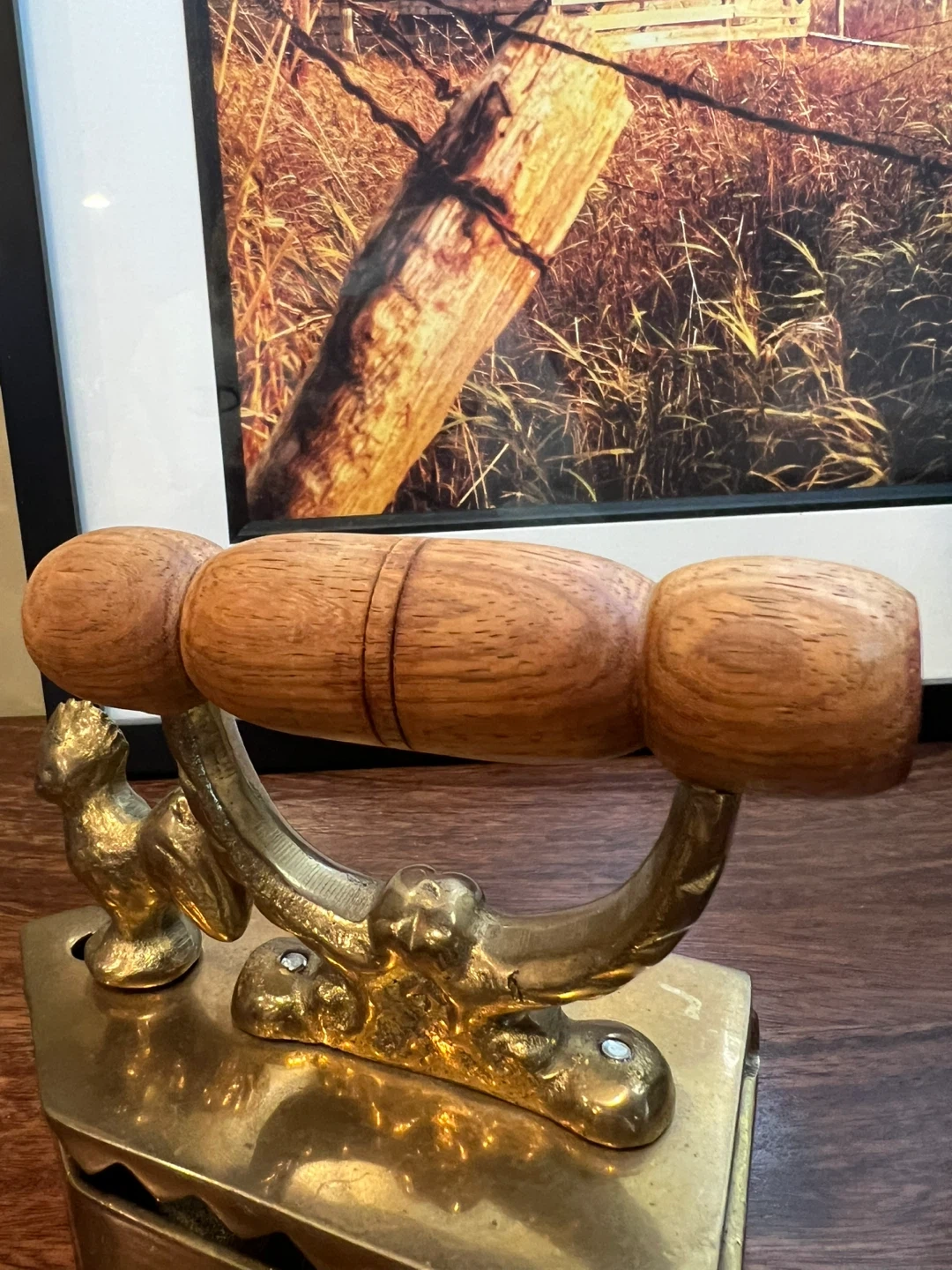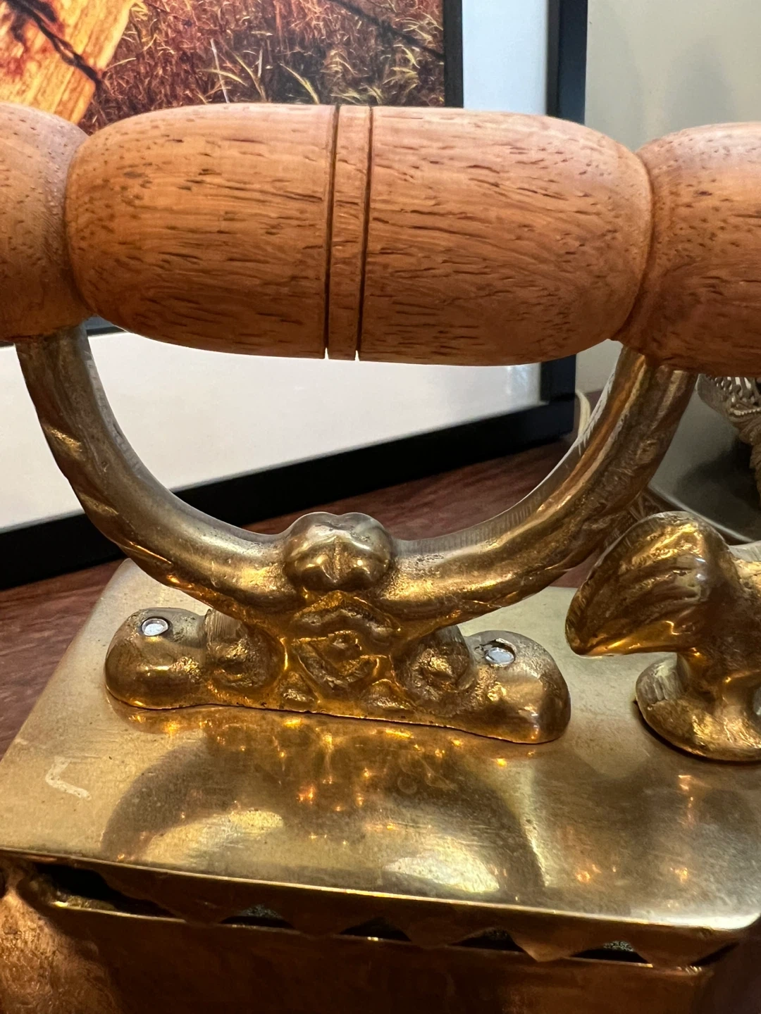 579Vintage brass charcoal iron, also known as a coal iron or sad iron These irons were used before the advent of electricity to press clothes The term "sad" comes from an old English word for "solid" or "heavy," as these irons typically weighed between five and nine pounds Charcoal irons have a hollow chamber where hot coals were placed to heat the iron The wooden handle allowed the user to hold the hot iron without getting burned This particular iron features a rooster figure that acts as a latch to keep the lid closed They are now primarily used as decorative pieces or collected as antiques Beautiful vintage condition Clean 5.5” tall, 5 long and 2.75” deep Rare collectible gem!!! Asking $55 Interested? Message me and please check my other listings…