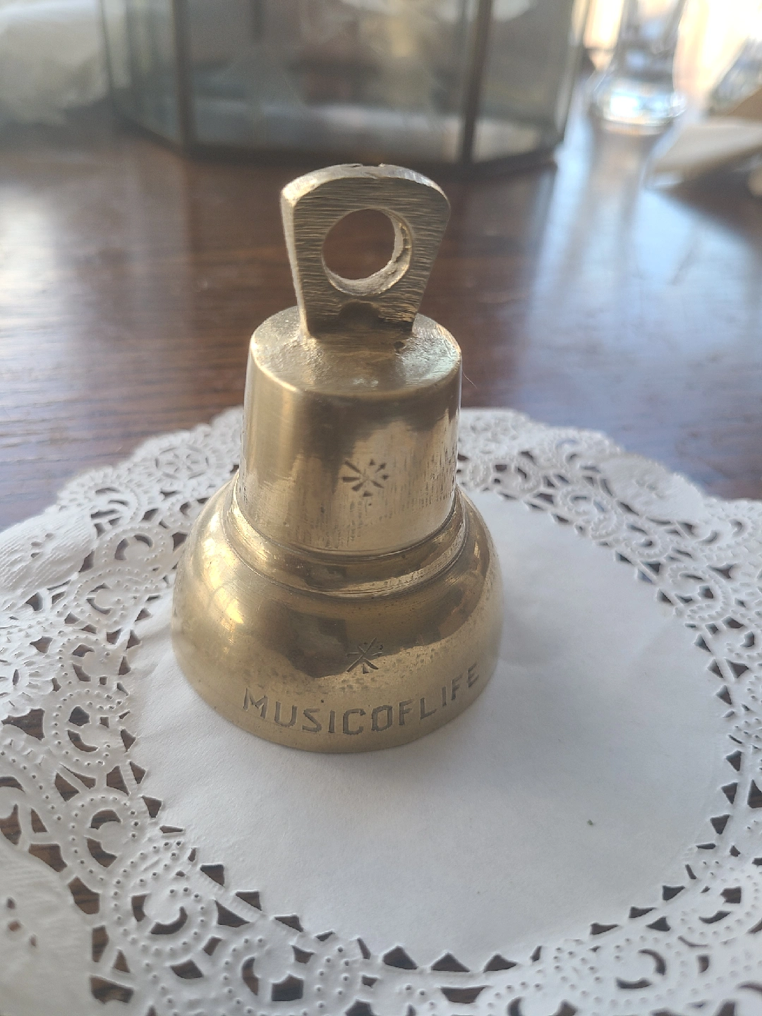 I'm selling a vintage brass bell with the inscription "Music of Life" and "Women Are The". It's a charming piece with a lovely tone. Perfect for collectors or anyone who appreciates unique vintage items!