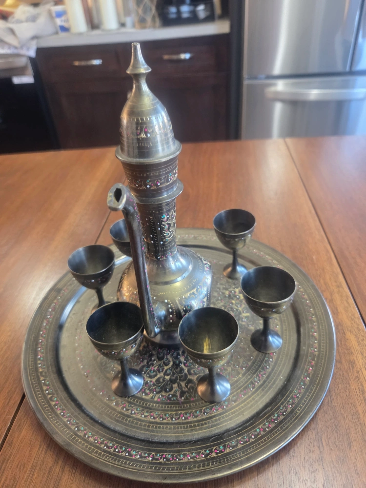 Selling a beautiful vintage brass pitcher and goblet set. It's a unique piece with intricate designs, perfect for adding a touch of elegance to your home. The set includes a pitcher and six small goblets, all displayed on a matching tray. It's in great condition and ready to be enjoyed!