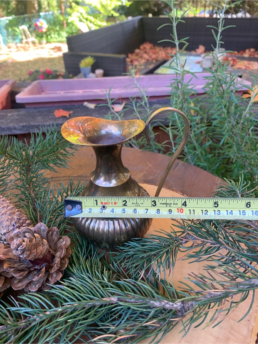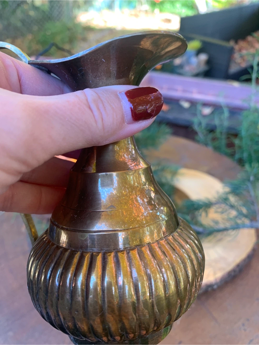 697Selling a lovely vintage brass pitcher with lovely curved designs. It's marked as "Made in India" on the bottom. It has a unique handle and a charming, aged patina. It is 5.5” tall and has a good weight to it. It would look great with some holiday florals or stacked on some books on a coffee table or shelf. A very versatile piece to style …could even hold some taller match sticks next to a candle! Cash only please. Props not included.