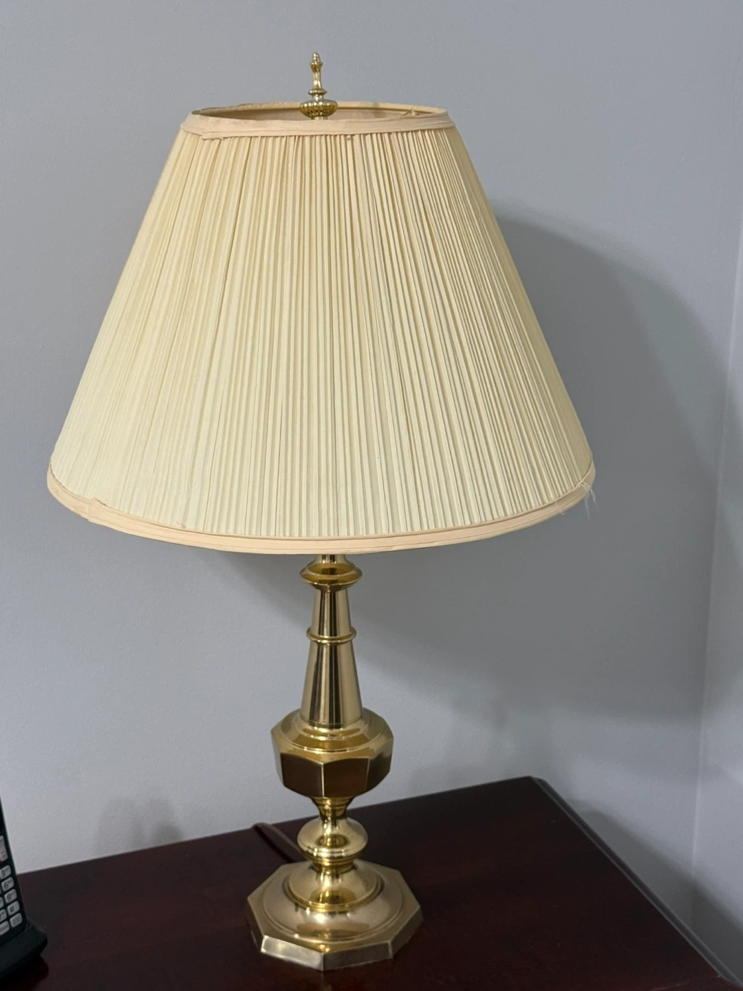 Selling a vintage brass table lamp! It features a classic design with a pleated, off-white shade. It would be a great addition to any room!