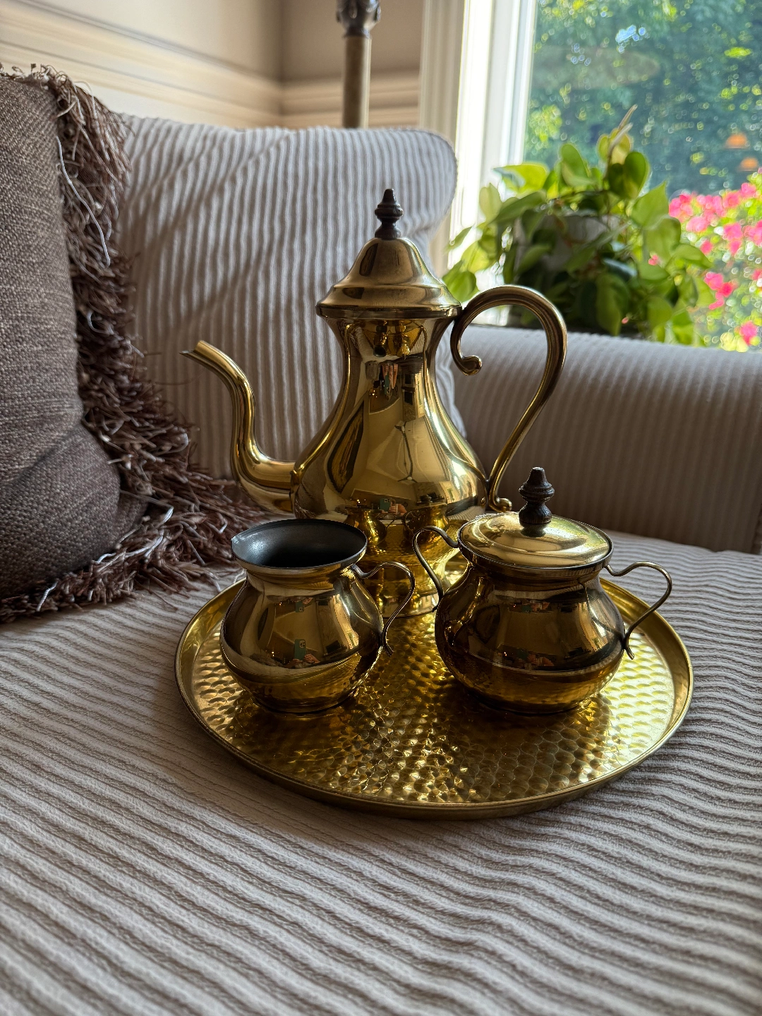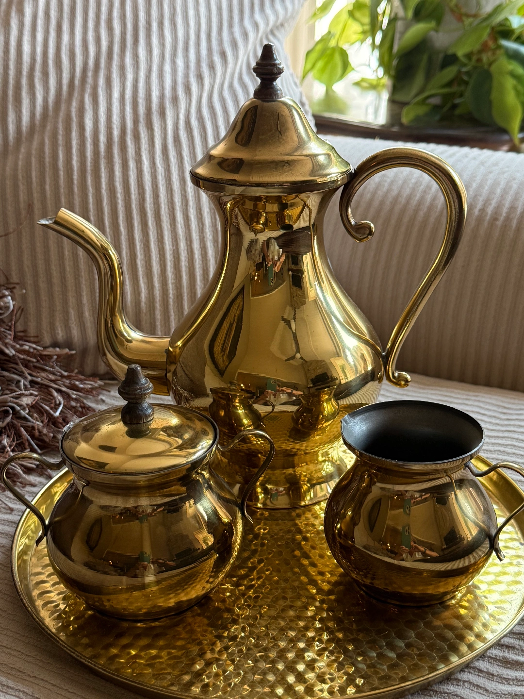 Selling a beautiful vintage brass tea set! It includes a teapot, a sugar bowl with a lid, a creamer, and a hammered tray. Perfect for adding a touch of elegance to your tea time in good condition