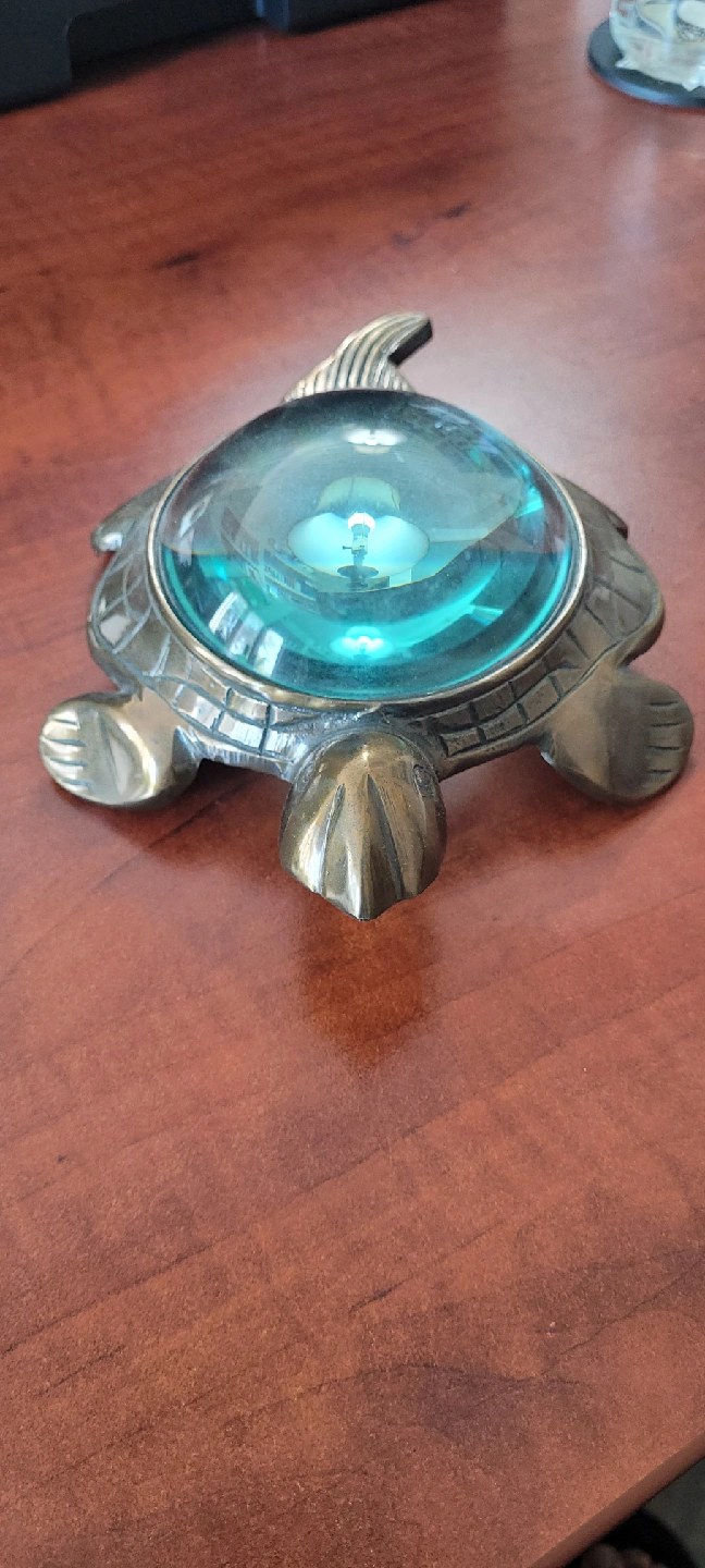 This is a vintage brass turtle with a magnifying glass in its shell. It's a unique piece and would look great as a decorative item in your home or office