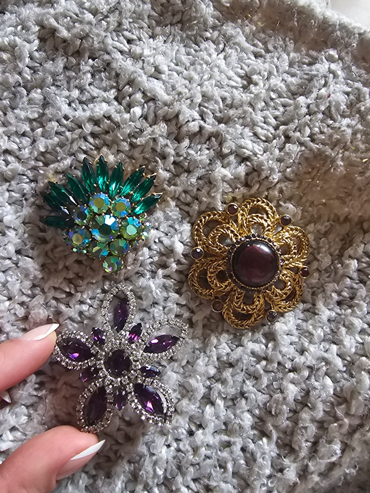 Selling a set of 3 vintage brooches. They're all in great condition and would make a lovely addition to any outfit or collection! The brooches feature different designs and colours.