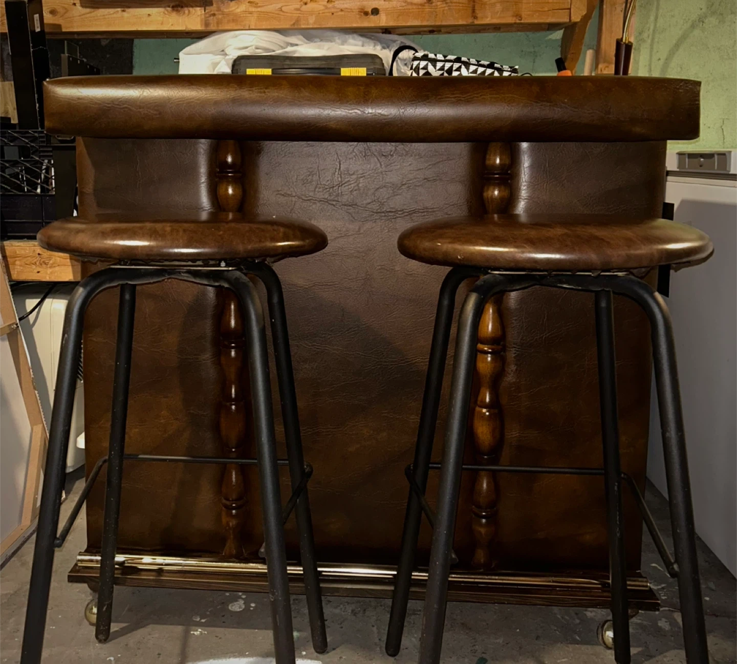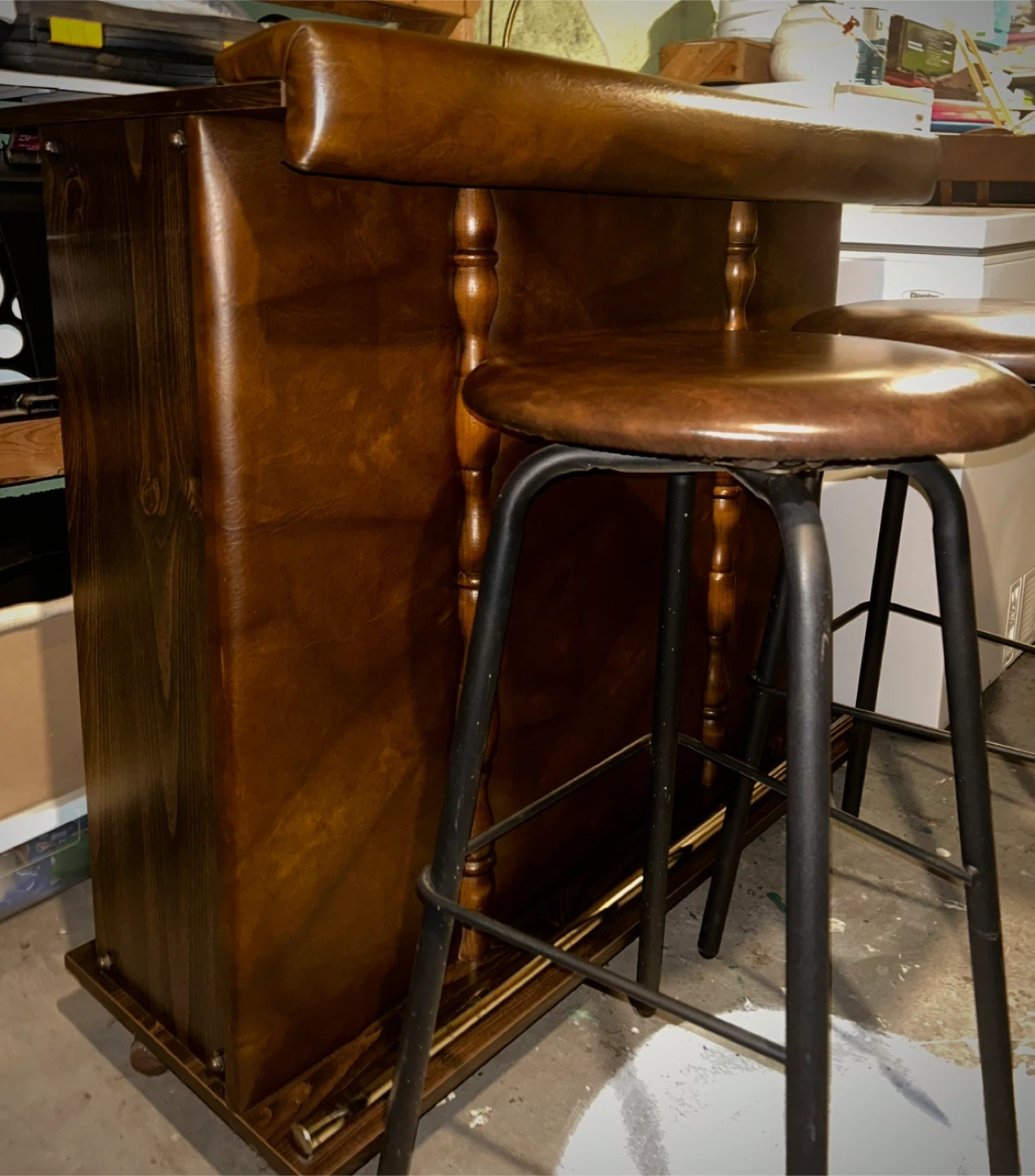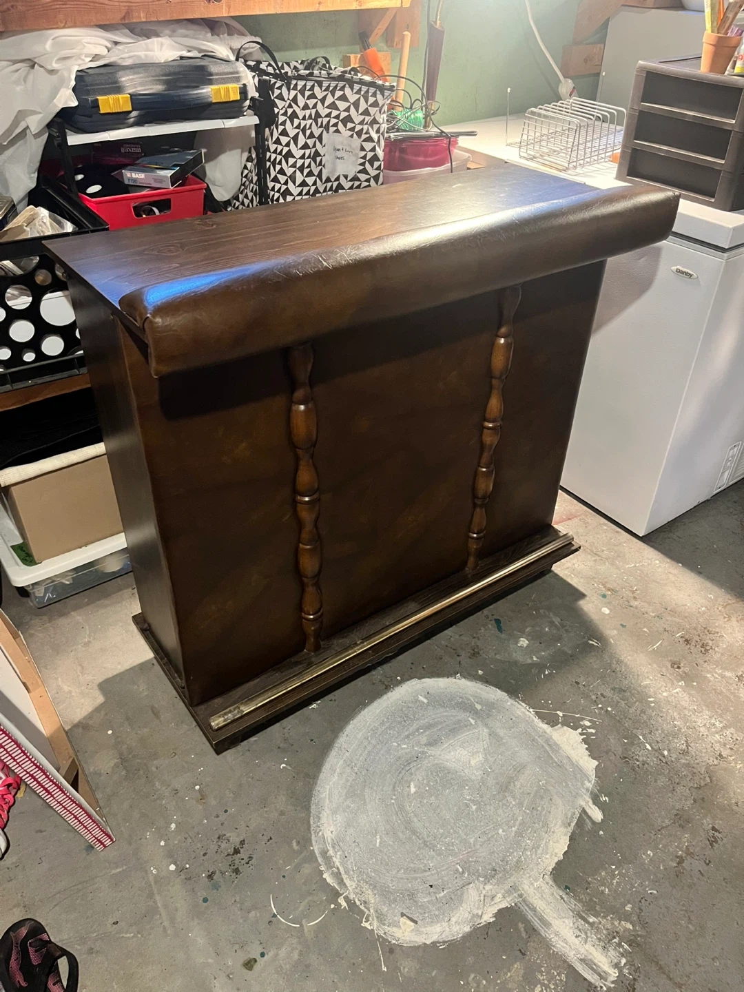 267Selling a vintage brown bar with two stools. The bar has a padded leather top, decorative spindles and a foot rest. It's in good condition with very few scuffs and scratches. The bar also comes with a shelving unit for storage.