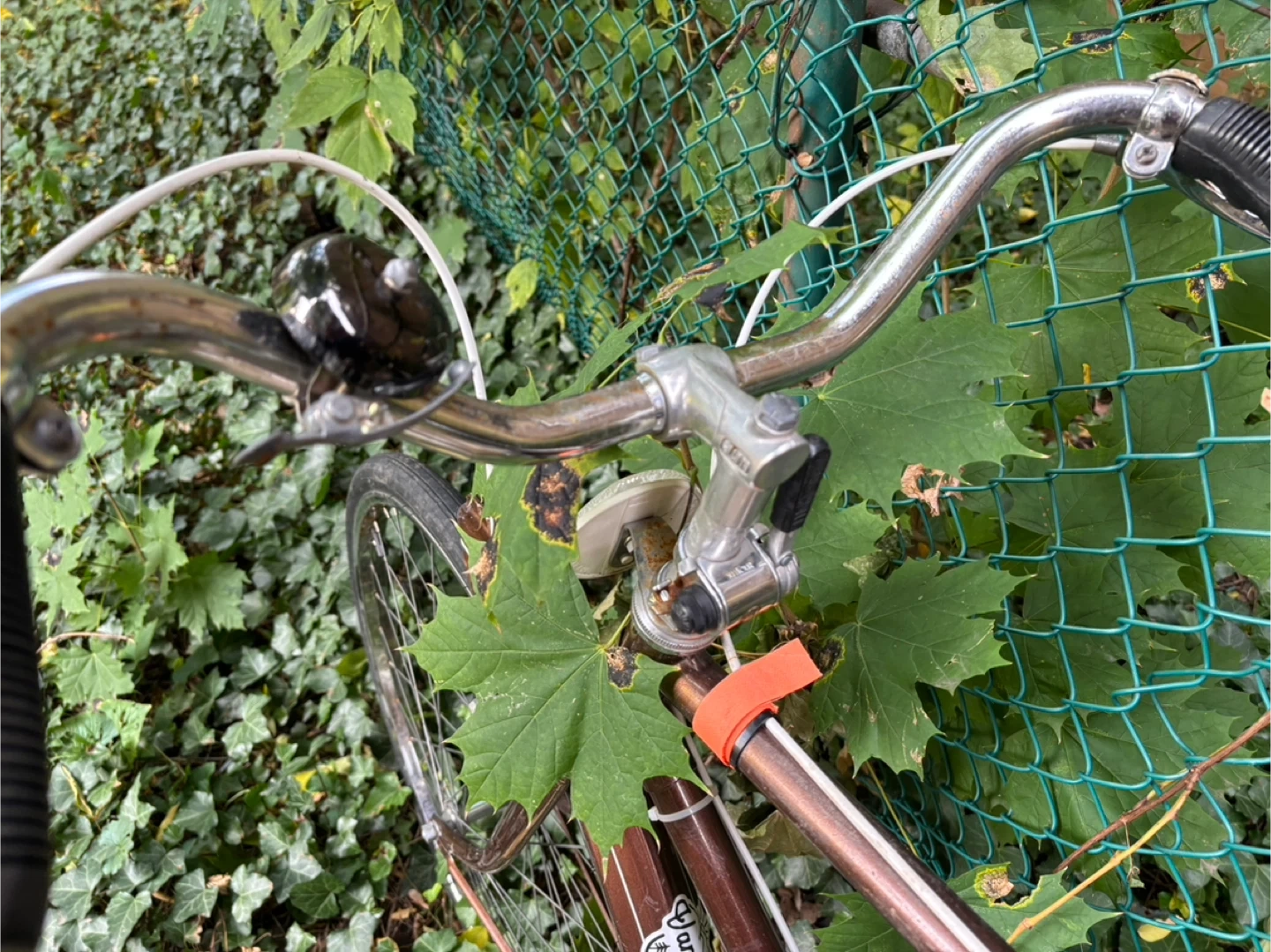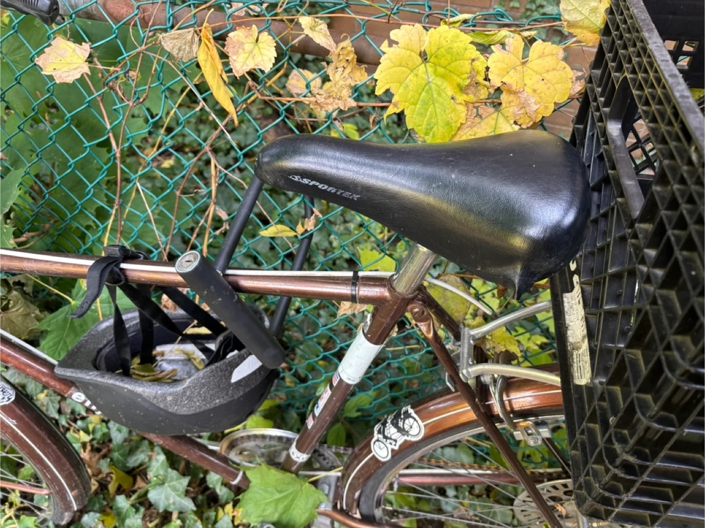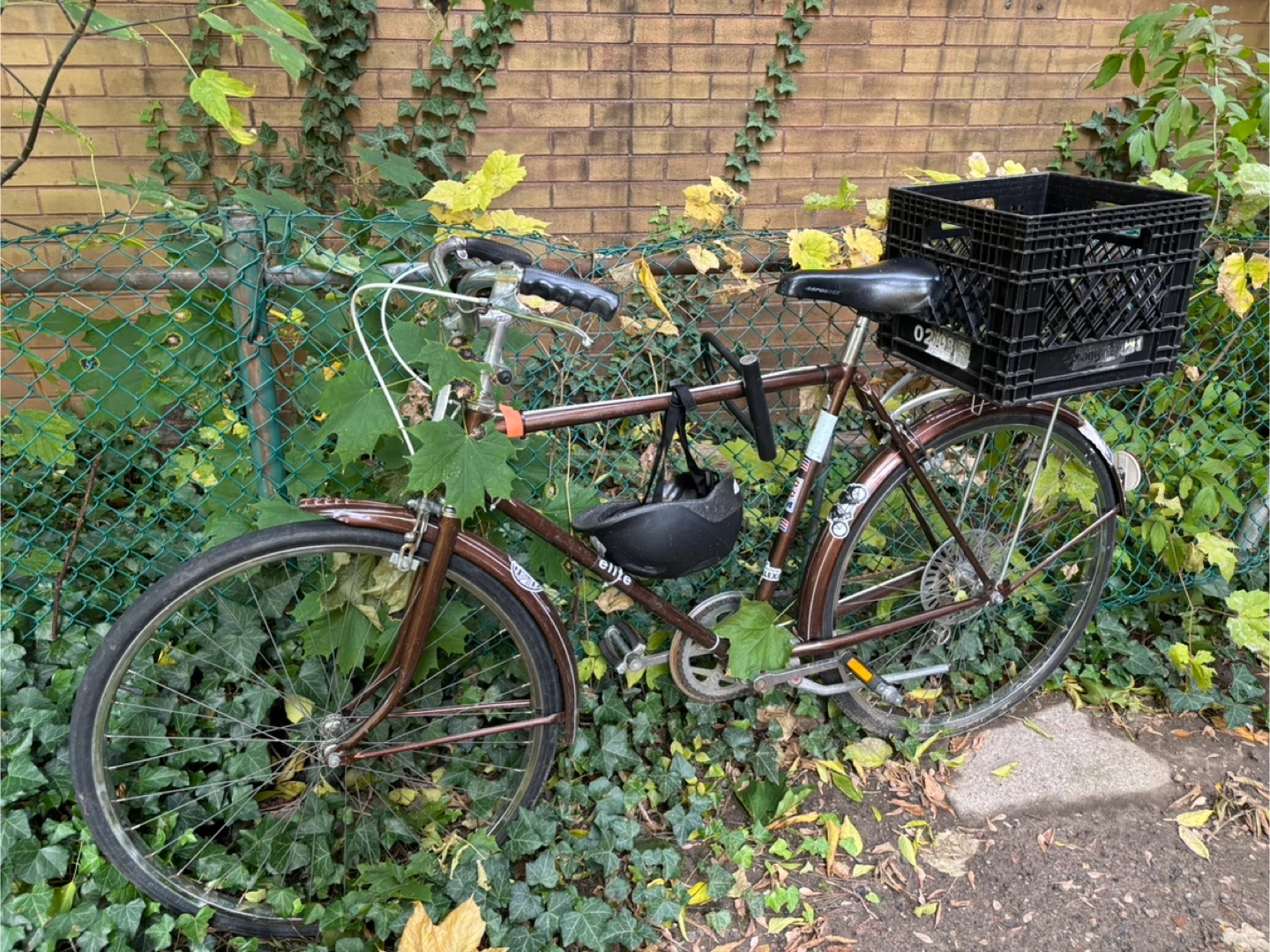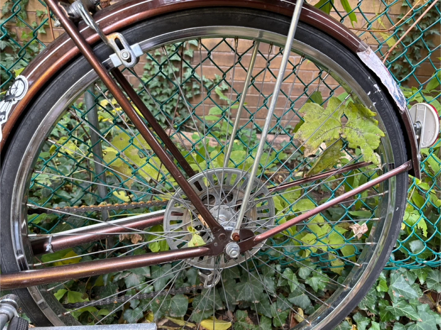 26Selling a vintage brown bicycle. It comes with a black basket attached to the back for carrying items. The bike shows some signs of wear, but is still in good working condition. Perfect for leisurely rides around town!
