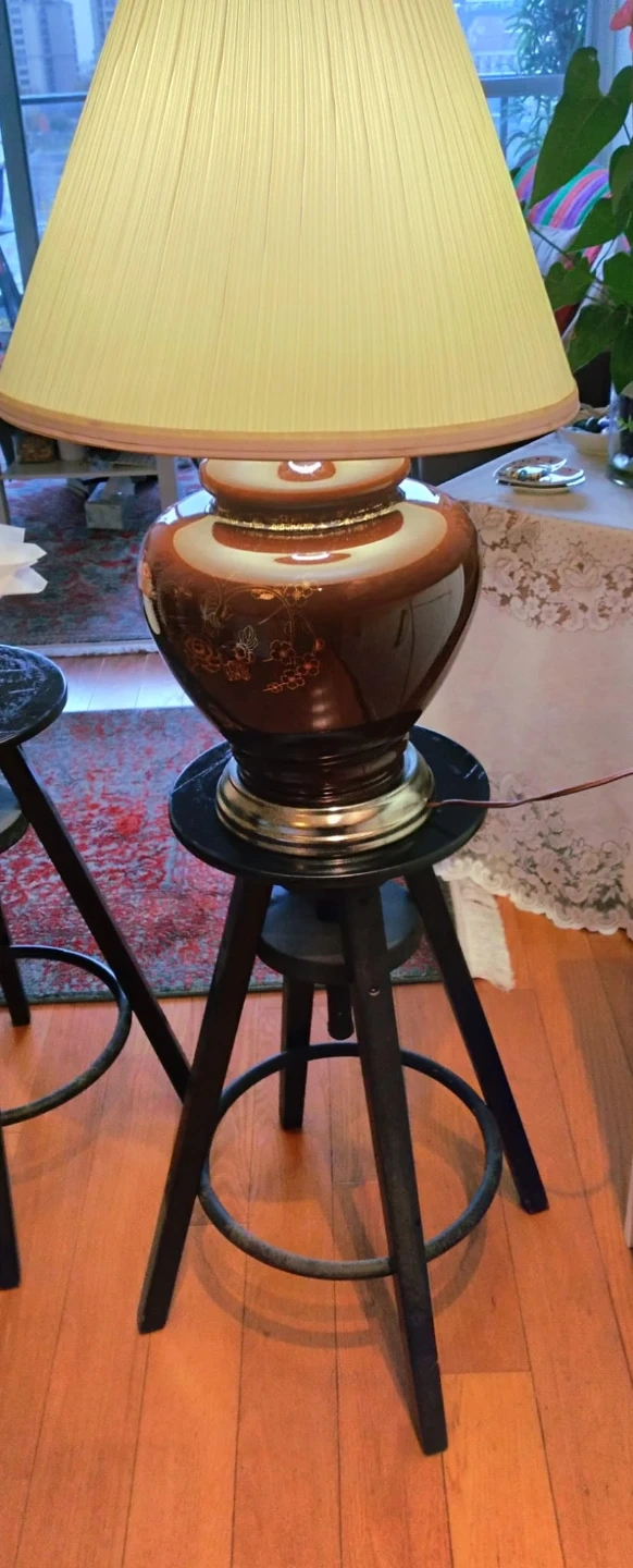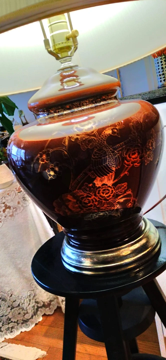 189This is a beautiful ceramic vintage table lamp with a unique brown vase-shaped base. It features a lovely floral design etched into the base. The lamp comes with a lampshade and is in great condition. No defects.