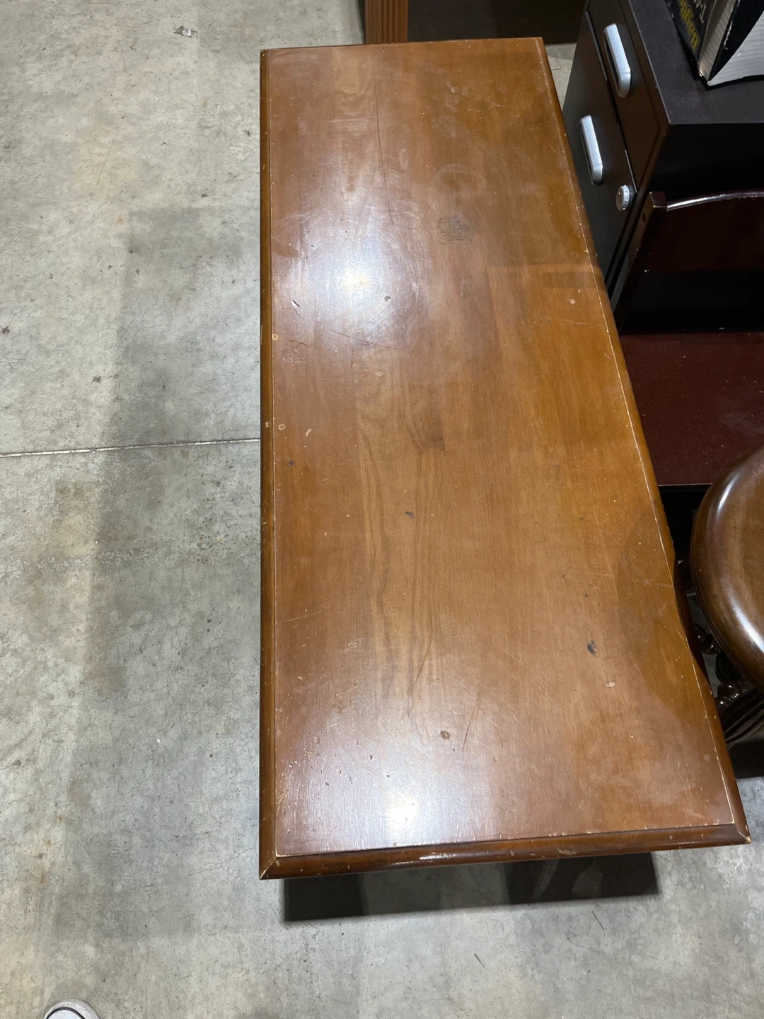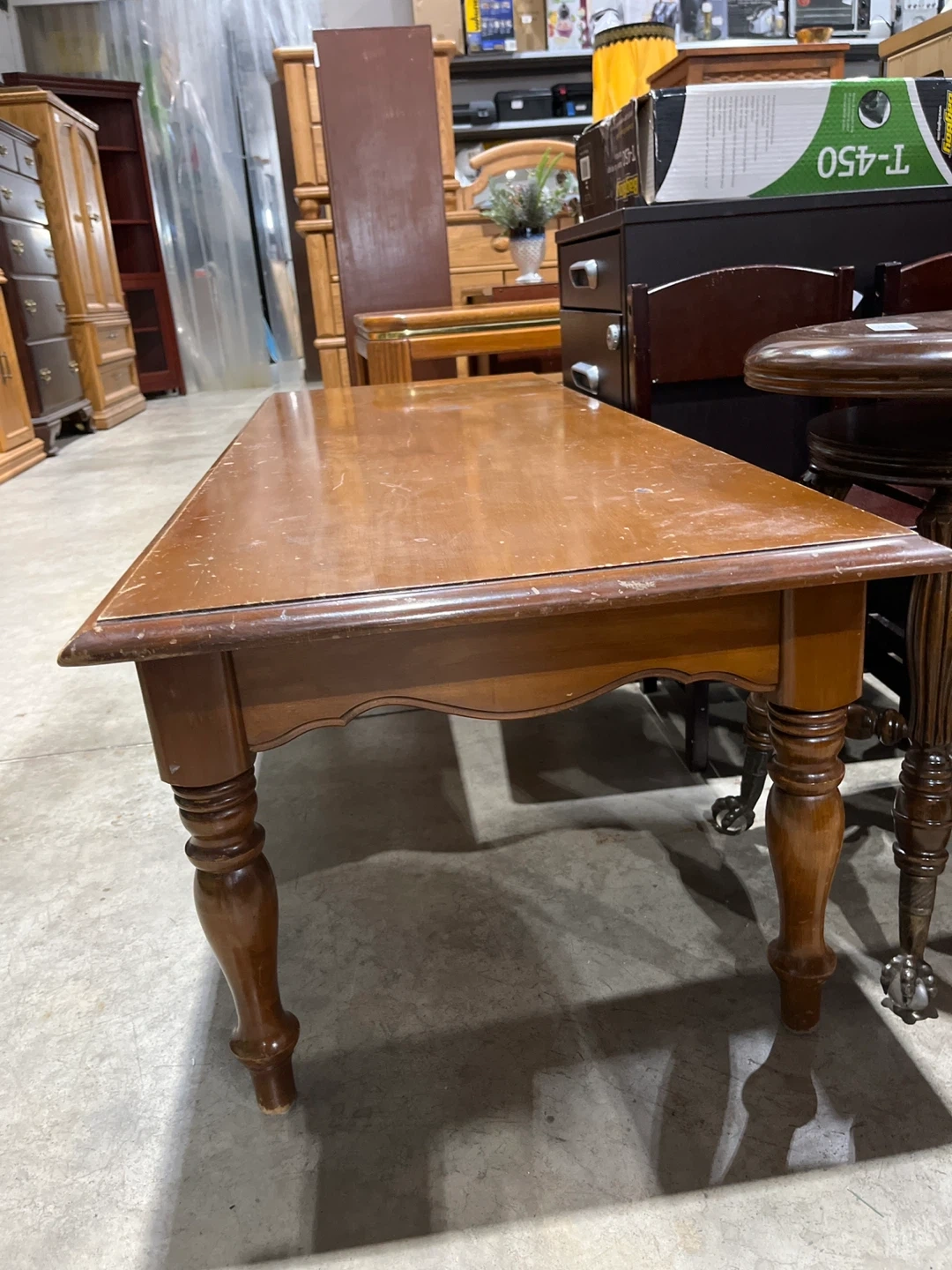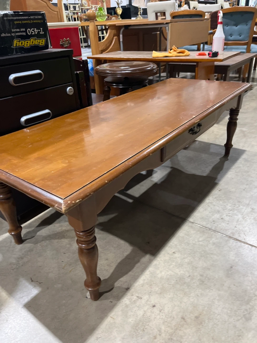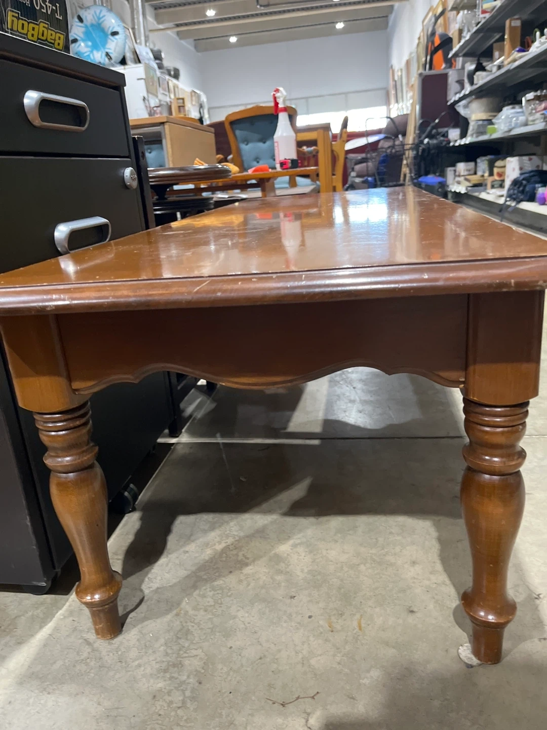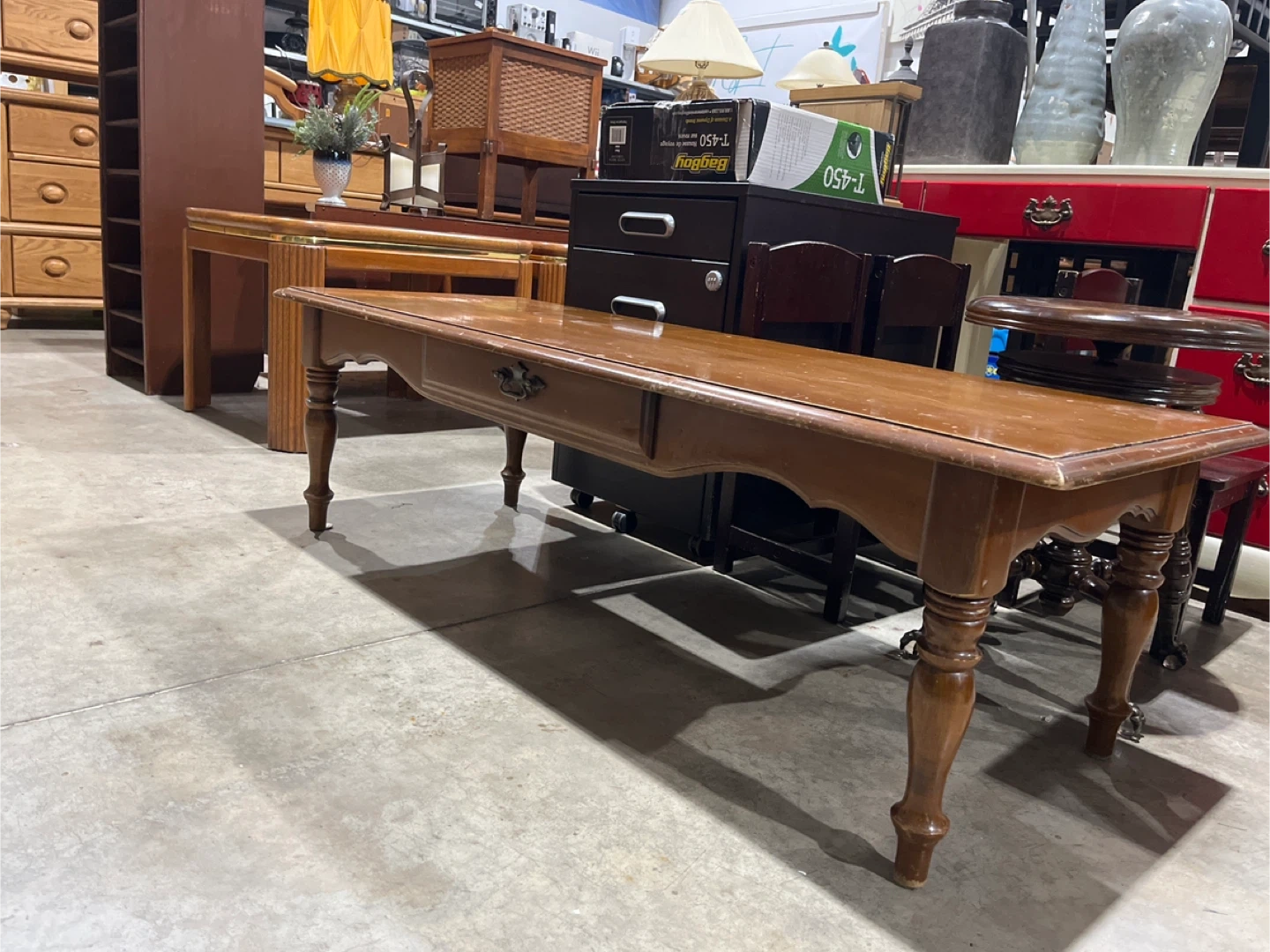 This is a lovely vintage coffee table, perfect for adding a touch of warmth to your living room! It has a classic design with turned legs and a convenient drawer for storage. The brown wood finish gives it a timeless look that would complement many decor styles. There are some minor signs of wear, but overall it's in good condition and ready for a new home. Drawer is a fake. 52x16x20” Visit Rebound Centre Thrift Store 6215 3rd St SE, Unit C11 Open daily 10 AM – 5 PM Local pickup available See more at Reboundcentre.com