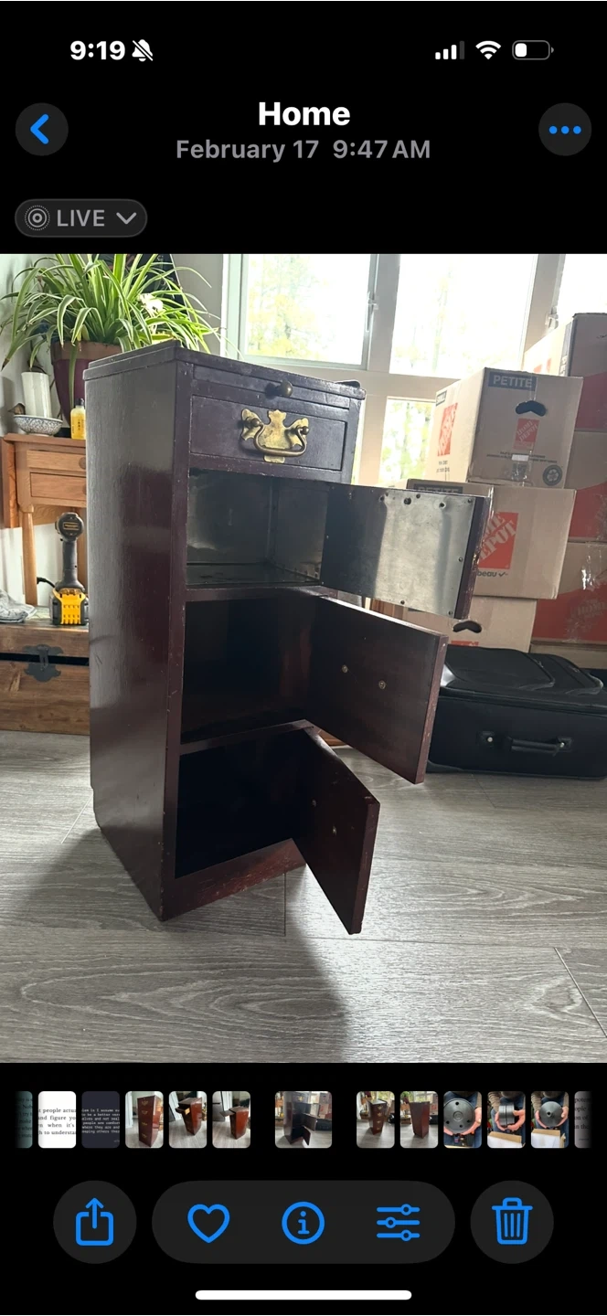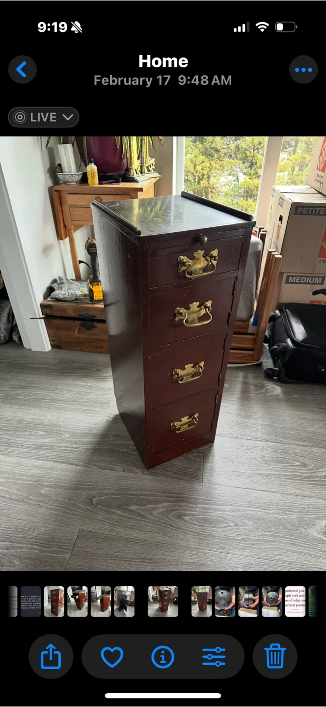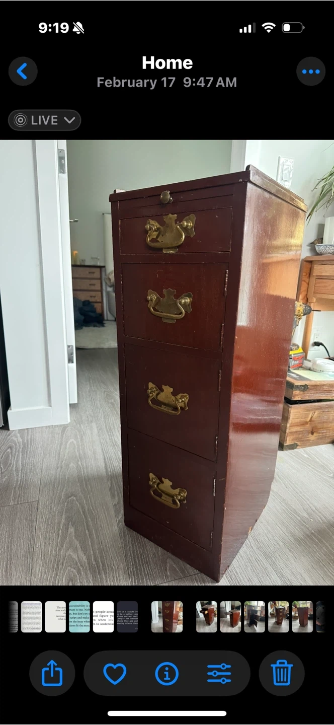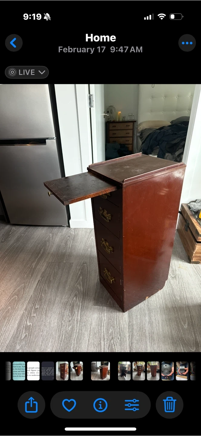 Selling a vintage wooden filing cabinet. It has a unique design with a pull-out writing surface and multiple drawers. The cabinet is brown with brass-coloured handles. It would make a great addition to any home office or workspace! Brown, 30” tall, 13” deep and 11” wide Original hardware. Three cupboards, one drawer and a slide out extension.