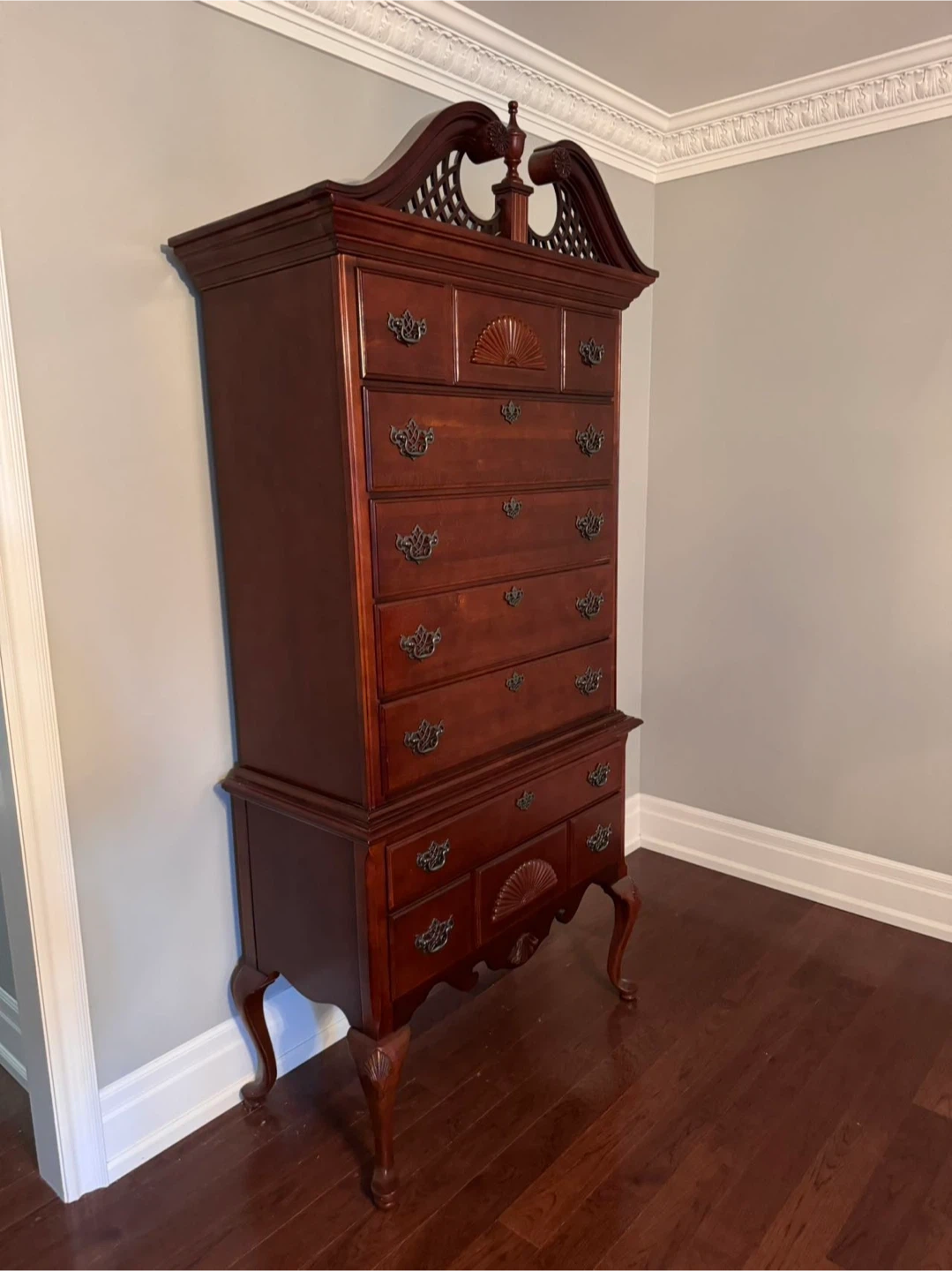 Selling a vintage brown wooden highboy dresser. It has a classic design with ornate handles and decorative details. It's a beautiful piece of furniture that would add a touch of elegance to any room