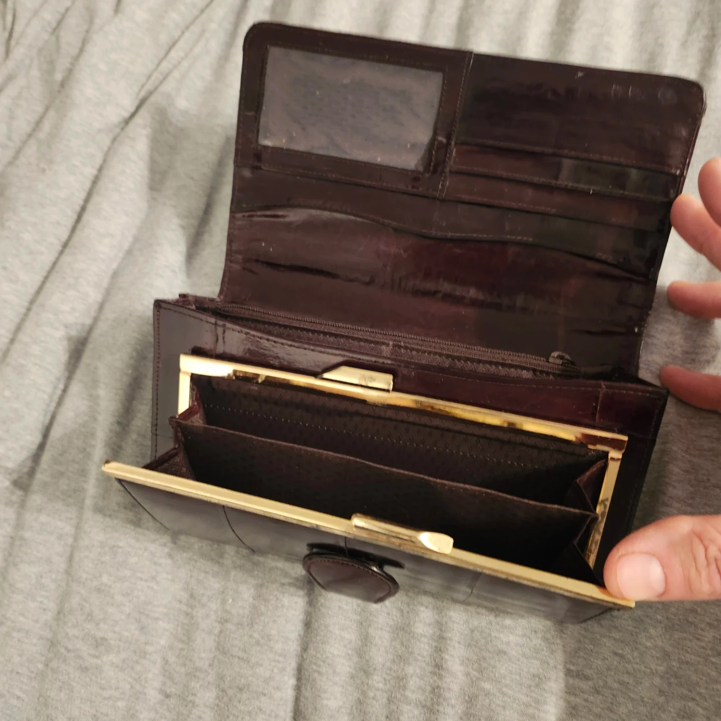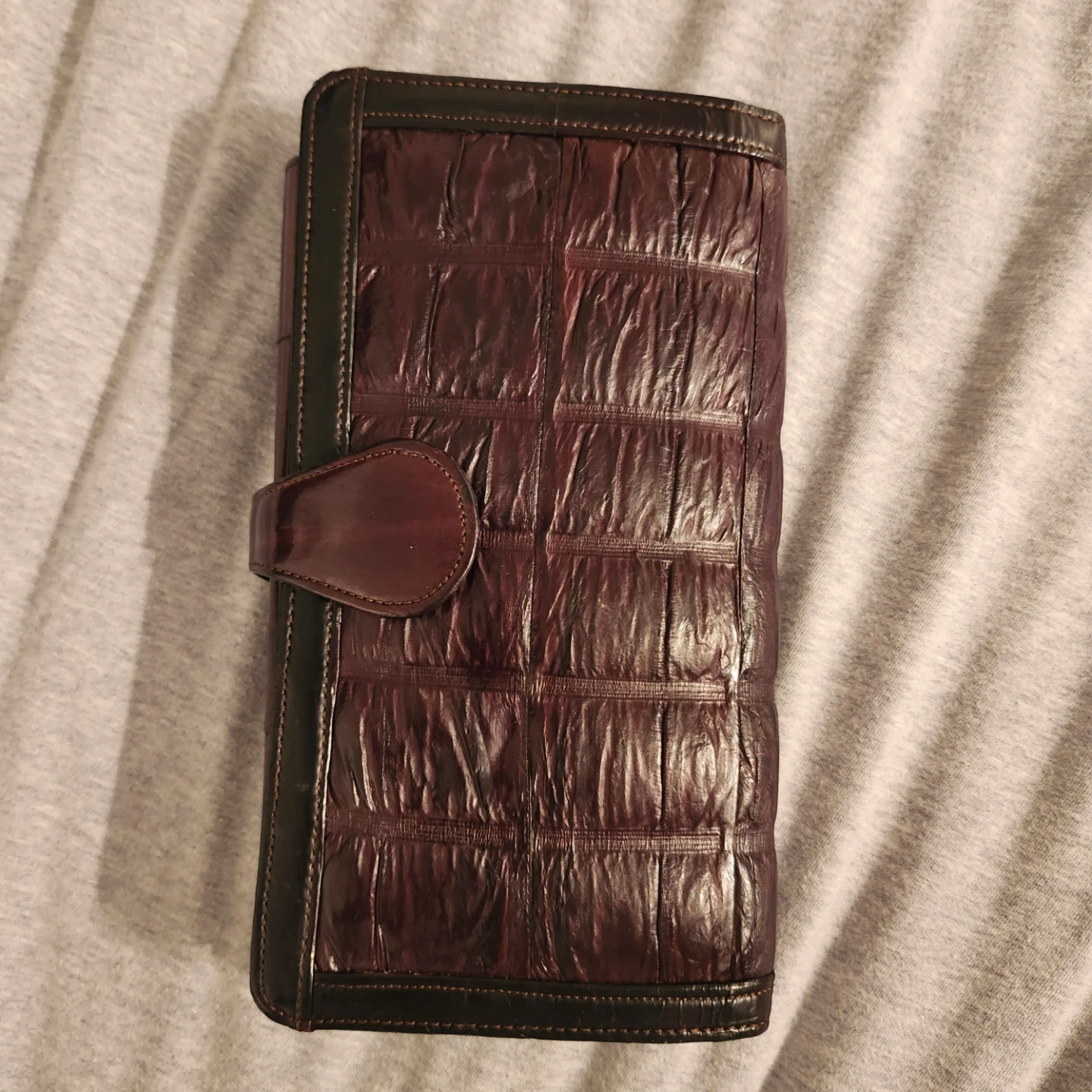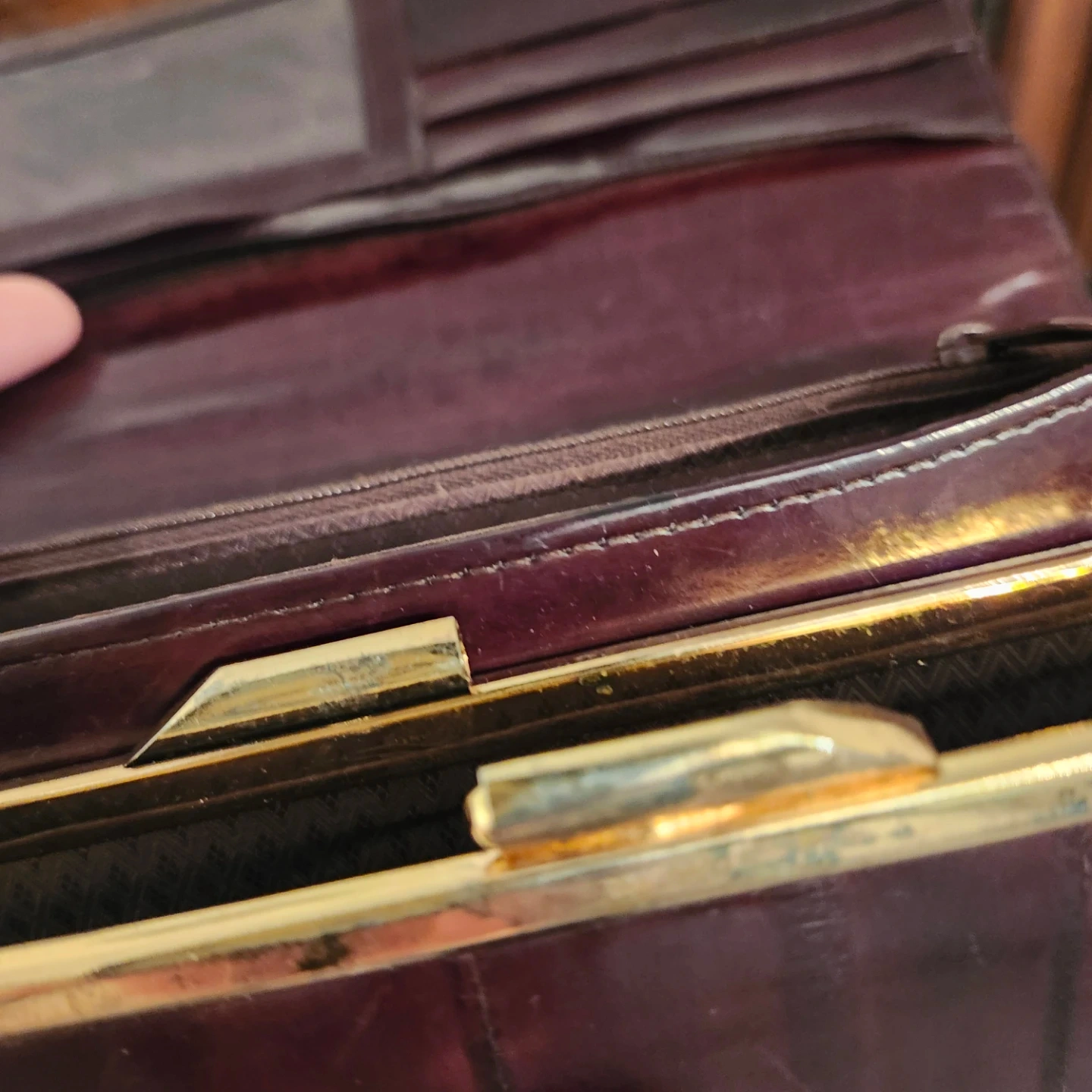 10This is a vintage burgundy eel skin wallet. It has a unique texture and a classic design. It shows some signs of wear, but it's still in good condition for its age. It features a kiss-lock closure and multiple compartments inside