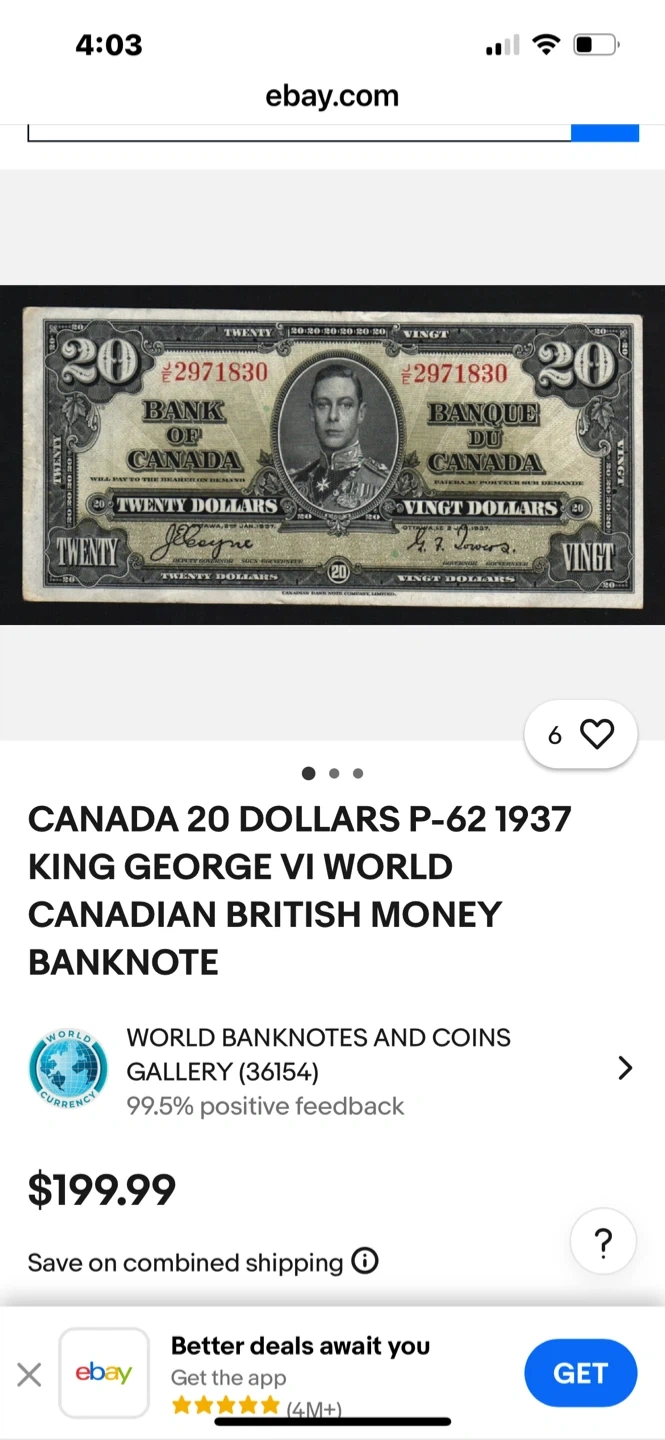 Please check eBay prices Selling a Canada 20 Dollar P-62 1937 King George VI World Canadian British Money Banknote. It's in used condition, please see photos for details