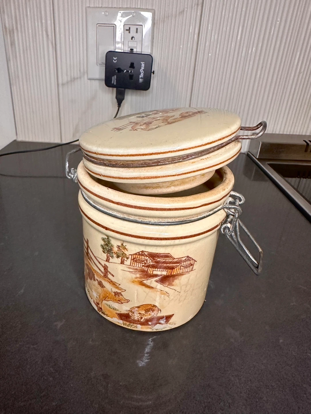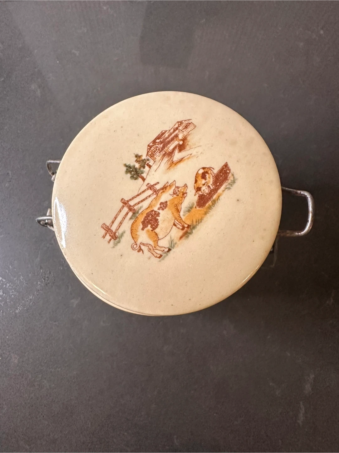 324Here's a cute vintage ceramic canister! It features a charming pig and farm scene design. Perfect decor for adding a touch of country charm to your kitchen. Only cash please!