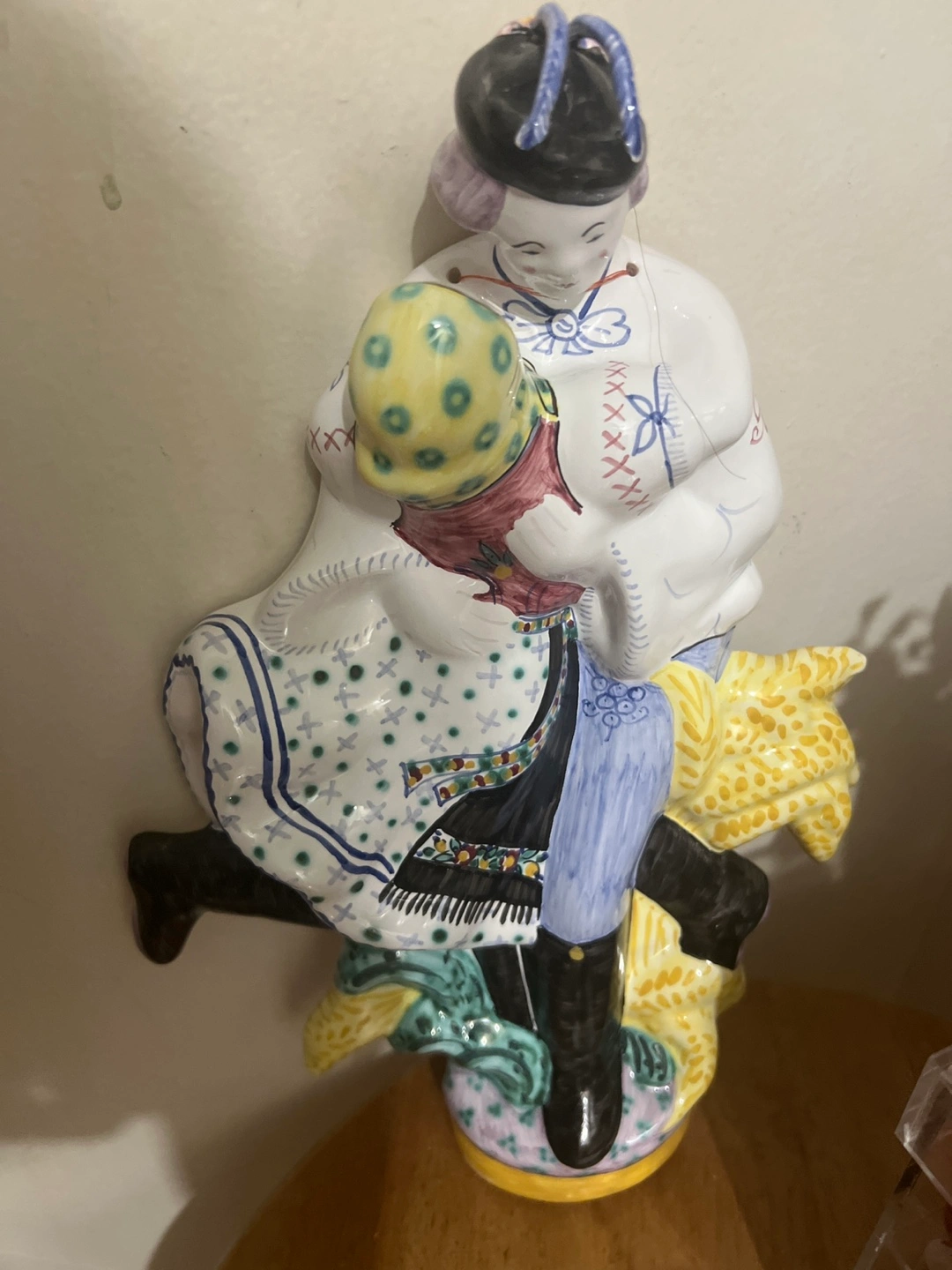 This is a vintage ceramic figurine. It depicts a couple in traditional folk attire. It's a unique piece and would look great on a shelf or mantle. It is in great condition