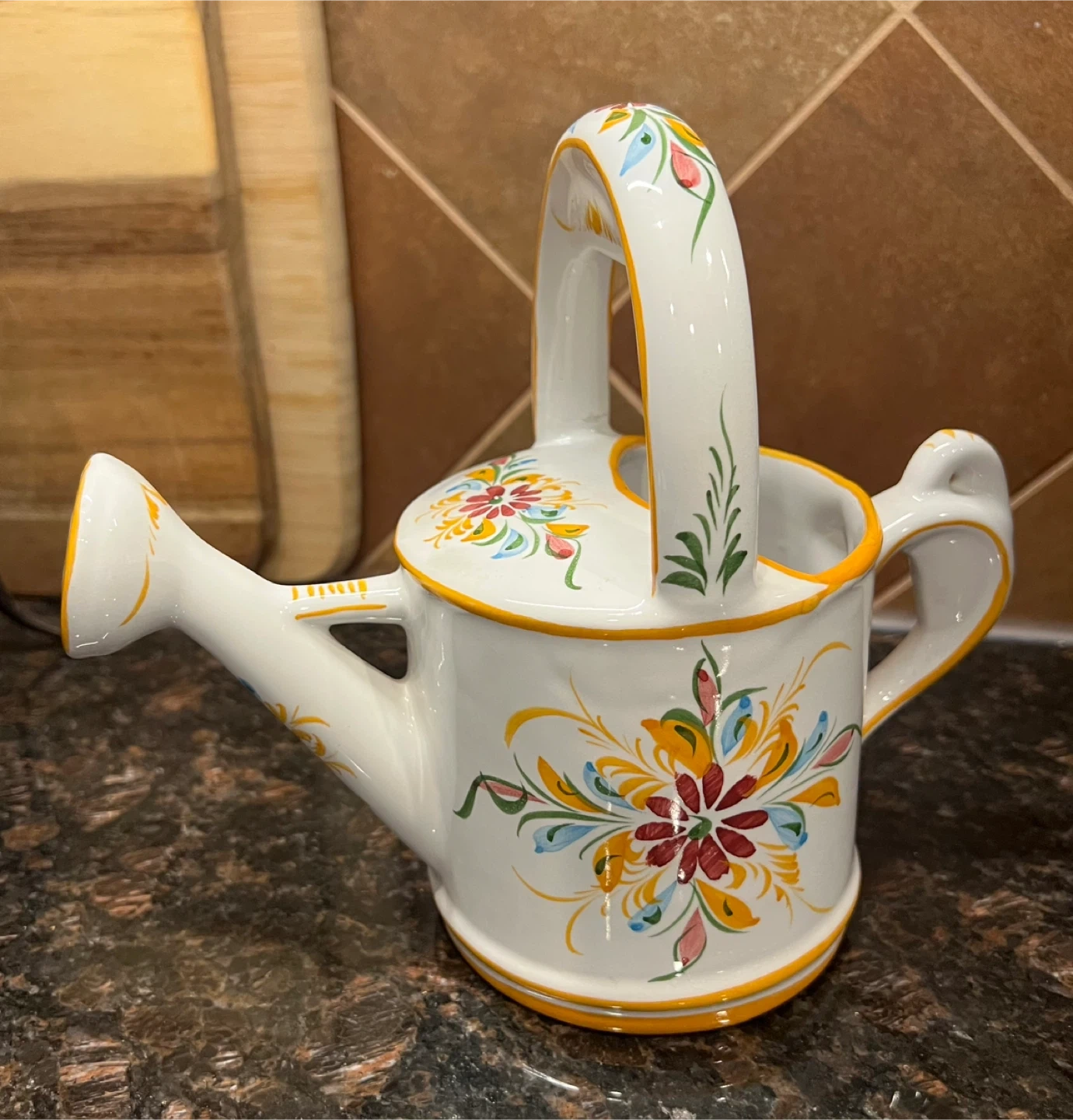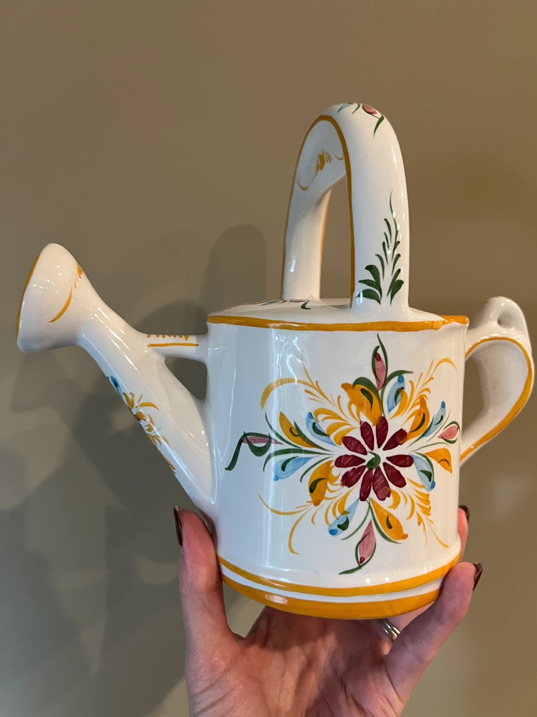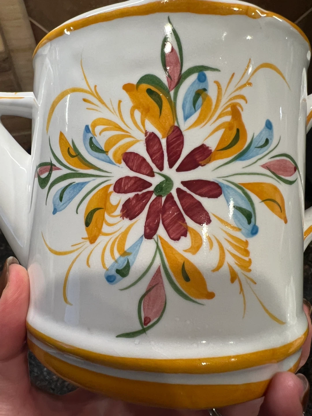 579Hand painted from Portugal Great little decorative piece for your kitchen!! Note - the handle has been previously repaired which is reflected in my price Other than that is in good condition 7.5” tall Asking $10 Interested? Message me and please check my other listings…