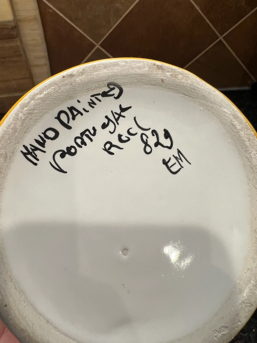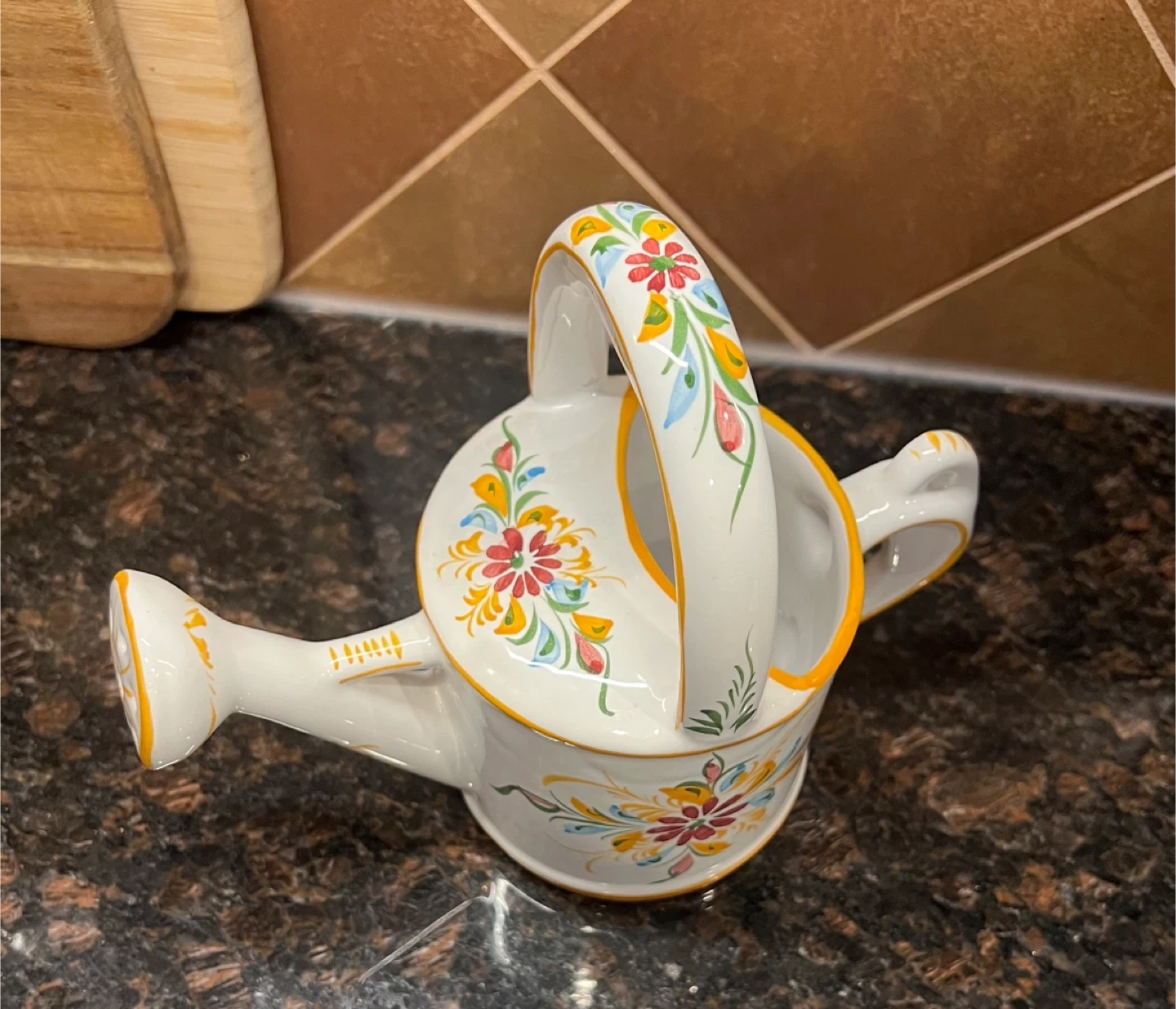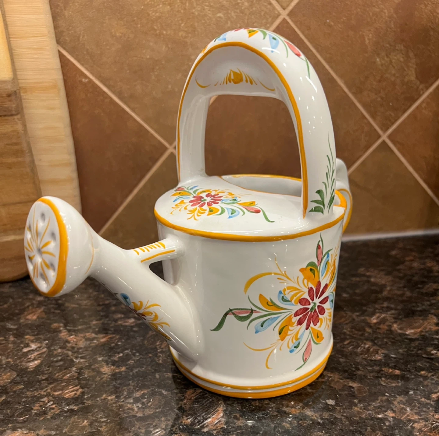 579Hand painted from Portugal Great little decorative piece for your kitchen!! Note - the handle has been previously repaired which is reflected in my price Other than that is in good condition 7.5” tall Asking $10 Interested? Message me and please check my other listings…