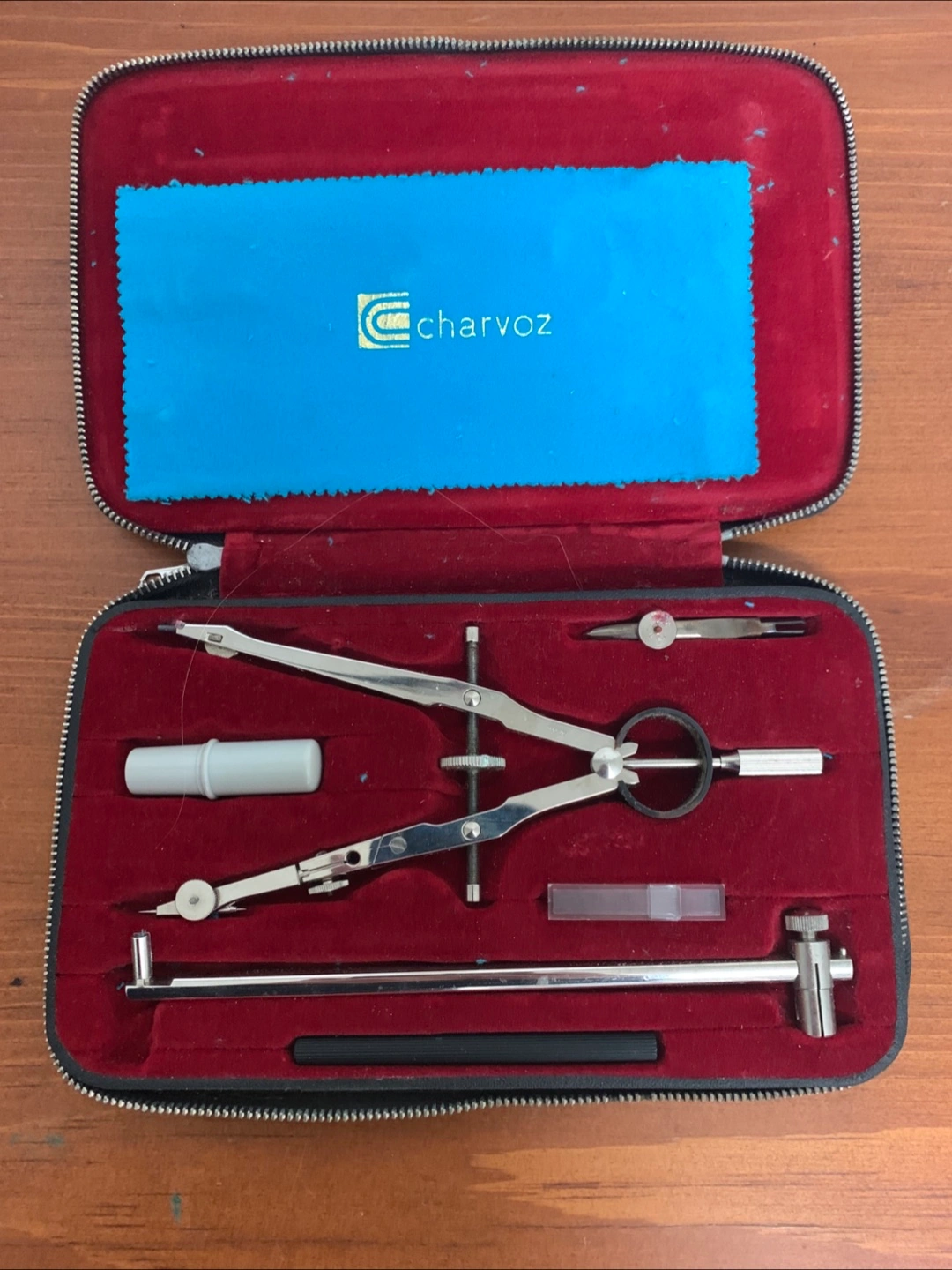 Drafting sets like this one were essential tools for architects, engineers, and designers before the advent of computer-aided design (CAD) software. Charvoz was known for producing high-quality instruments, making their sets desirable for professionals and students alike. These sets typically include a range of tools for precise drawing and measurement. The set includes compasses, dividers, and ruling pens, all housed in a fitted case to protect the instruments and keep them organized. The brand Charvoz is of Swiss origin, and was known for precision instruments. The condition of the set and the completeness of its components significantly affect its value to collectors and users today.