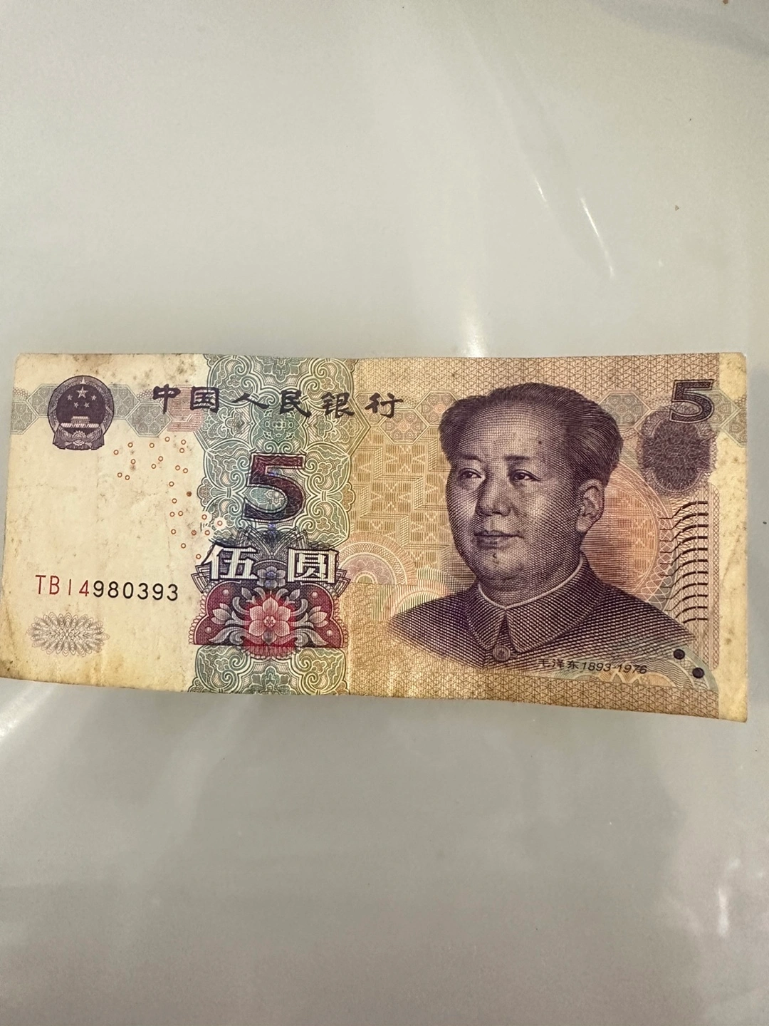 Old 5 Yuan bill. Shows some wear. Collectible currency. Mao Zedong portrait.