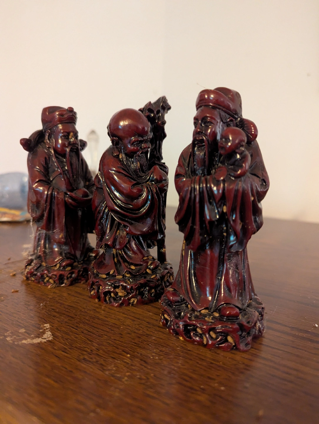 Selling a set of three vintage Chinese figurines. They appear to be made of resin or a similar material and have a dark red/brown colour. They would make a nice addition to any collection or as a decorative piece in your home