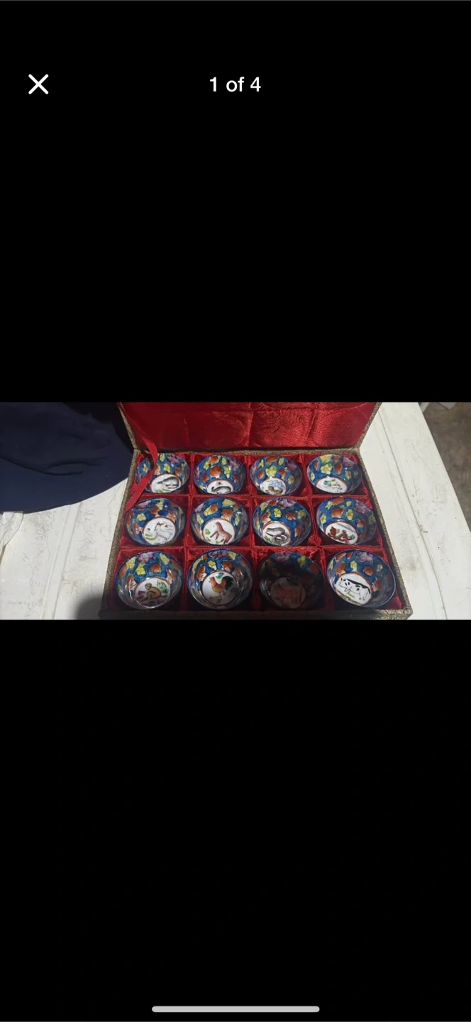 Here's a unique set of vintage Chinese zodiac tea cups! The set includes twelve cups, each featuring a different animal from the Chinese zodiac. The cups come in a beautiful patterned box with a red interior, making it a lovely display piece or a special gift for a tea lover