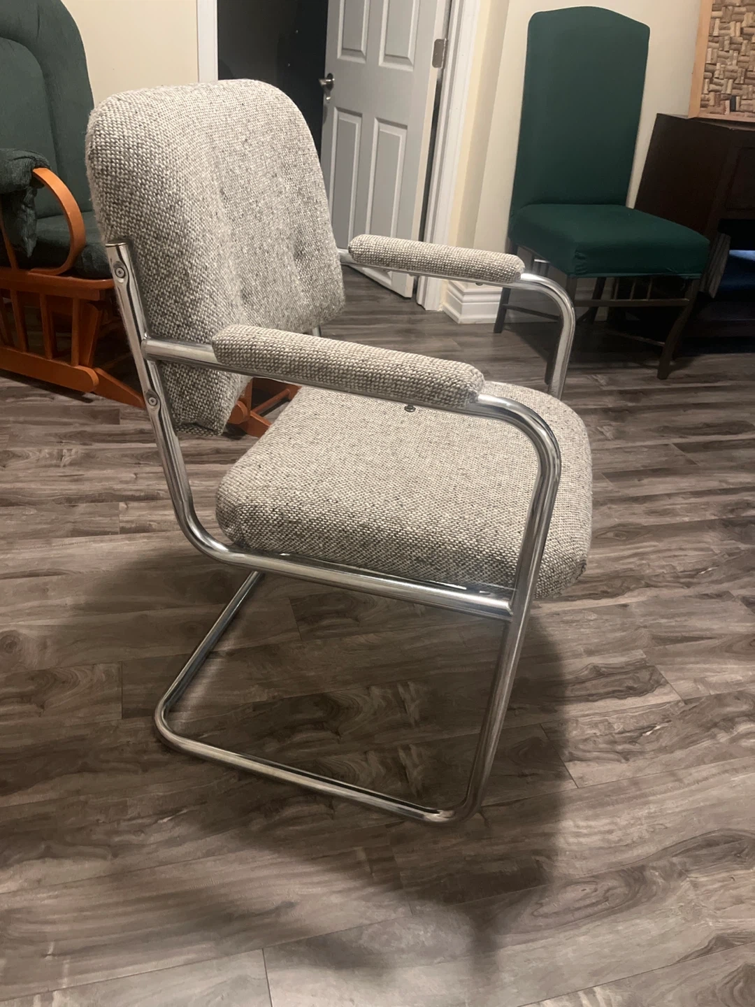 70Selling a cool vintage armchair with a chrome frame! It's got a retro vibe and would look great in any room. The fabric is a neutral tweed-like material. It has armrests for extra comfort!