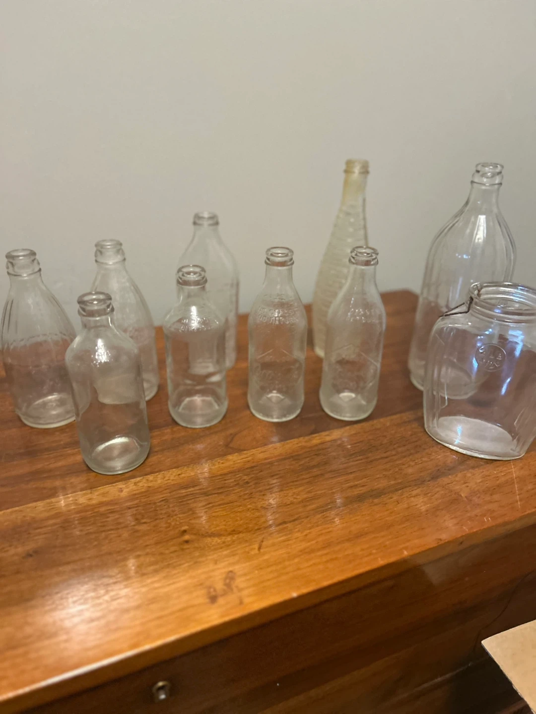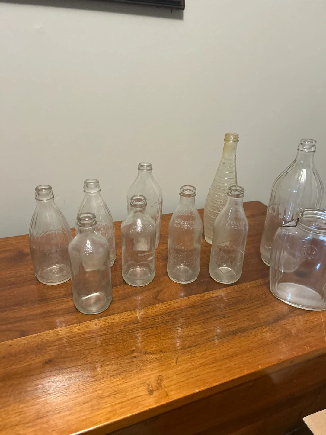 Selling a collection of vintage clear glass bottles. They would be great for decoration or repurposing. There are various sizes and shapes included