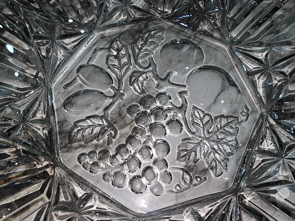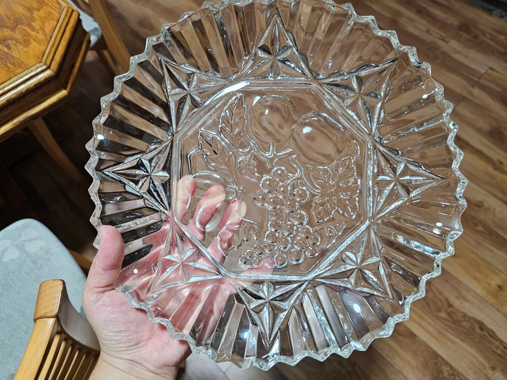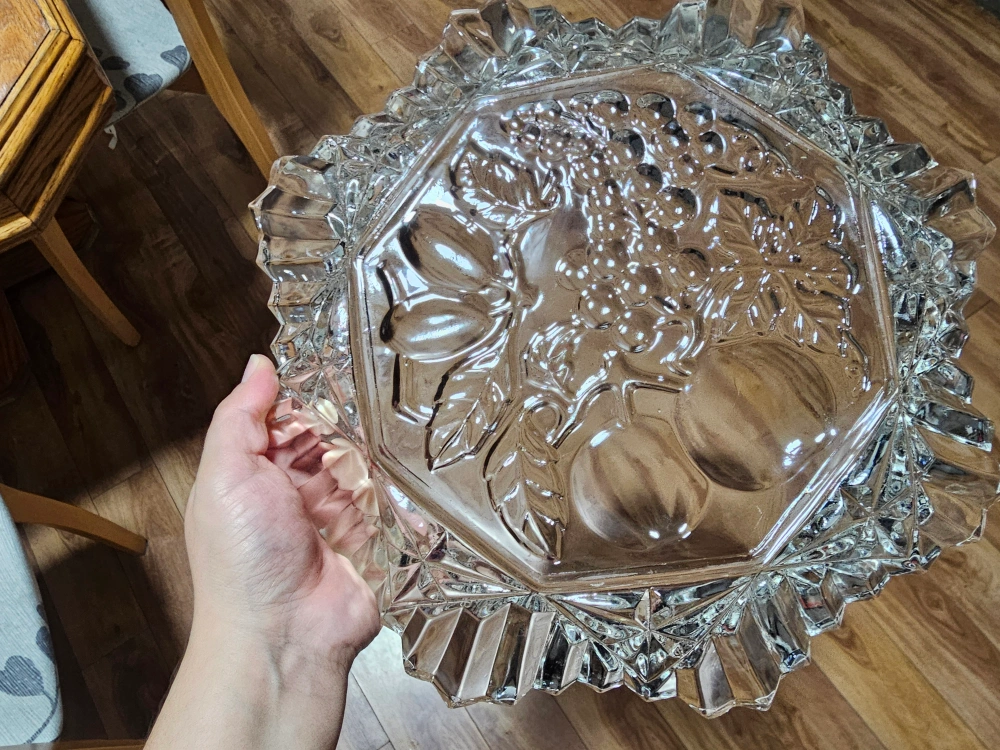 48Here's a lovely vintage clear glass bowl. It features a beautiful fruit design in the centre, including grapes and pears. It would be a great addition to any kitchen or dining room! Pick up Finch, Young area. Only cash