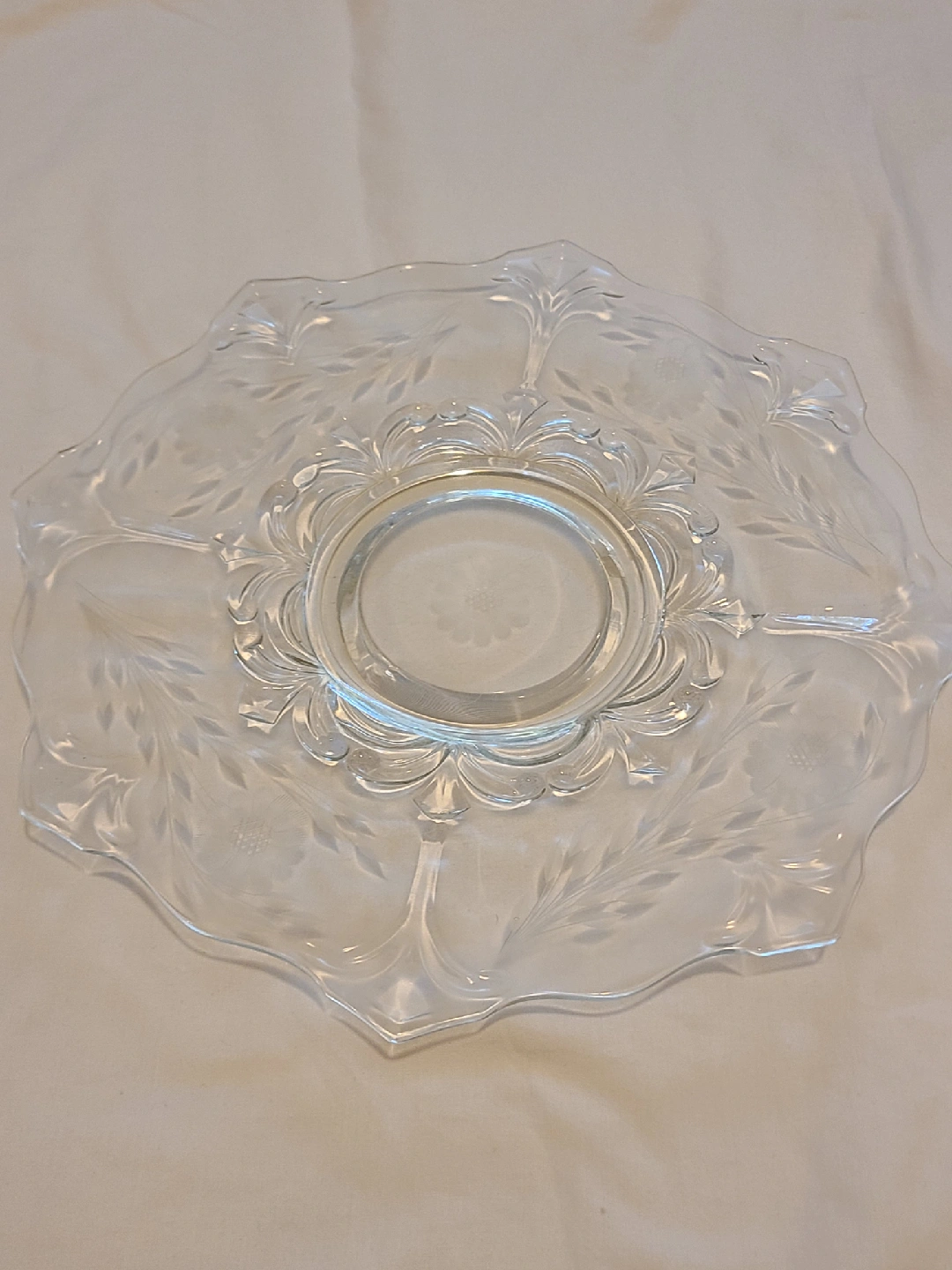 Selling a lovely vintage clear glass serving platter. It features a delicate floral design etched into the glass. Perfect for serving appetizers or desserts at your next gathering! In great condition with no chips or cracks. 37 cm / 14.5" diameter From a pet-free, smoke-free home Porch pickup near Bathurst station
