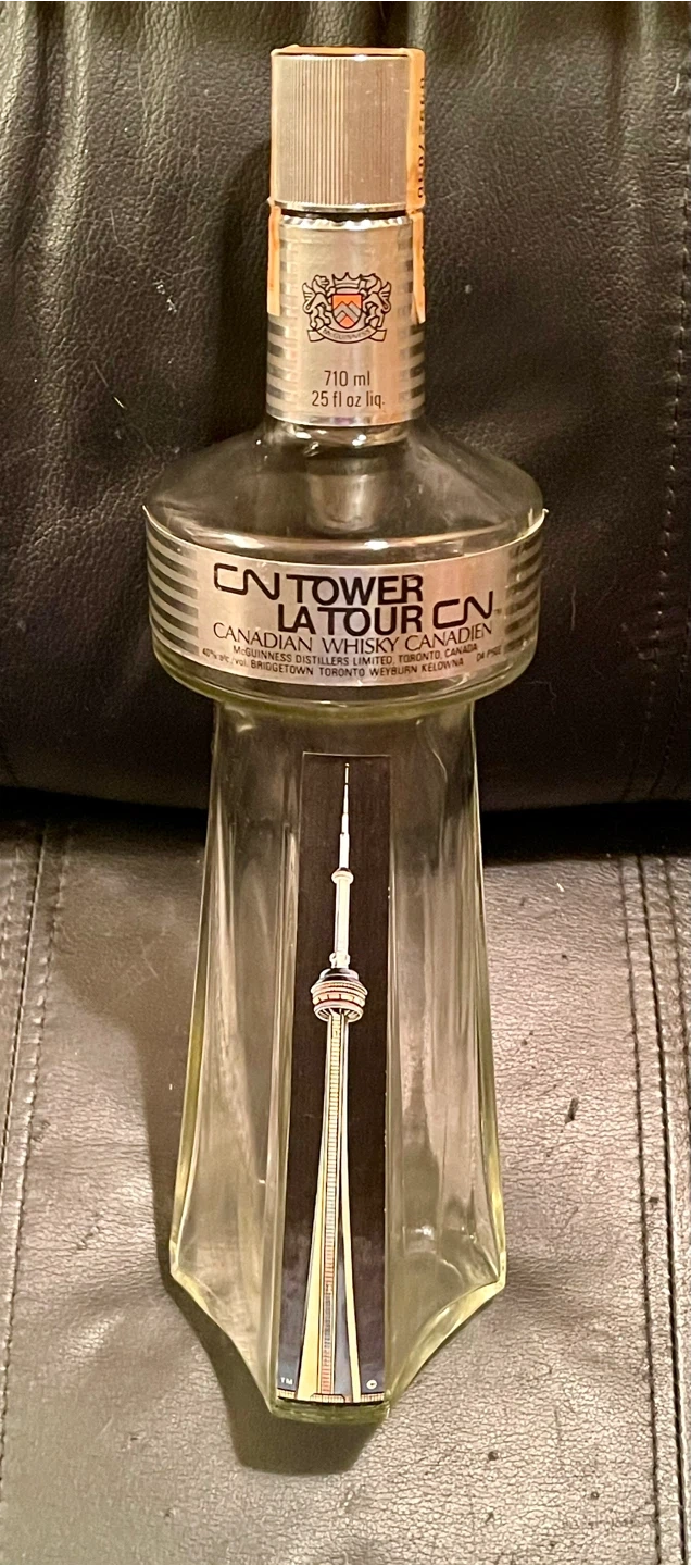 Selling a rare collectible vintage CN Tower La Tour Canadian Whisky bottle. It's a unique piece with the CN Tower design on the bottle itself. The bottle is 710 ml (25 fl oz liq) and is empty. A great collectible item!