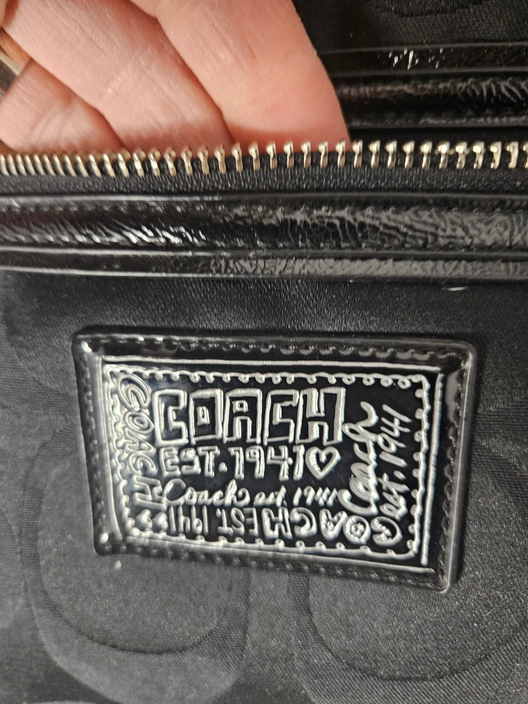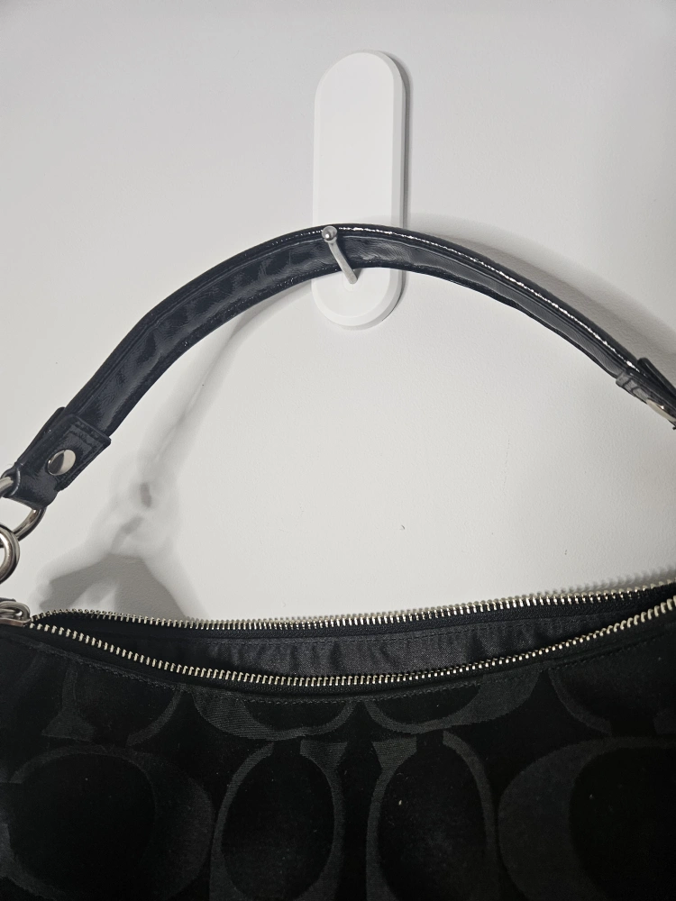 71Selling a new vintage Coach hobo bag in black with the signature Coach pattern. It features a zip-top closure, a front zip pocket with a heart charm, and silver-tone hardware. Perfect for everyday use!