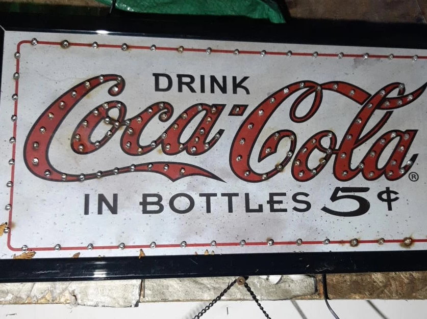 70Selling a vintage Coca-Cola lighted sign that says "DRINK Coca-Cola IN BOTTLES 5¢". It has a black frame and the Coca-Cola logo is in red with small lights around the letters. Great for a retro diner or bar!