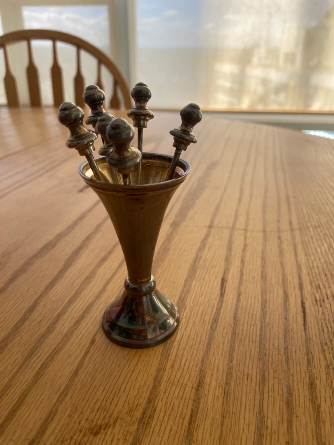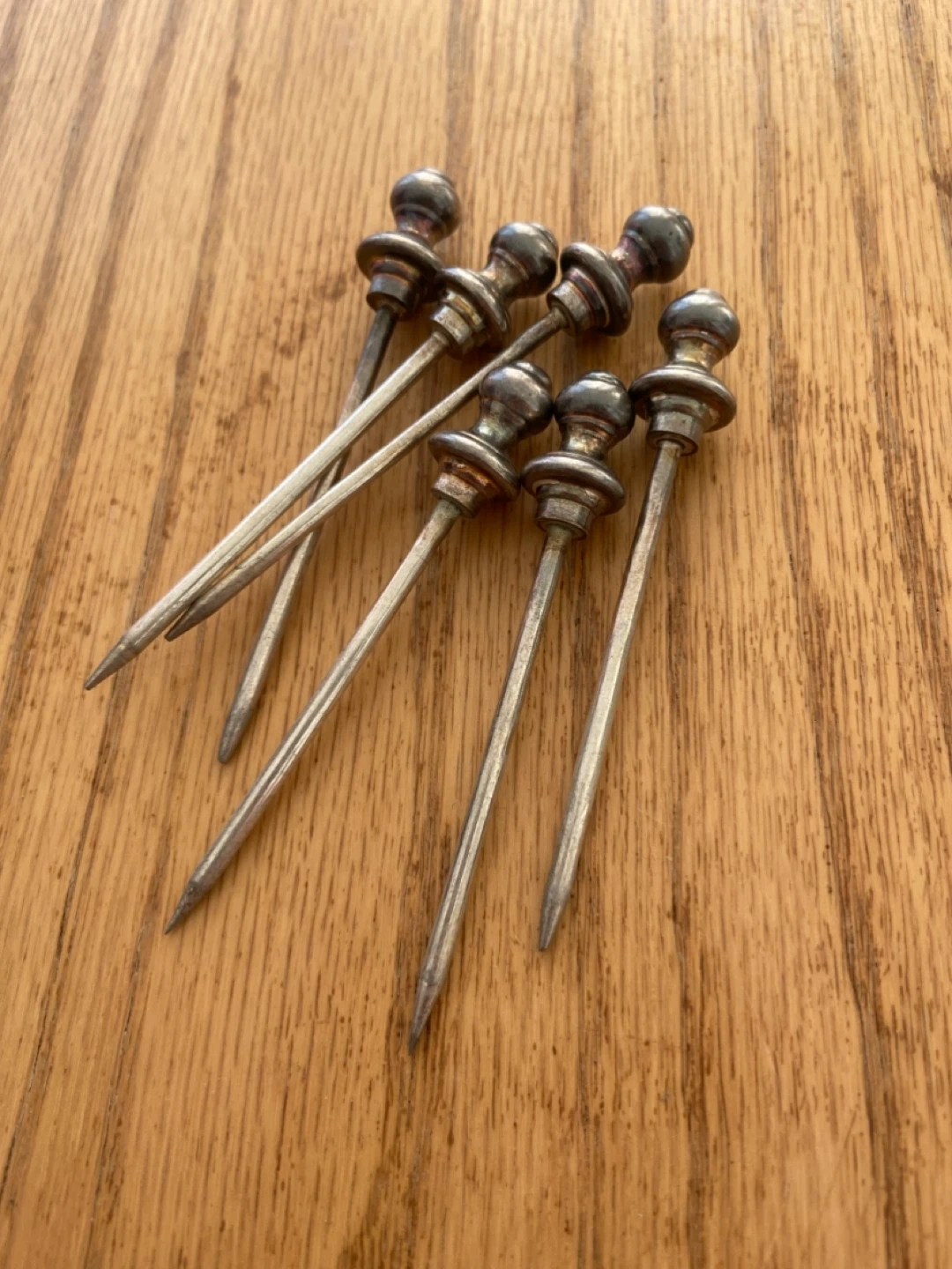 Selling a set of vintage cocktail picks with a matching holder. They have a unique, classic look that would be a great addition to any home bar. The picks are in good condition, perfect for serving olives, cherries, or other garnishes with your drinks!