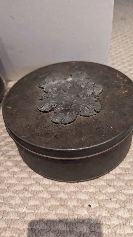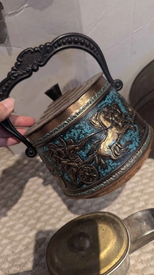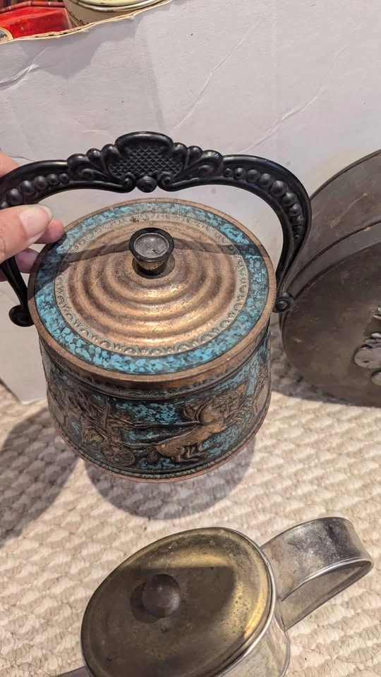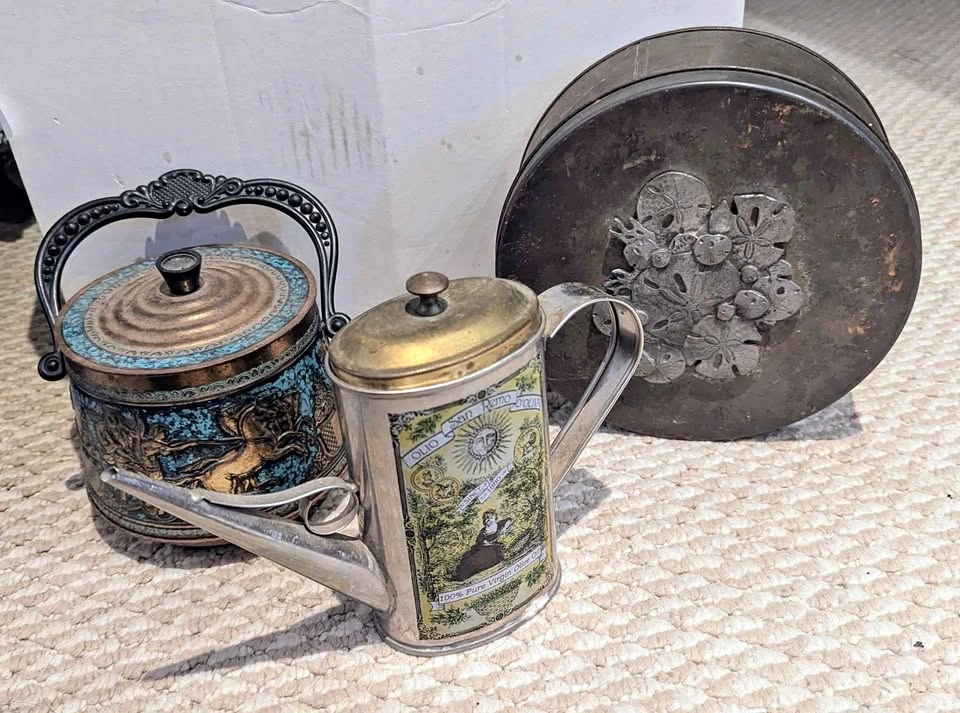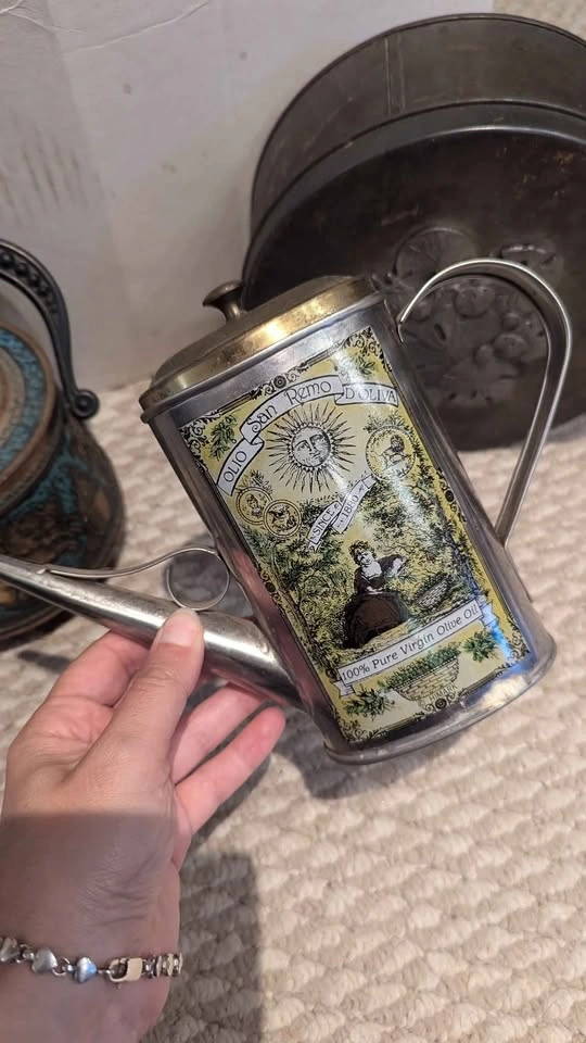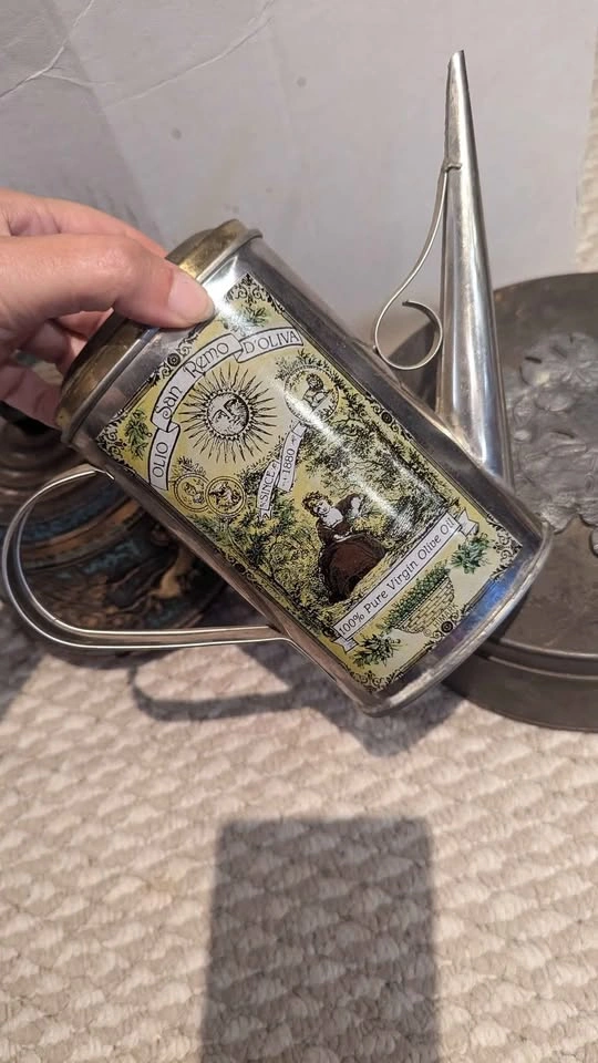 Vintage condition, collectable tins. Price is for all 3, must take all not sold individually. Includes: - a vintage Metzke Pewter Round Tin, from the 70s, featuring a pewter design on the lid. Shows a fair bit of tarnishing on outside - vintage Olio San Remo D'Oliva Olive Oil Can /Pitcher. -vintage biscuit barrel was made in Germany by Hierl-Keller (HK), known for their decorative metalwork and enamel pieces. barrel showcases embossed Greek chariot and warrior scenes in bronze tones set against a vivid turquoise enamel background. maker’s mark on lid (model number 215/2) confirms authenticity. - rare & highly collectable! *Interior shows age-related wear consistent with vintage use