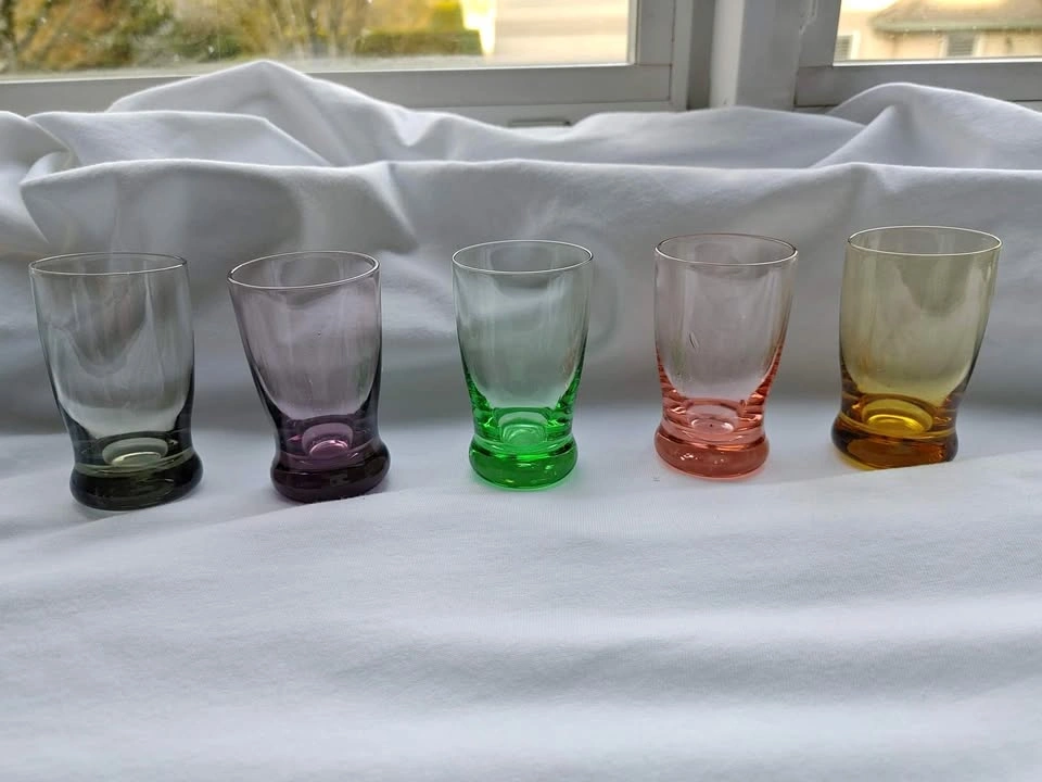 Set of 5 beautiful coloured glasses. Unique gift. Vintage. Great for a Christmas gift. Pencil for size.