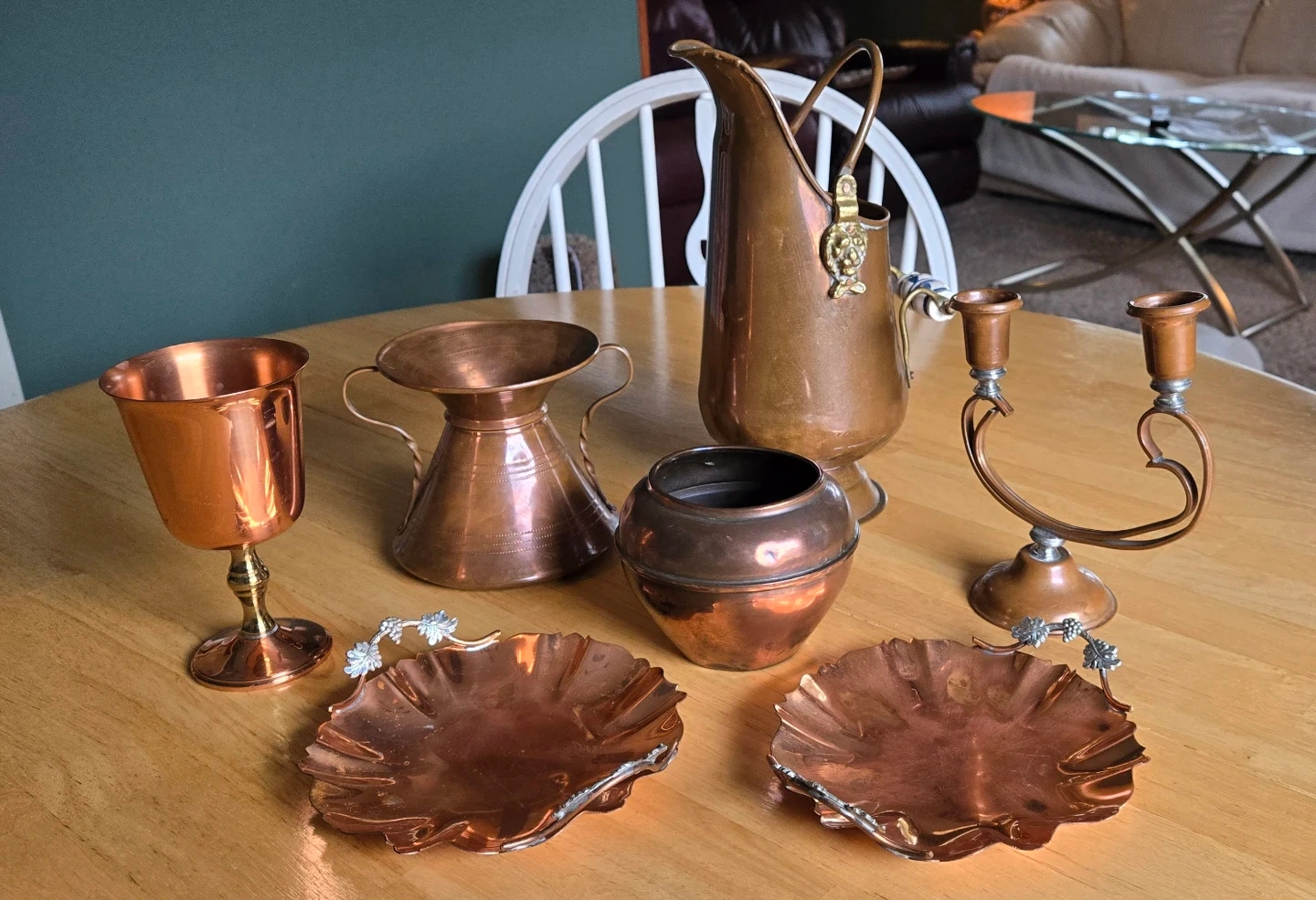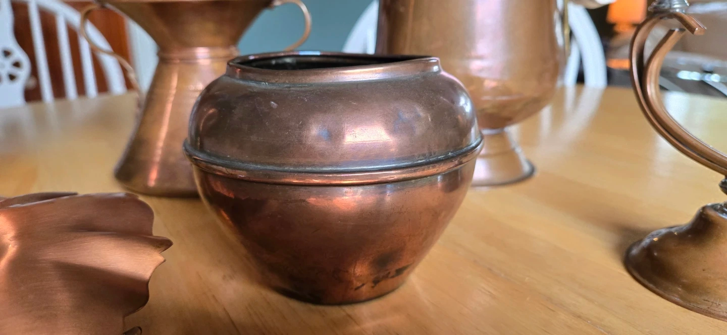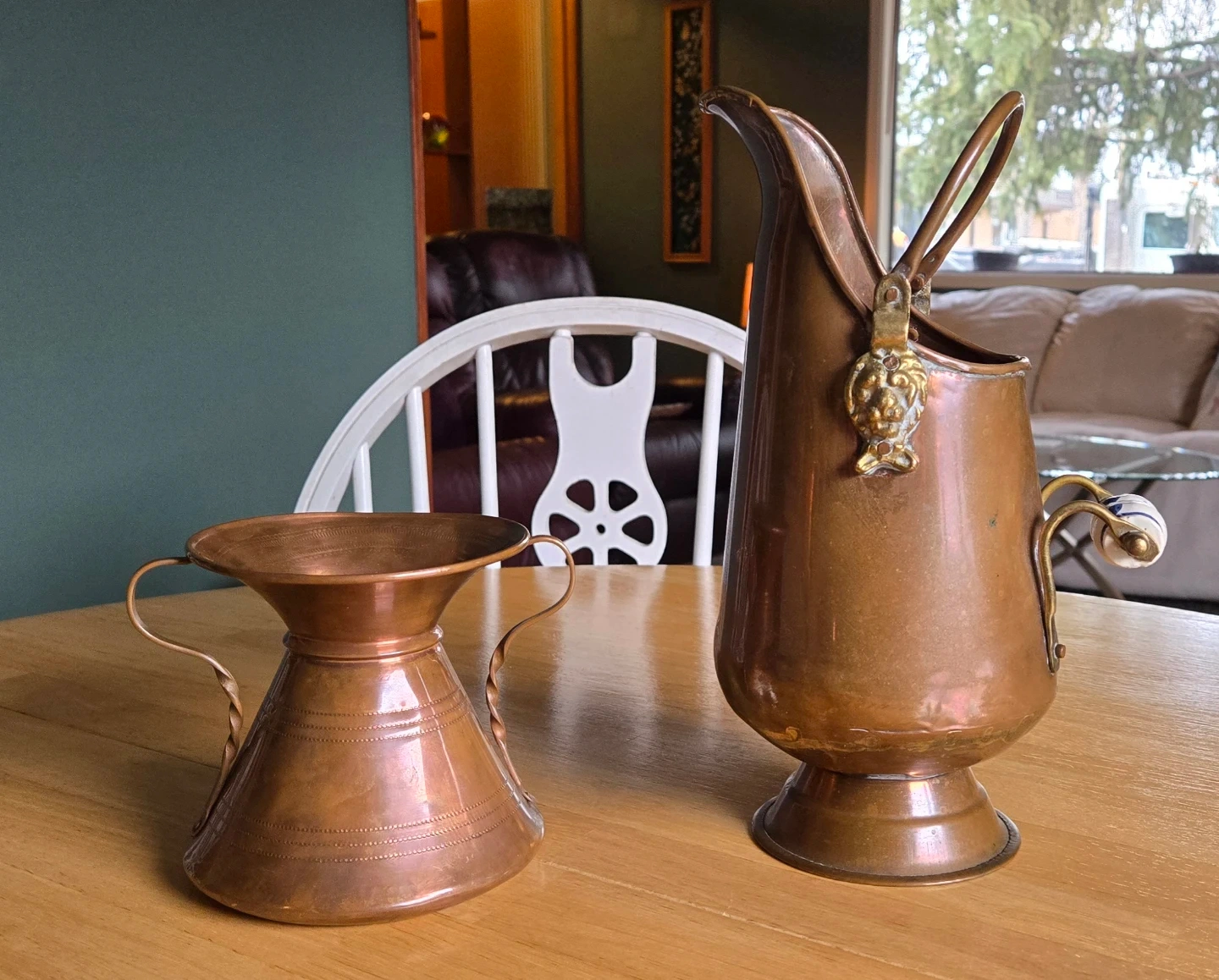 87Group of 7 vintage solid copper items. Most are in really good condition. The small round vessel has some dings. They could use a polish, to really make them shine, unless you prefer the aged patina. The antique coal scuttle alone is being priced online for way more than I'm asking for the entire lot. At least 3 of these items were made in Canada. $50/all. View or pick up in Glenbrook, SW