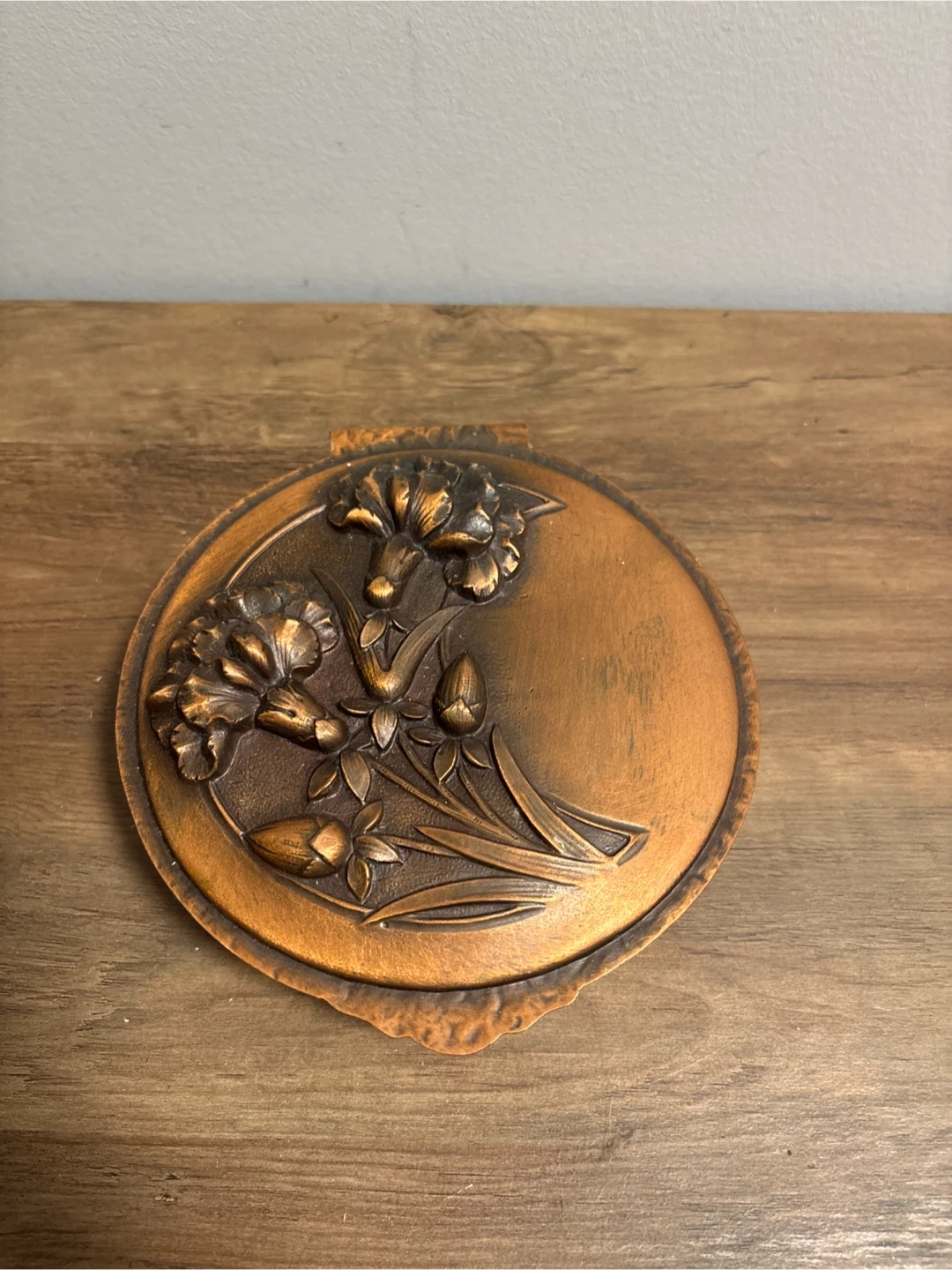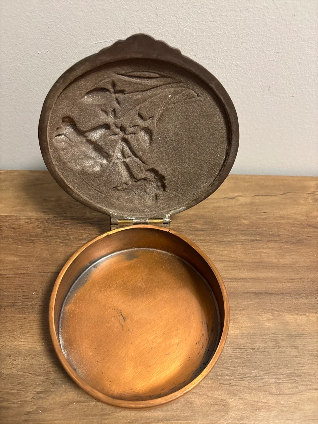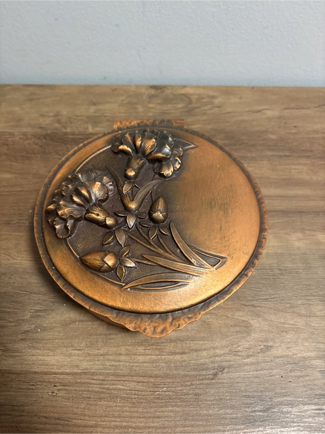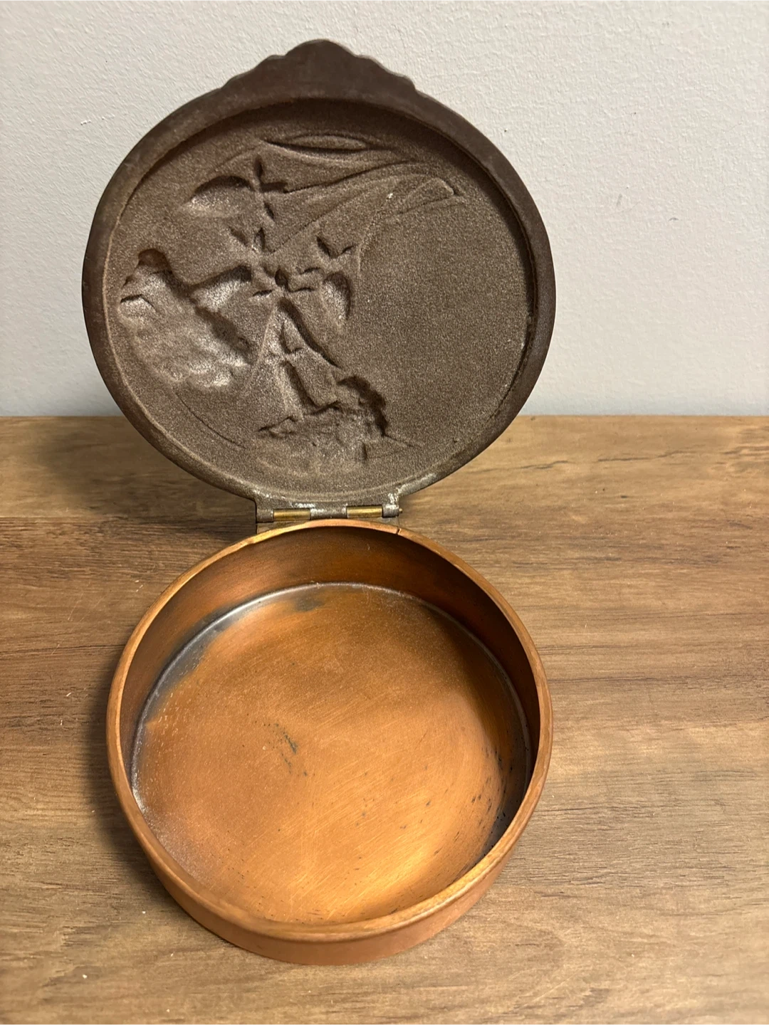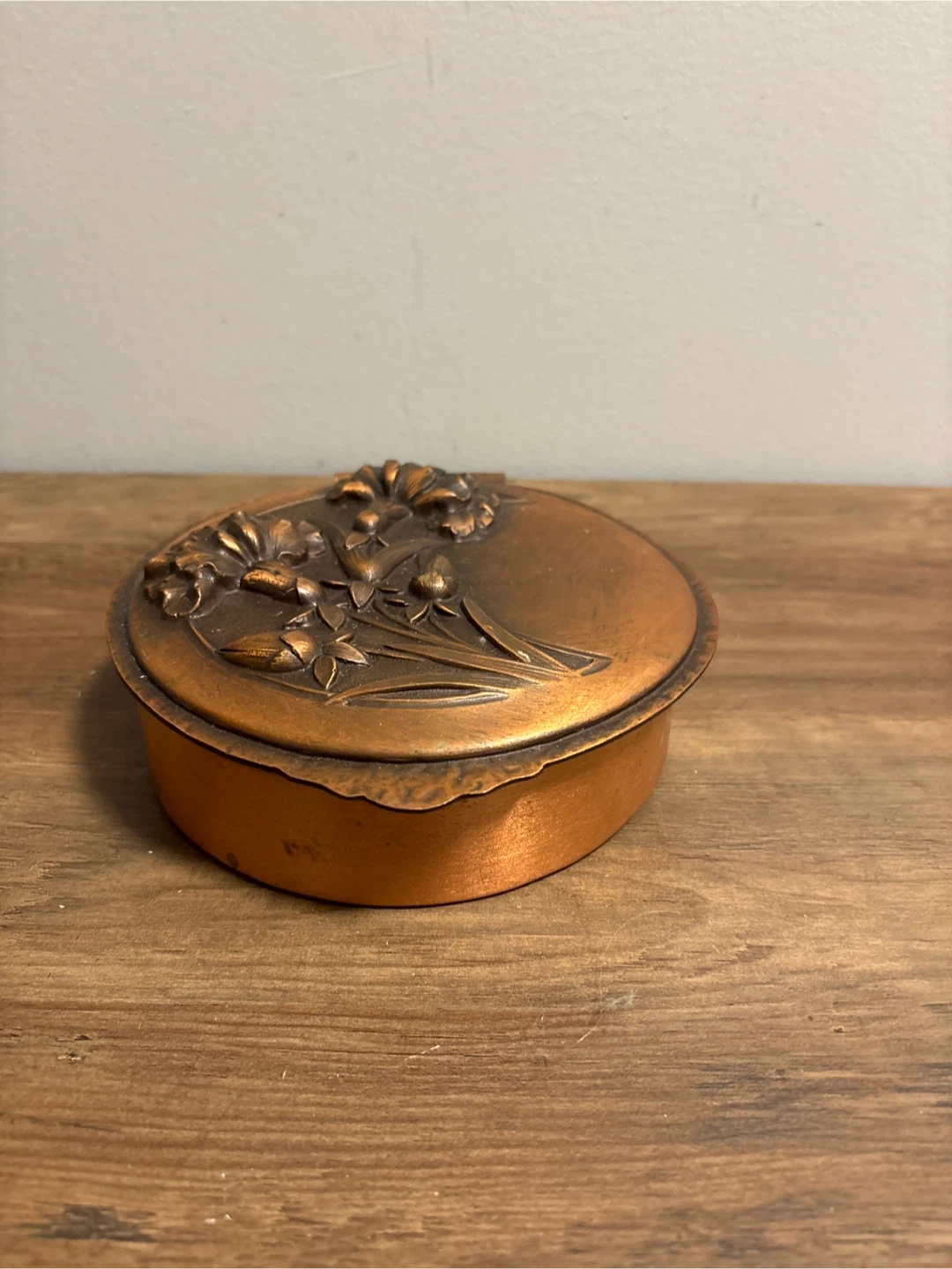 A lovely vintage copper trinket box, perfect for storing small treasures! It features a detailed floral design on the lid and a hinged opening. The interior is also copper-toned. It's in good condition and ready to add a touch of vintage charm to your space. Diameter 6 inches