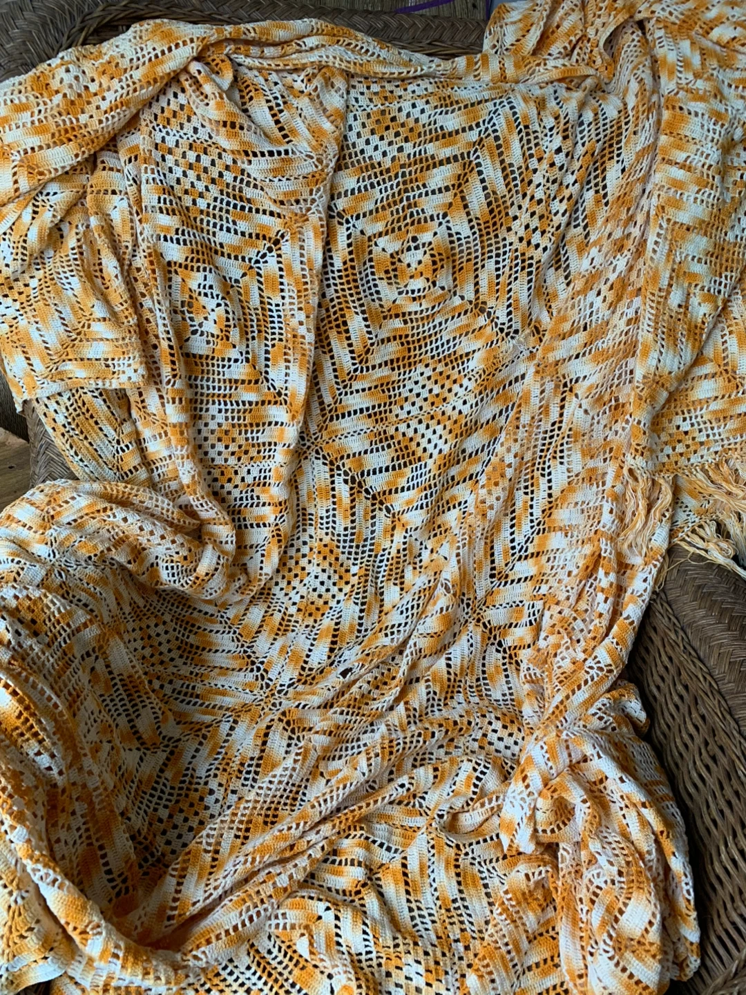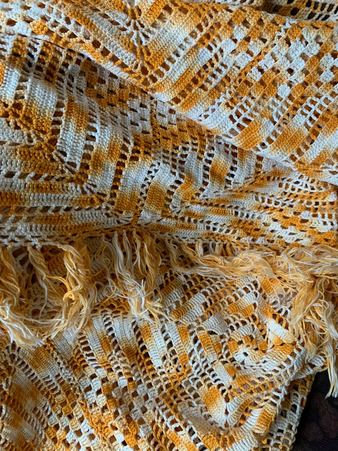 5Selling a lovely vintage crochet blanket! Handmade by Great Grandma. It features a beautiful geometric pattern in orange and white. Perfect for adding a cozy touch to any room. Needs some touch ups. King size.