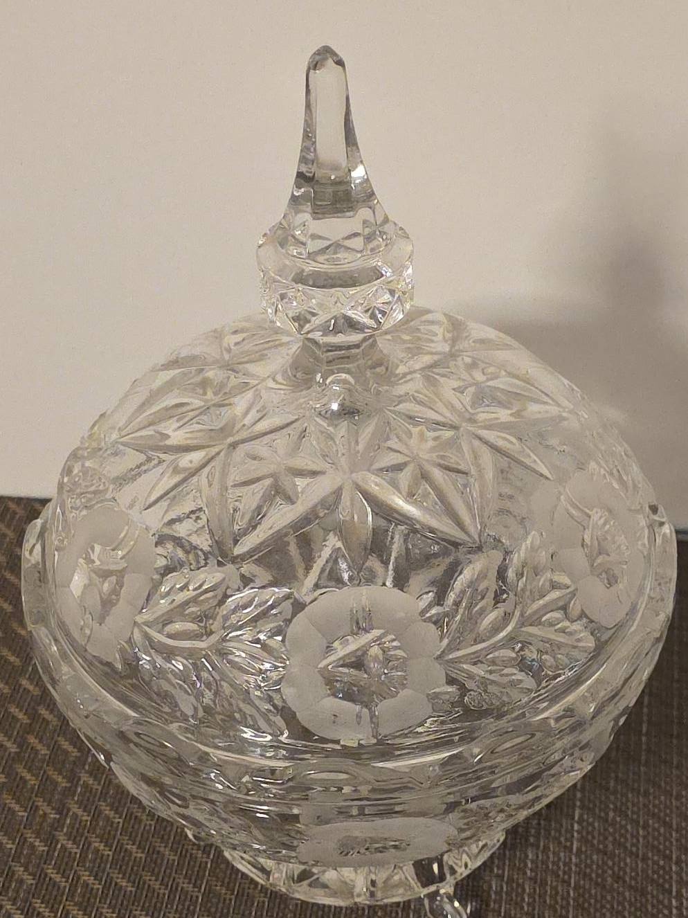 10Selling a lovely vintage crystal candy dish with a lid. It features a beautiful floral design and a classic shape. Perfect for adding a touch of elegance to your home decor or for serving treats to guests