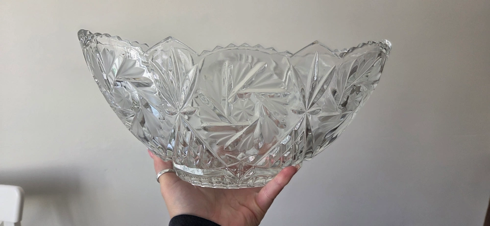 Selling a beautiful vintage crystal glass bowl! It measures approximately 14 inches in length and about 6 inches in height. This piece would make a lovely addition to any home. Great for salads, or decor.
