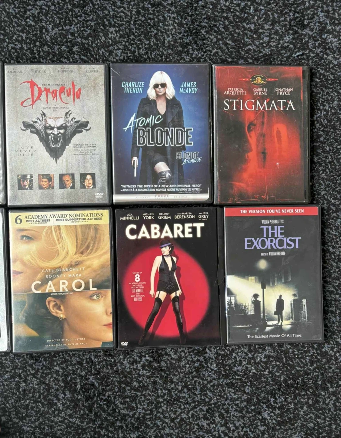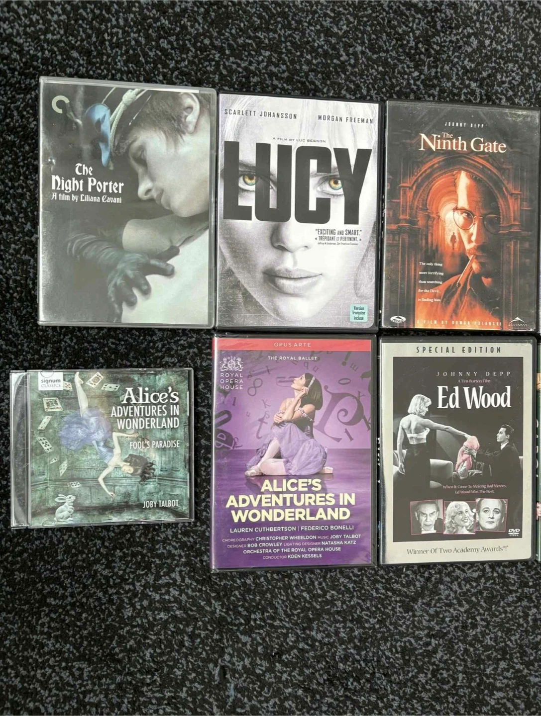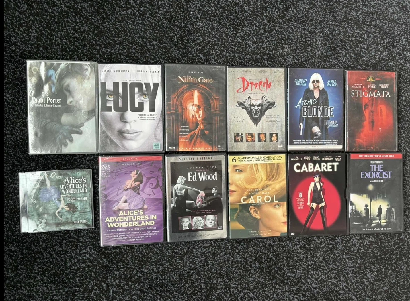 126Condition: All discs included and in good condition (see photos). Some cases show light wear. Pickup: North York / Toronto Selling my personal DVD collection — a mix of cult classics, psychological dramas, gothic horror, and art films. You can buy individually or as a bundle (discount if you take all). ⸻ 💿 Titles Available: 1. The Night Porter – Criterion Collection 2. Lucy – Scarlett Johansson, Morgan Freeman 3. The Ninth Gate – Johnny Depp 4. Bram Stoker’s Dracula – Gary Oldman, Winona Ryder 5. Atomic Blonde – Charlize Theron 6. Stigmata – Patricia Arquette 7. Carol – Cate Blanchett, Rooney Mara 8. Cabaret – Liza Minnelli 9. The Exorcist – Special Edition 10. Ed Wood – Johnny Depp (2-time Oscar winner) 11. Alice’s Adventures in Wonderland – Royal Ballet (DVD) 12. Alice’s Adventures in Wonderland: Fool’s Paradise – Joby Talbot (CD) ⸻ Pricing: 💰 $5 each 💰 or $45 for the full lot