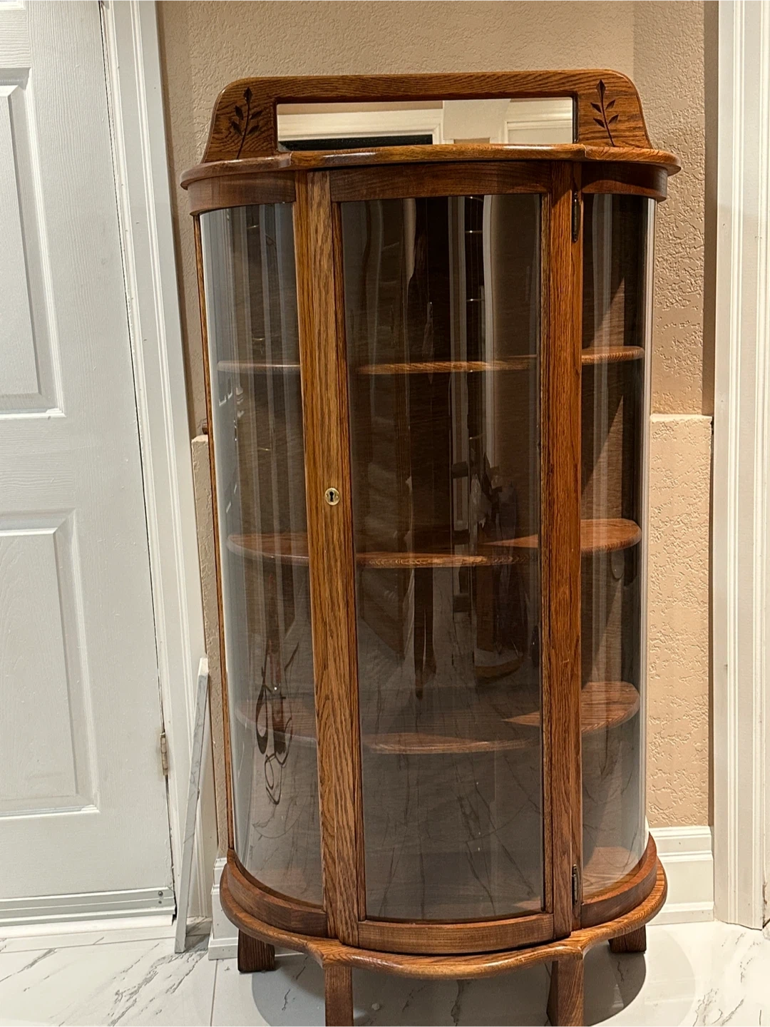 20Beautiful vintage solid wood display cabinet with curved glass front and sides. Features detailed wood carving on the top, five shelves, and a locking glass door (key included). Excellent for displaying collectibles, china, or decor. • Excellent vintage condition • Curved glass panels in perfect shape (no cracks or chips) • Solid wood frame with a warm oak finish