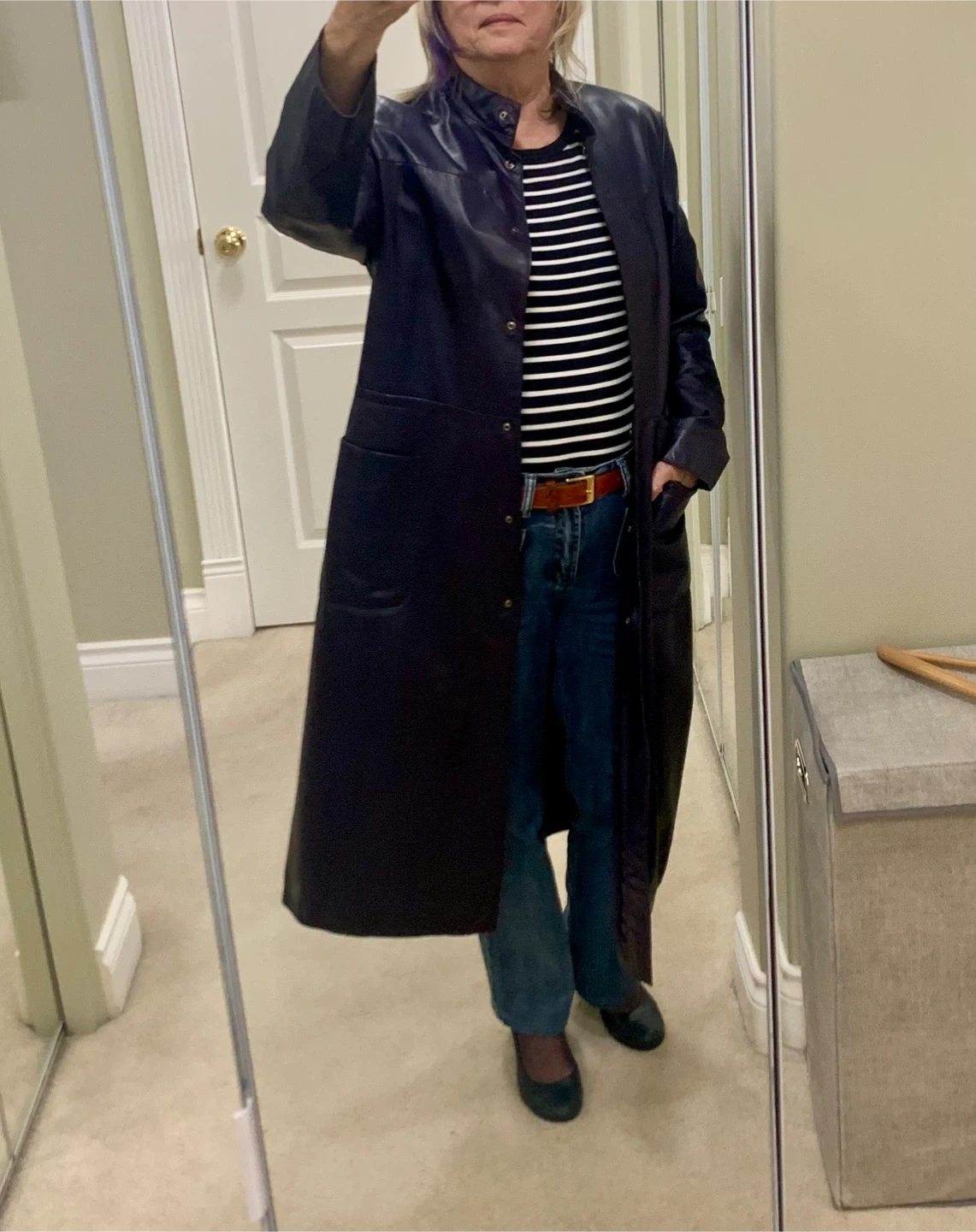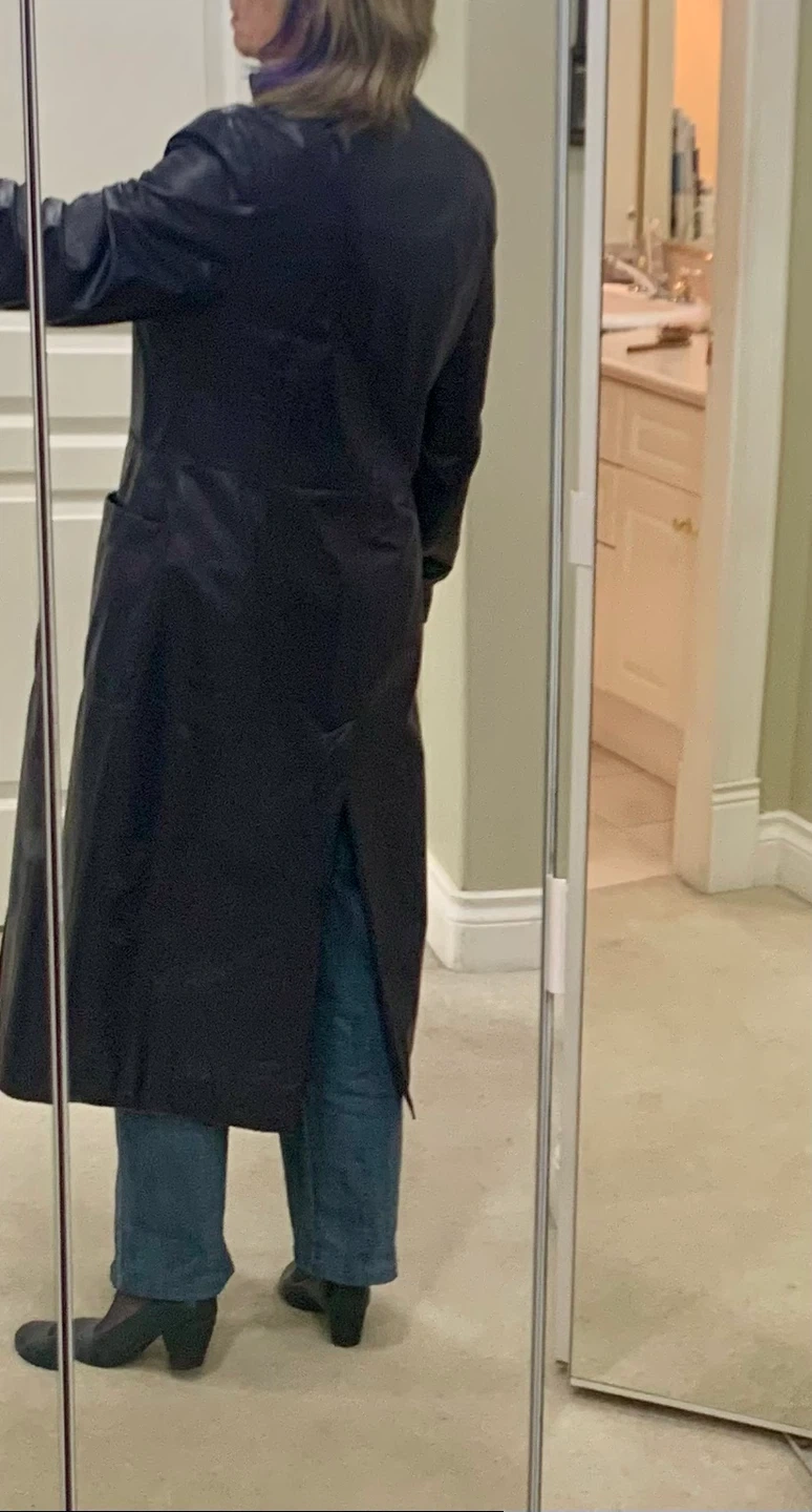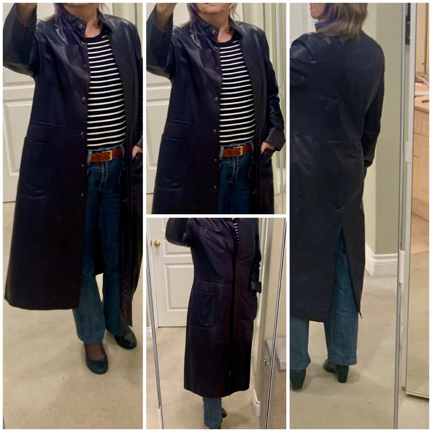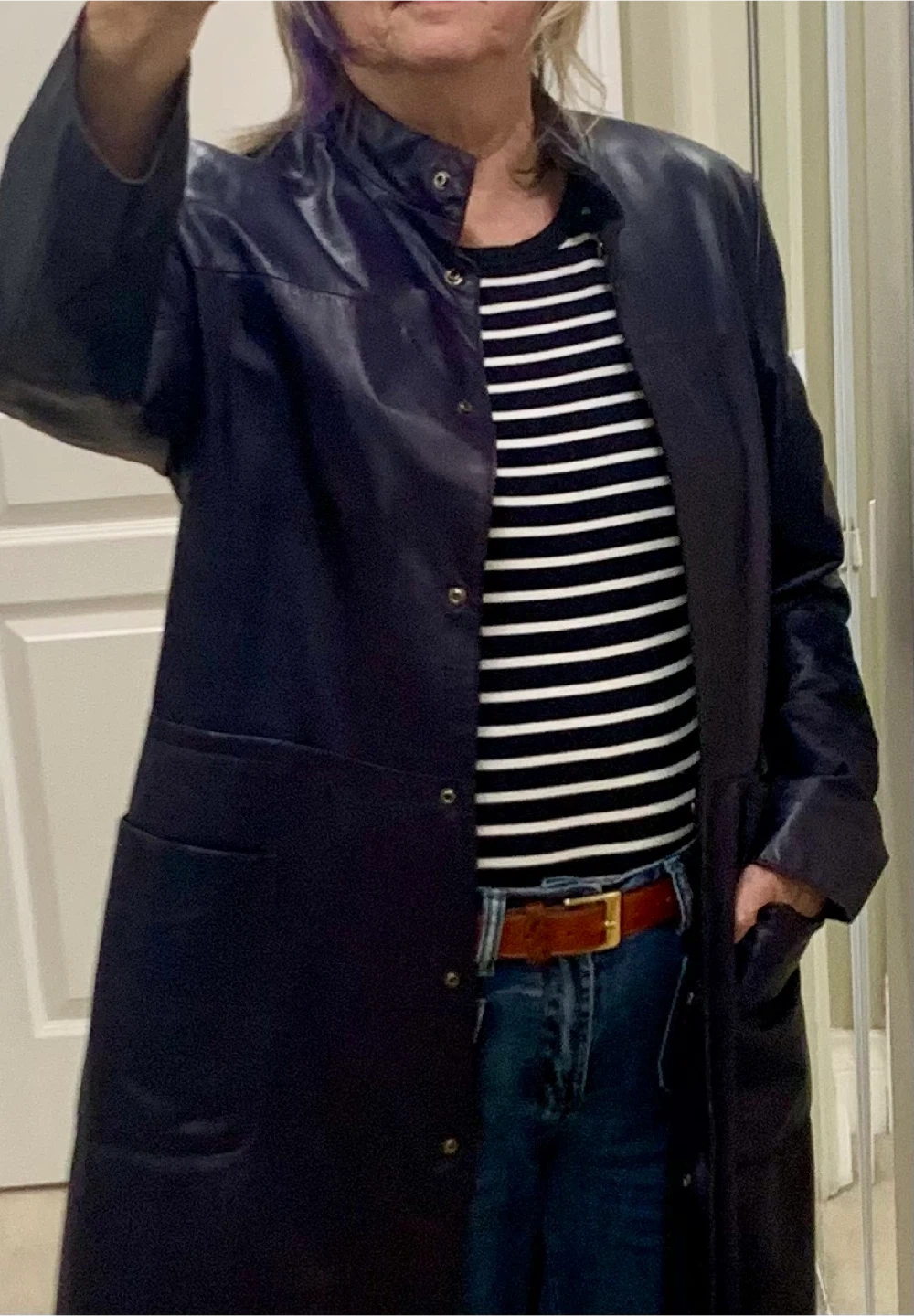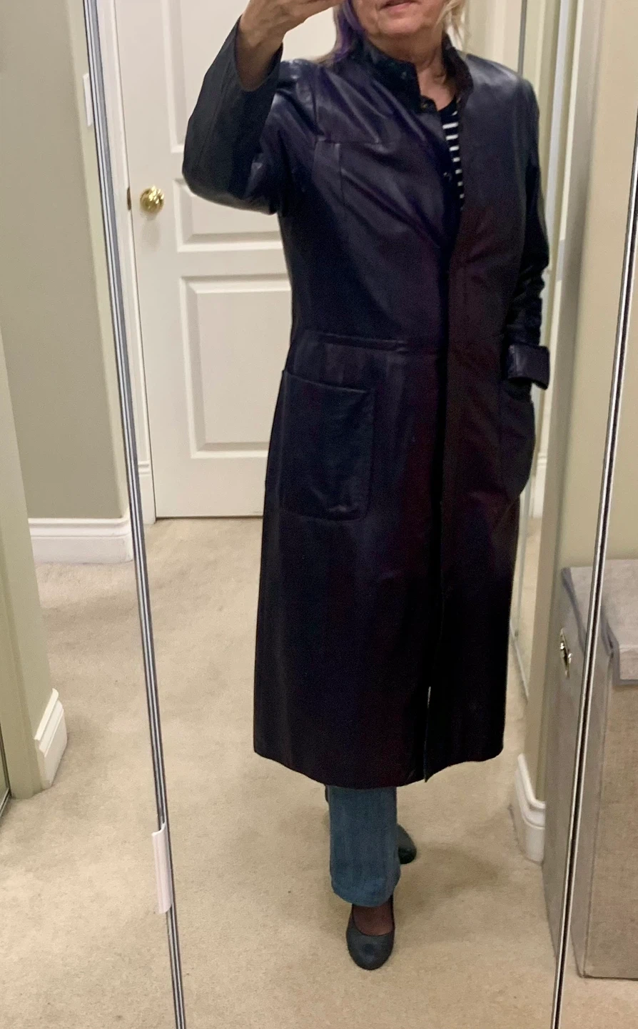 158Selling a Vintage Danier Canada leather coat in size 10. Dark purple in colour. It's in good condition and has a stylish, long design. Has great pockets. Perfect for adding a touch of elegance to your wardrobe!