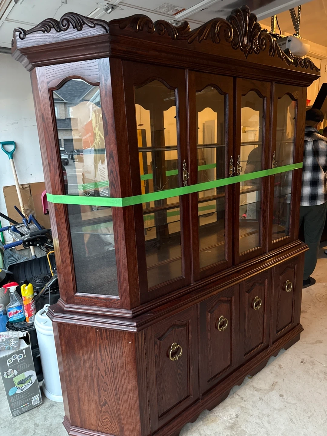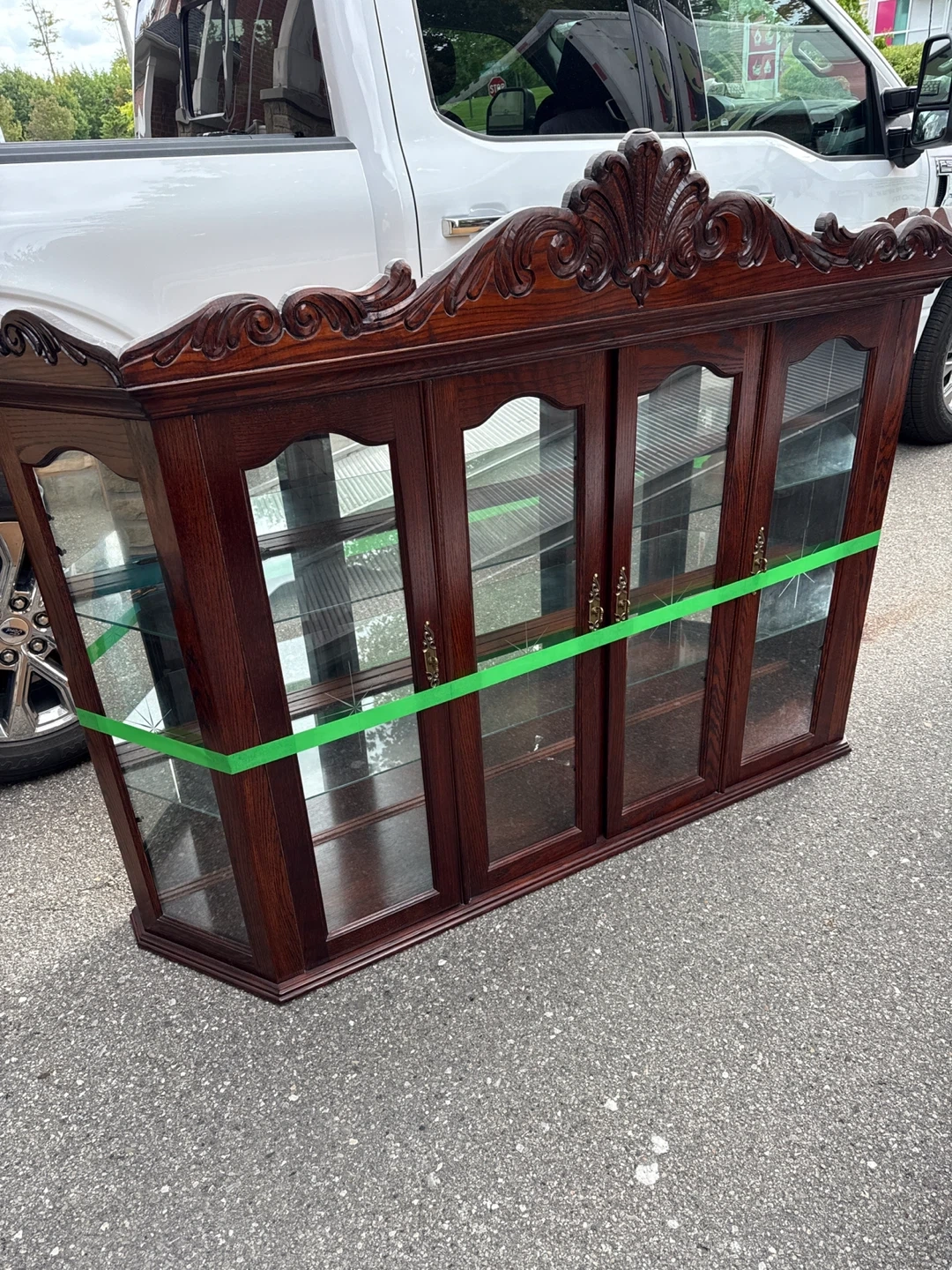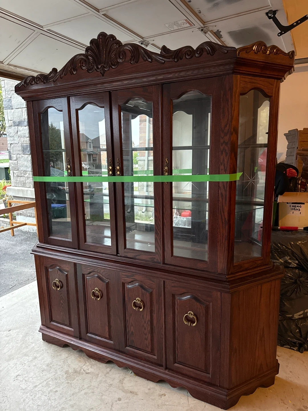 Selling a beautiful vintage china cabinet! It's made of dark wood with glass doors on top and wooden doors on the bottom. It has a classic design and would look great in a dining room or living room. It's in good condition and ready for a new home Pick-up only, no delivery