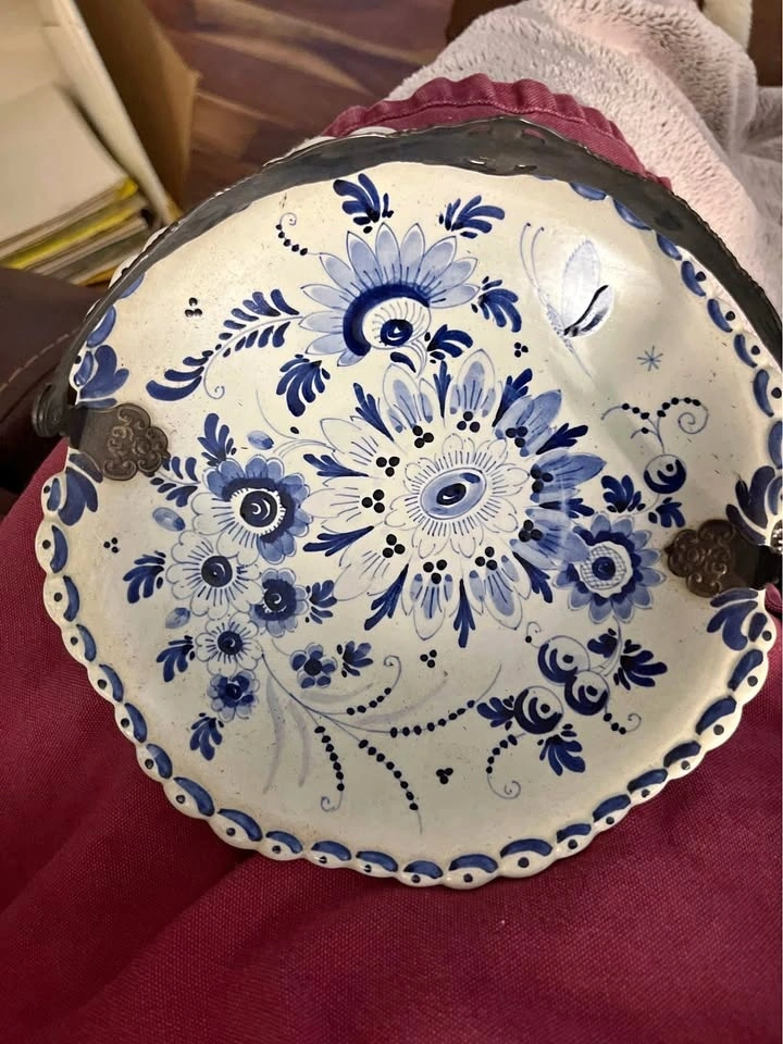 10Beautiful hand-painted Delft blue floral dish from Schoonhoven, Holland, featuring classic cobalt blue designs on a cream base. Scalloped edges and an ornate metal handle add extra charm — perfect for serving, display, or as a collectible Delftware accent. Details: Marked: 1635 Delft PS Schoonhoven, Made in Holland. Authentic hand-painted Dutch Delftware Material: Ceramic with silver handle Condition: Excellent vintage condition (no cracks or chips) Approx. value: $75–$120 CAD ✨ Ideal for collectors, European décor lovers, or anyone who appreciates Dutch craftsmanship.