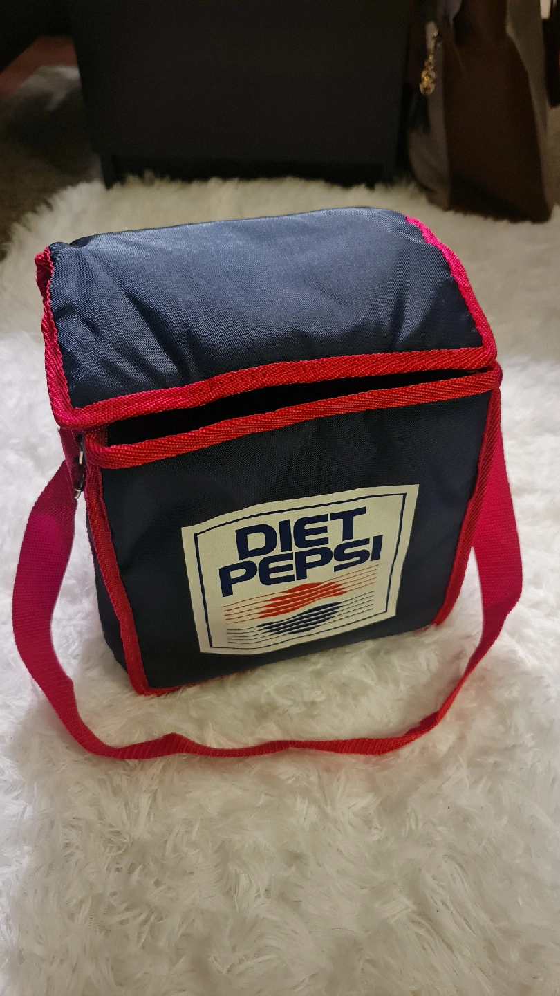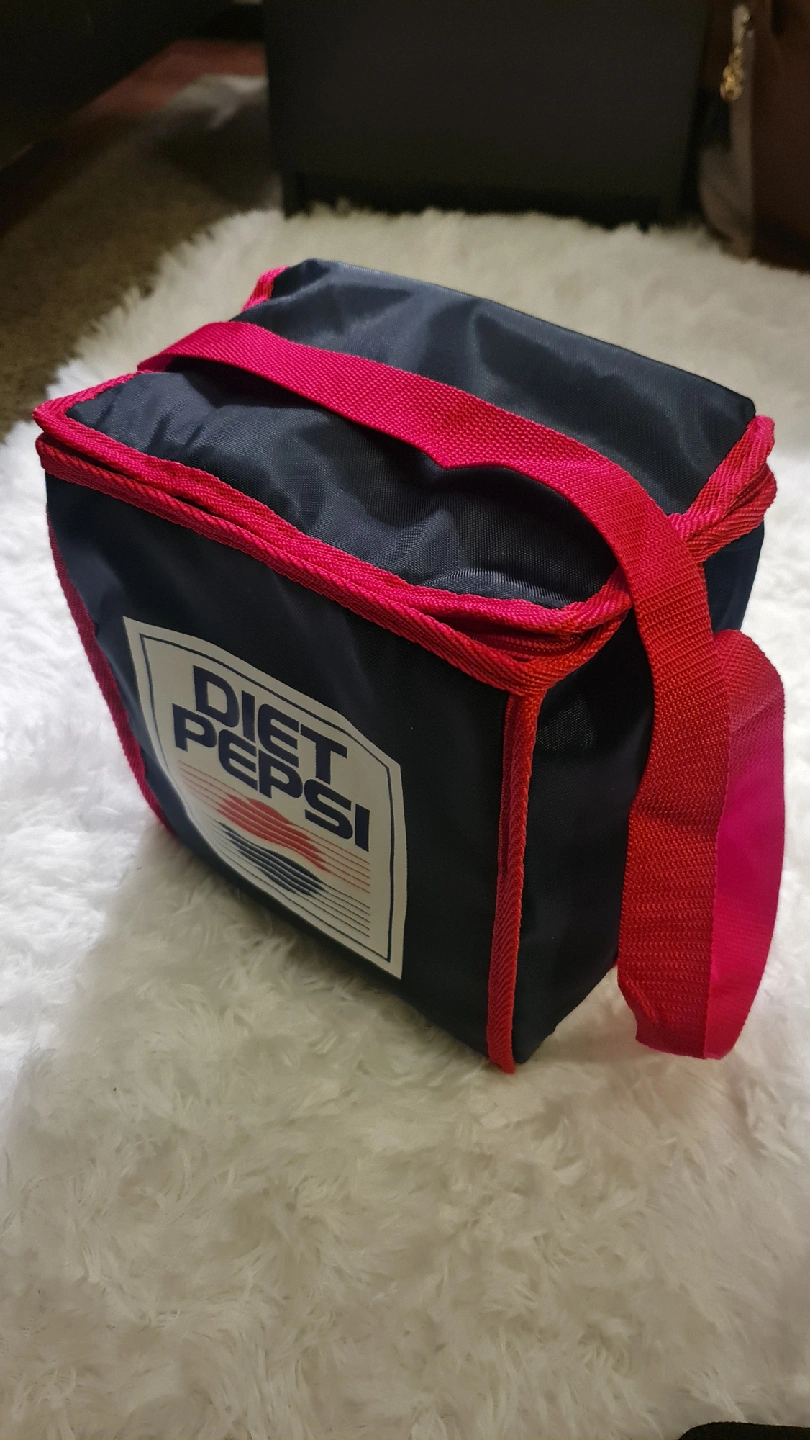 86Insulated "Diet Pepsi" lunch bag. Great for lunch and picnics. Vibrant red trim and a comfortable carrying strap. In good shape and ready for a new home.